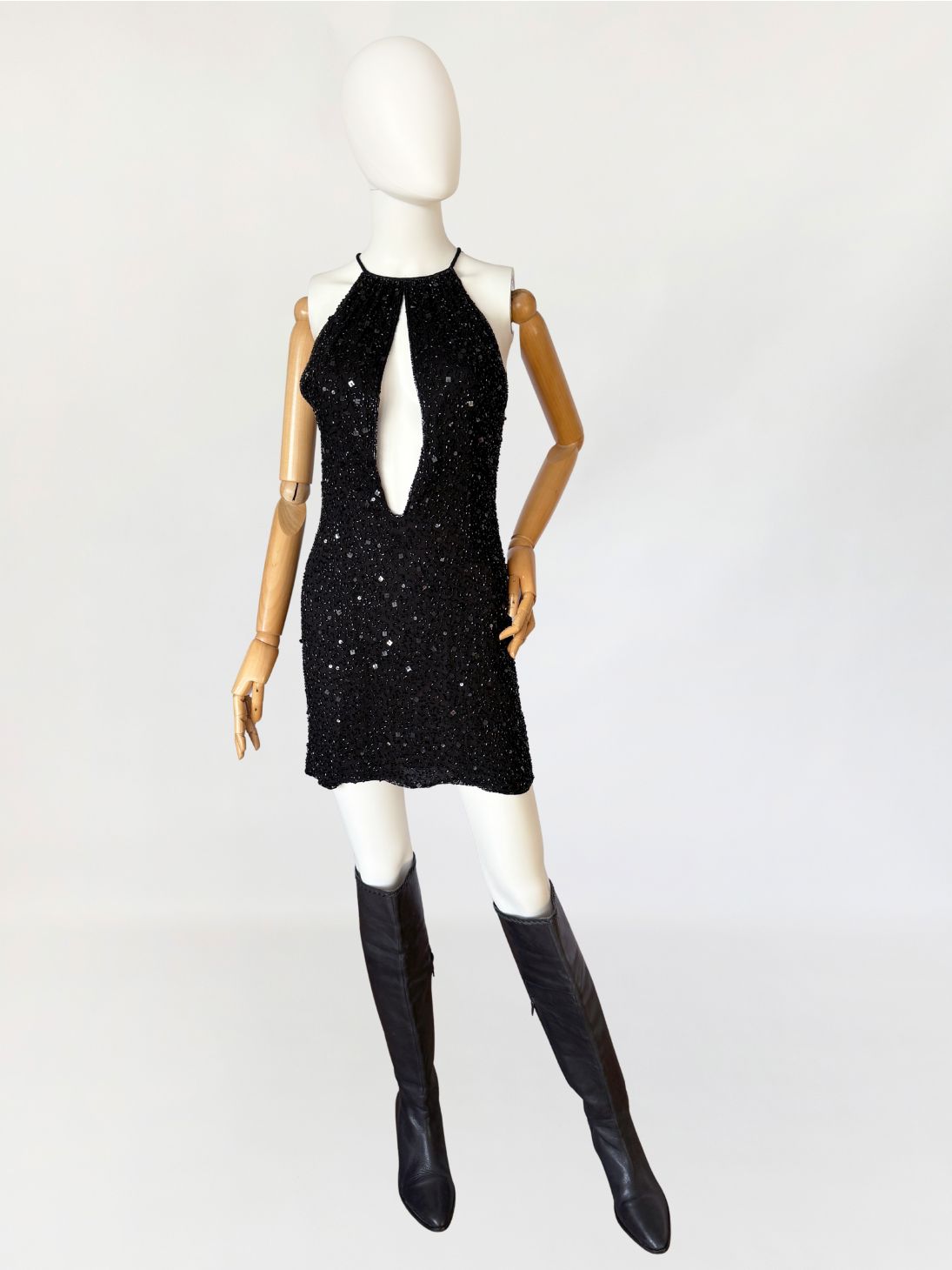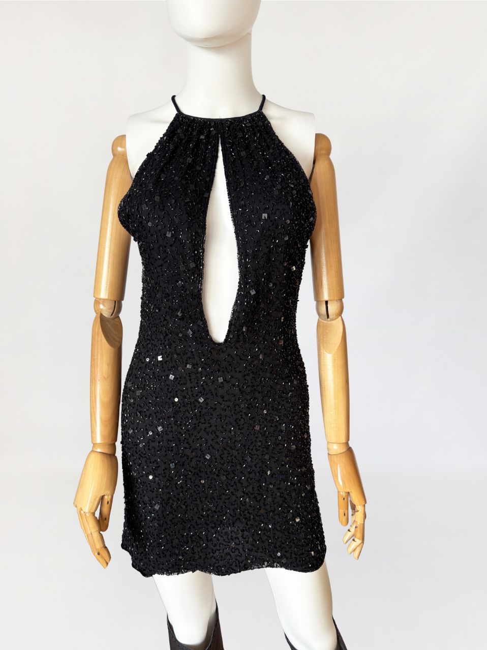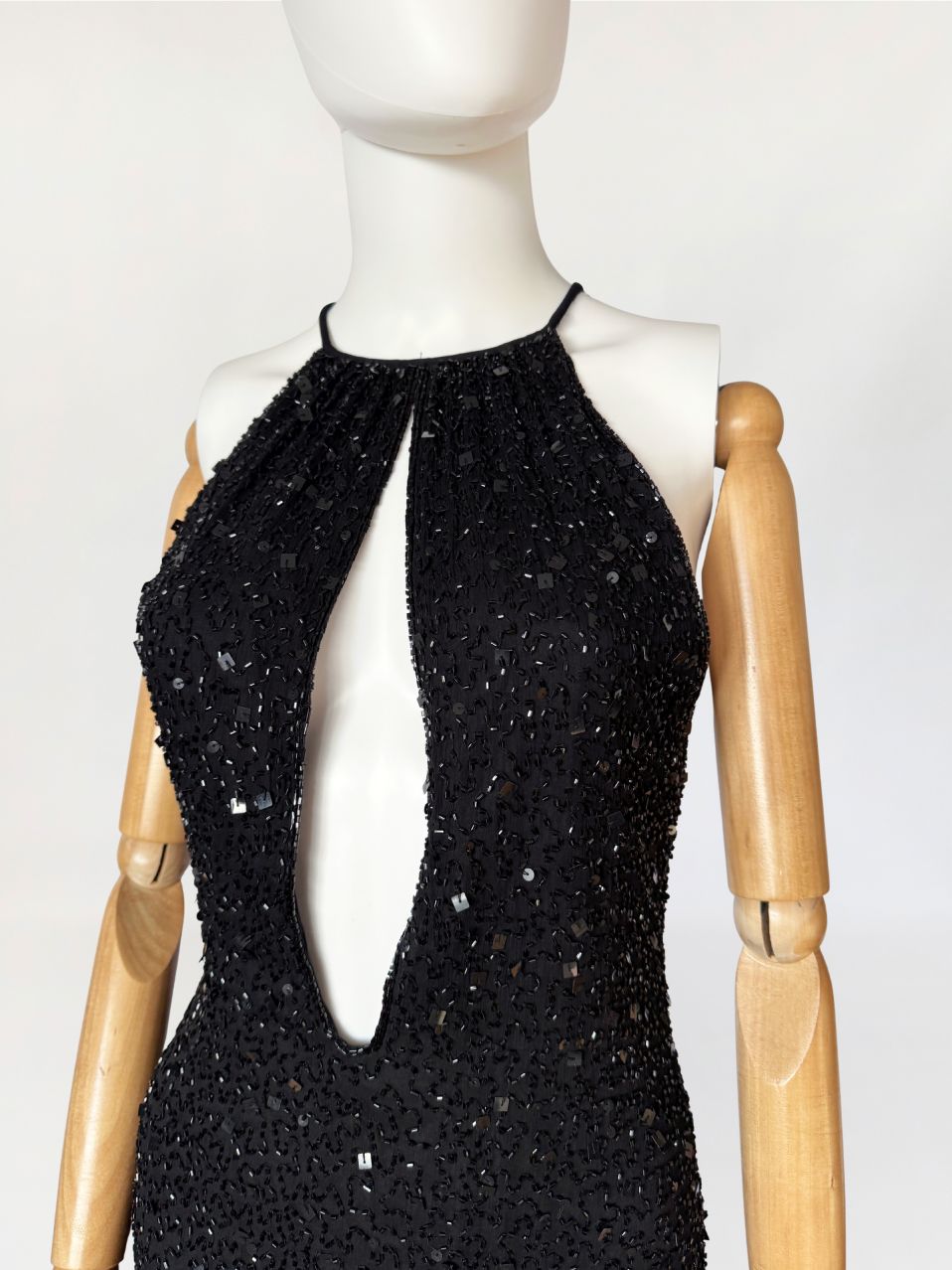 Sukienka mini marki Celyn B z portfolio Elisabetty Franchi. Krótki model o dopasowanym kroju, bez rękawów, z wyraźnie zaznaczoną linią talii. Góra w formie halter neckline, z cienkimi ramiączkami. Front z głębokim, pionowym wycięciem typu keyhole, precyzyjnie wkomponowanym w konstrukcję. Całość gęsto pokryta ręcznie wyszywanymi biżuteryjnymi aplikacjami z koralików. Tył z centralnym szwem konstrukcyjnym oraz krótkim pęknięciem pod karkiem, zapinanym na drobny guzik.