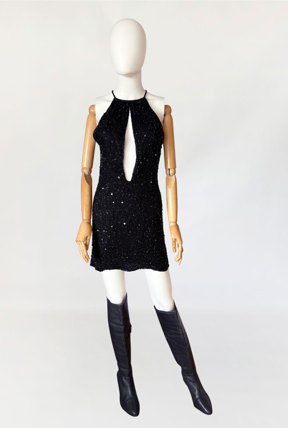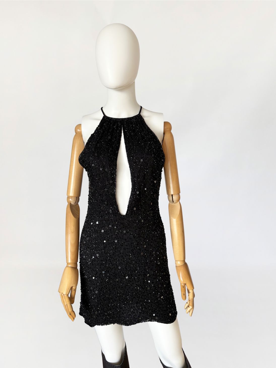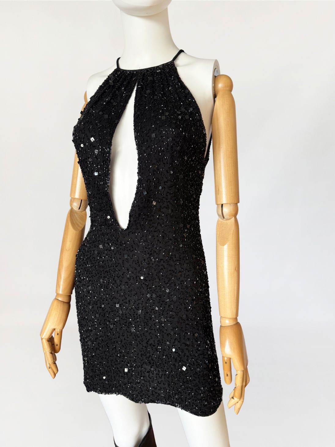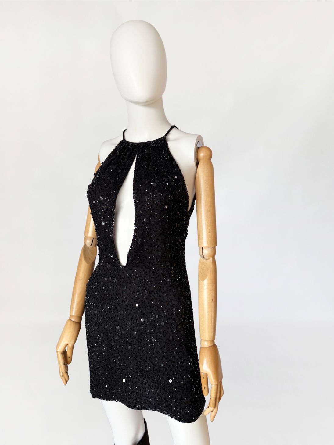 Sukienka mini marki Celyn B z portfolio Elisabetty Franchi. Krótki model o dopasowanym kroju, bez rękawów, z wyraźnie zaznaczoną linią talii. Góra w formie halter neckline, z cienkimi ramiączkami. Front z głębokim, pionowym wycięciem typu keyhole, precyzyjnie wkomponowanym w konstrukcję. Całość gęsto pokryta ręcznie wyszywanymi biżuteryjnymi aplikacjami z koralików. Tył z centralnym szwem konstrukcyjnym oraz krótkim pęknięciem pod karkiem, zapinanym na drobny guzik.