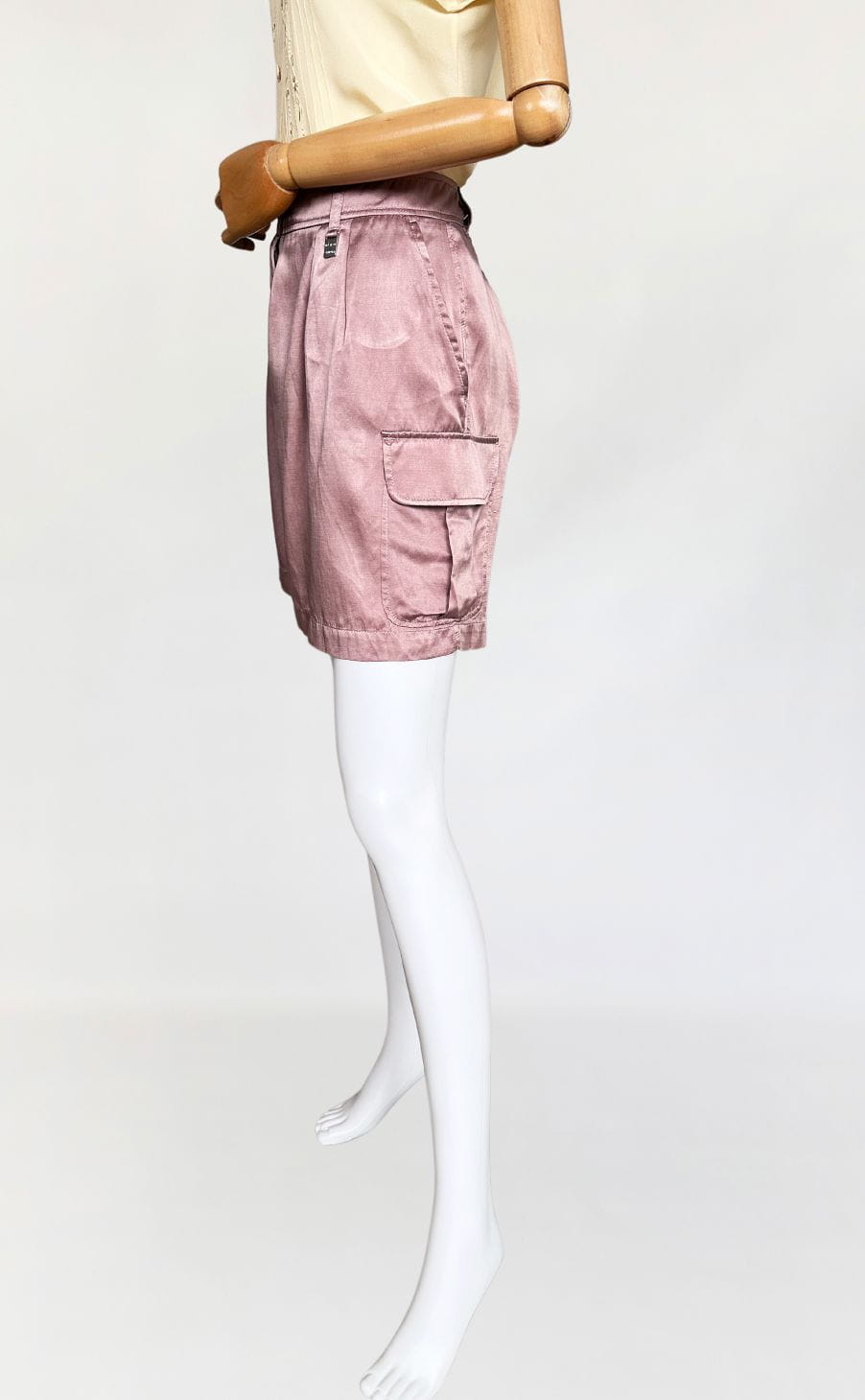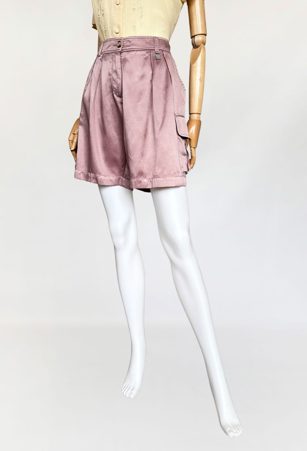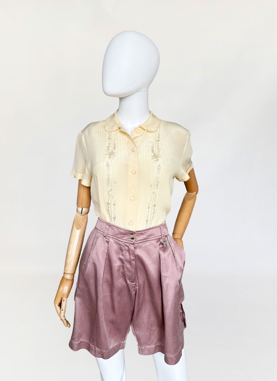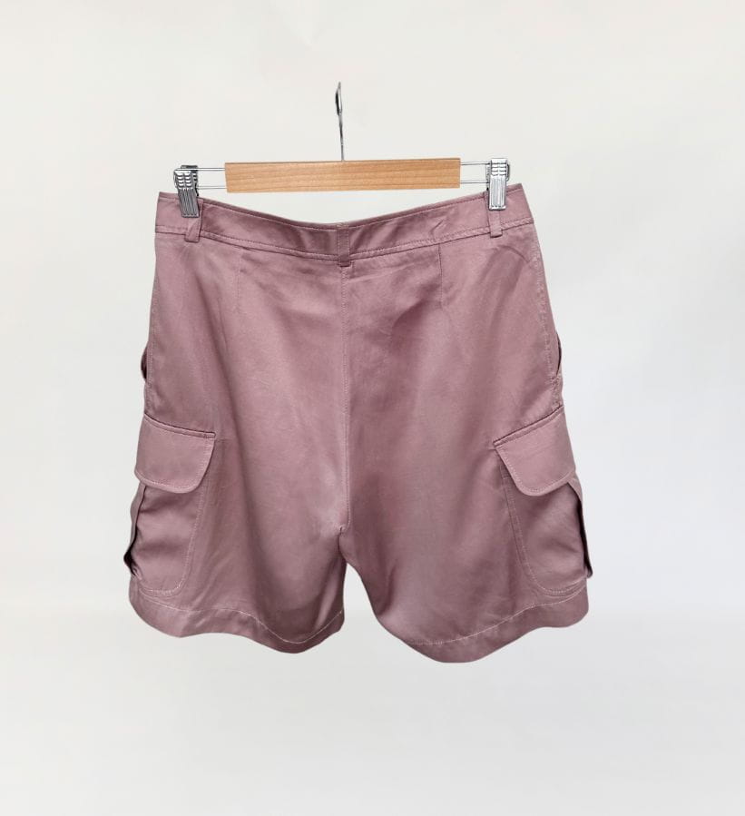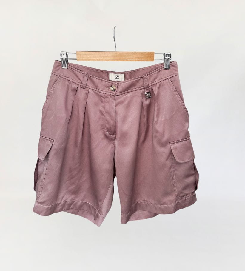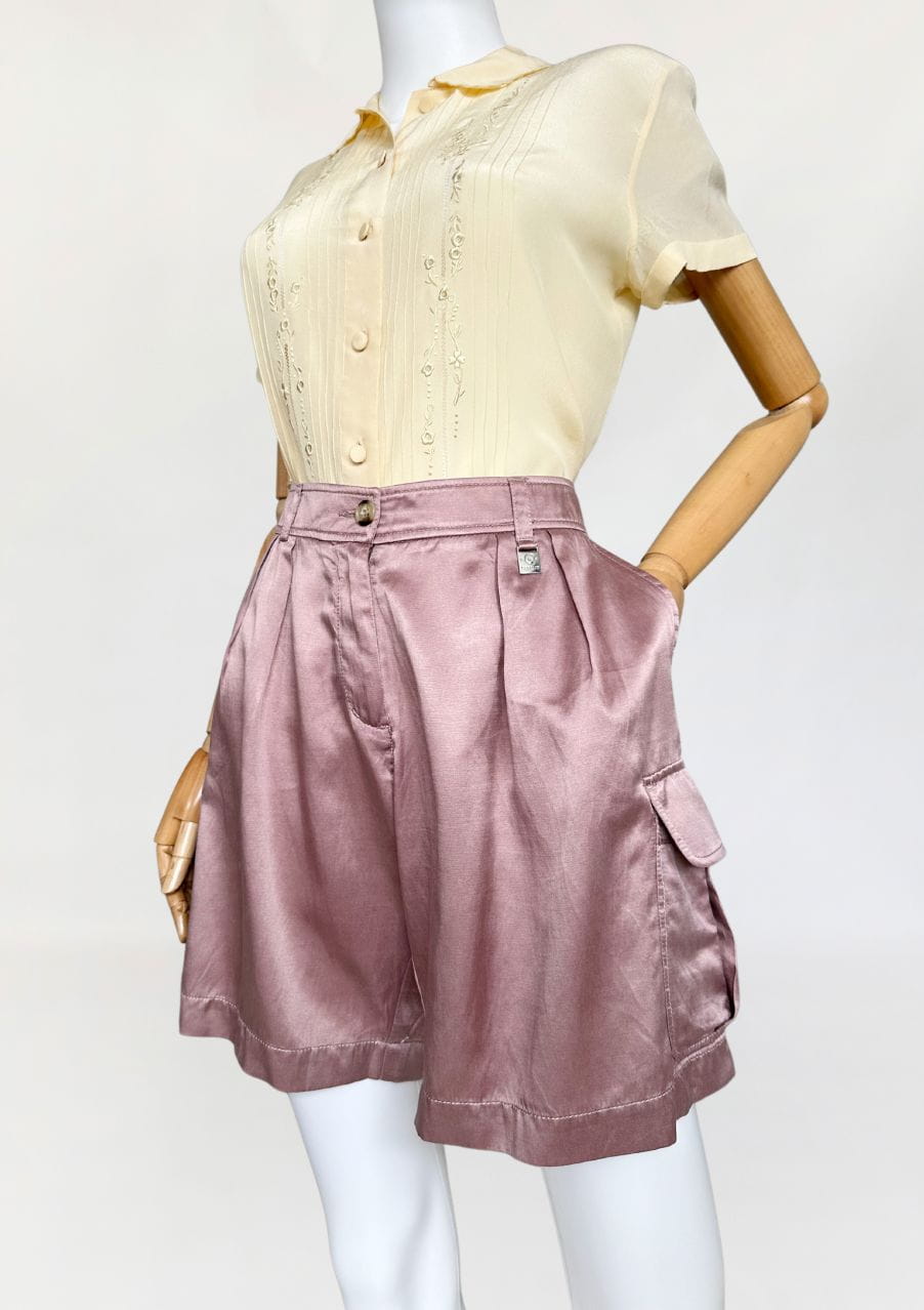 Oryginalne szorty francuskiej marki Cerruti 1881. Wykonane z jedwabnej tkaniny w pudrowym odcieniu lila/mauve (odcień jest ciężki do zdefiniowania). Model z wyższym stanem i krótkimi szerszymi nogawkami z kieszeniami cargo po bokach. W pasie zaszewki.