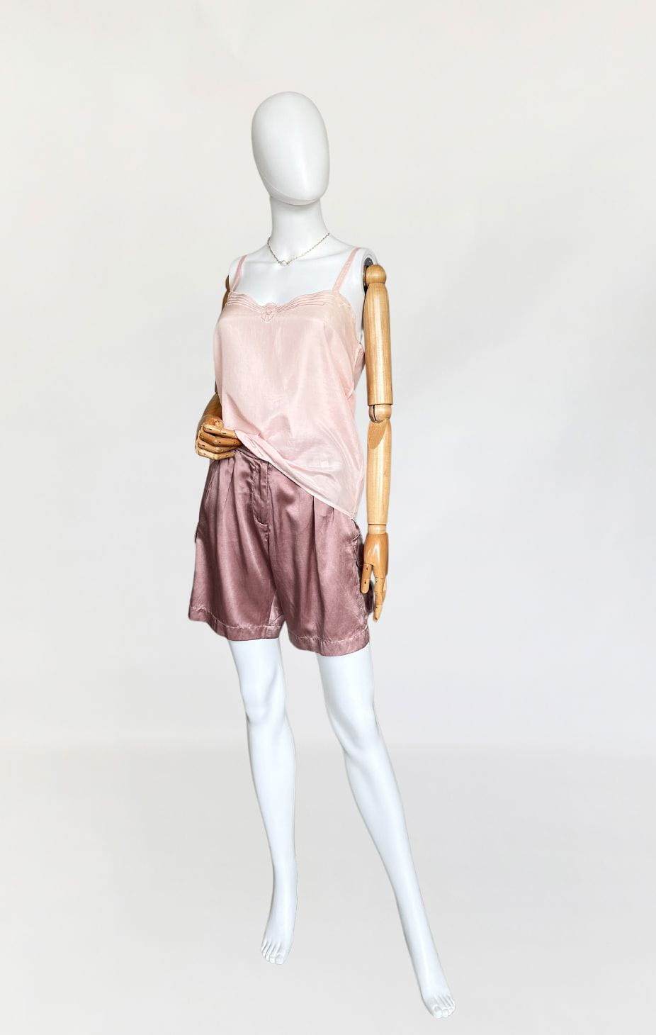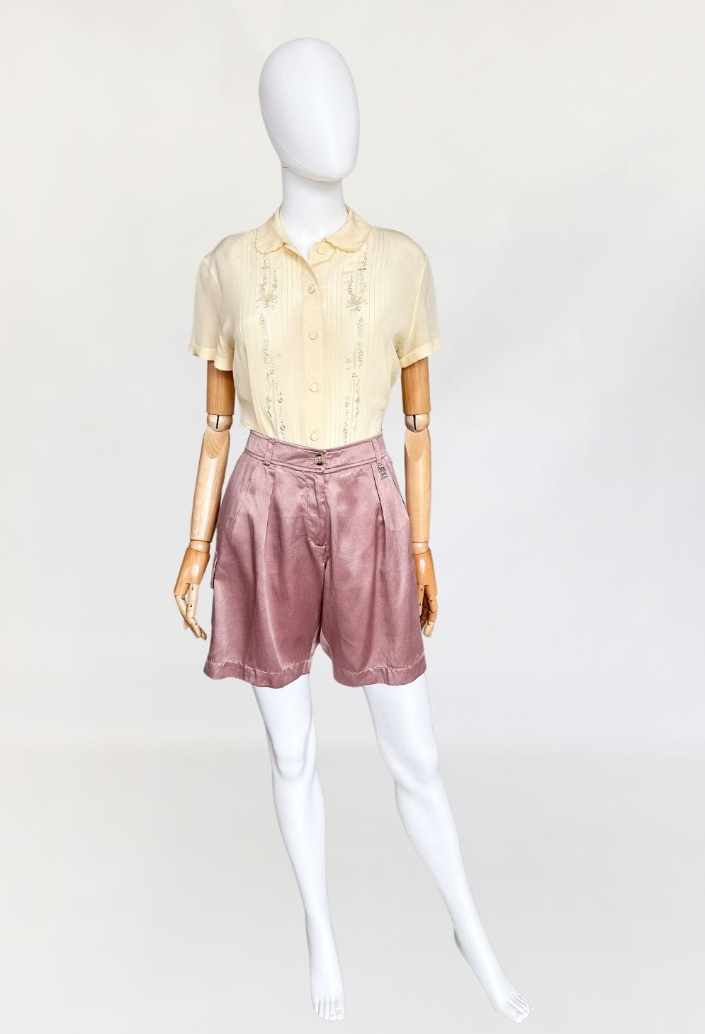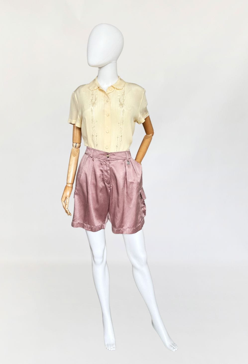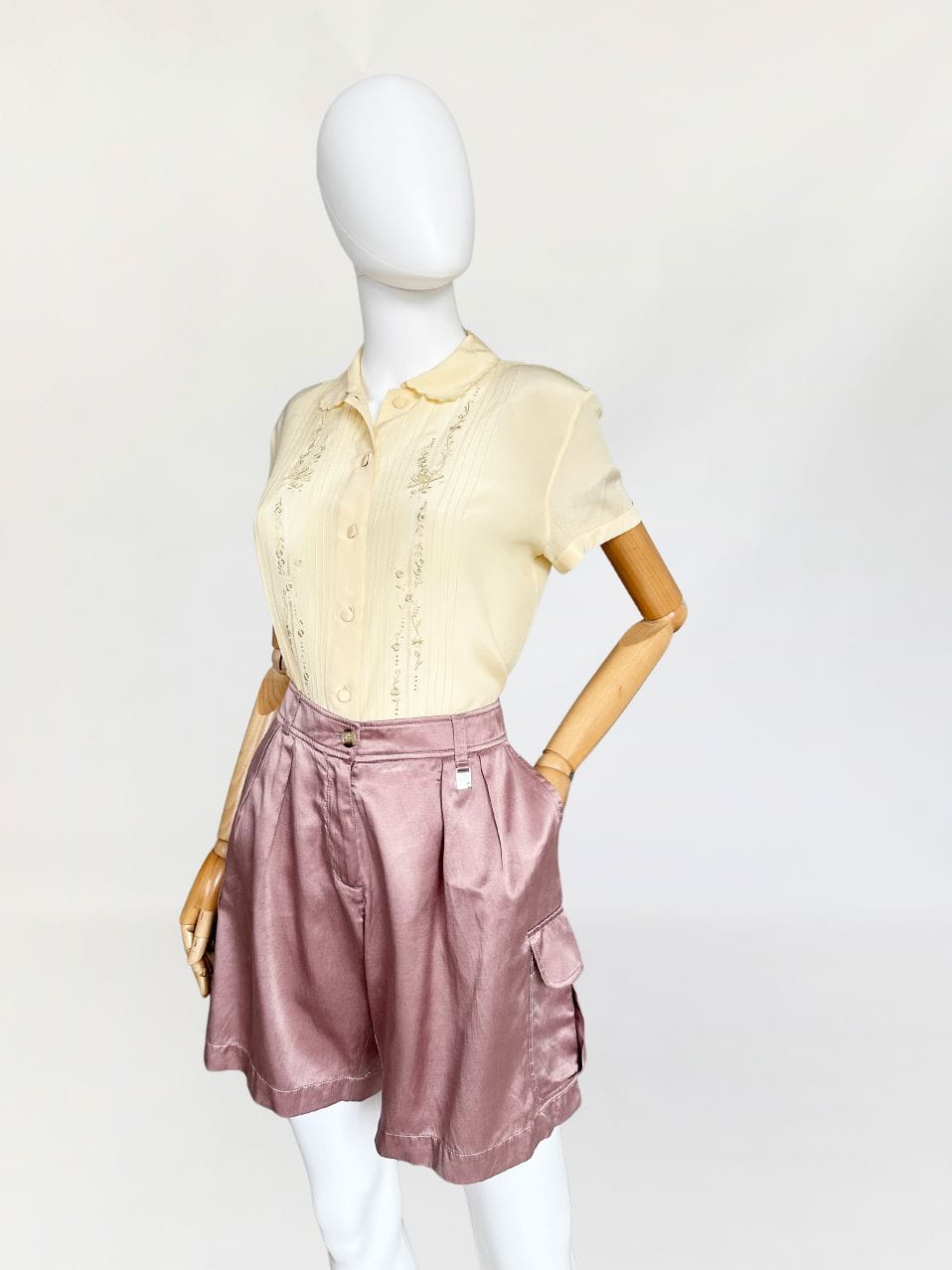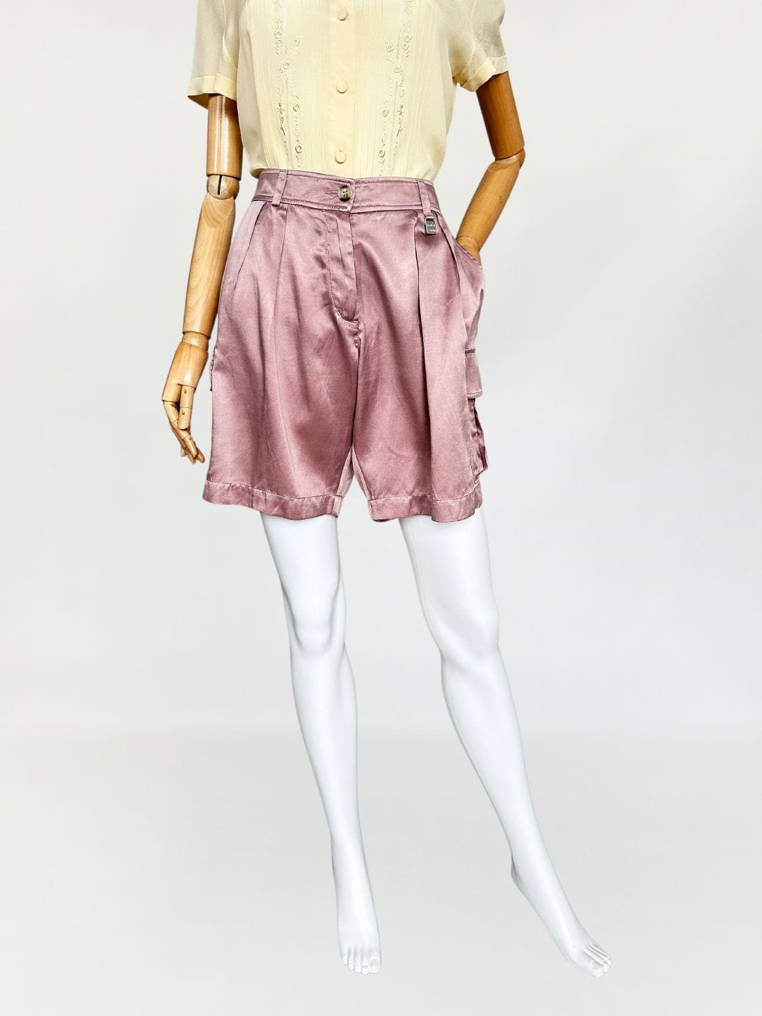 Oryginalne szorty francuskiej marki Cerruti 1881. Wykonane z jedwabnej tkaniny w pudrowym odcieniu lila/mauve (odcień jest ciężki do zdefiniowania). Model z wyższym stanem i krótkimi szerszymi nogawkami z kieszeniami cargo po bokach. W pasie zaszewki.