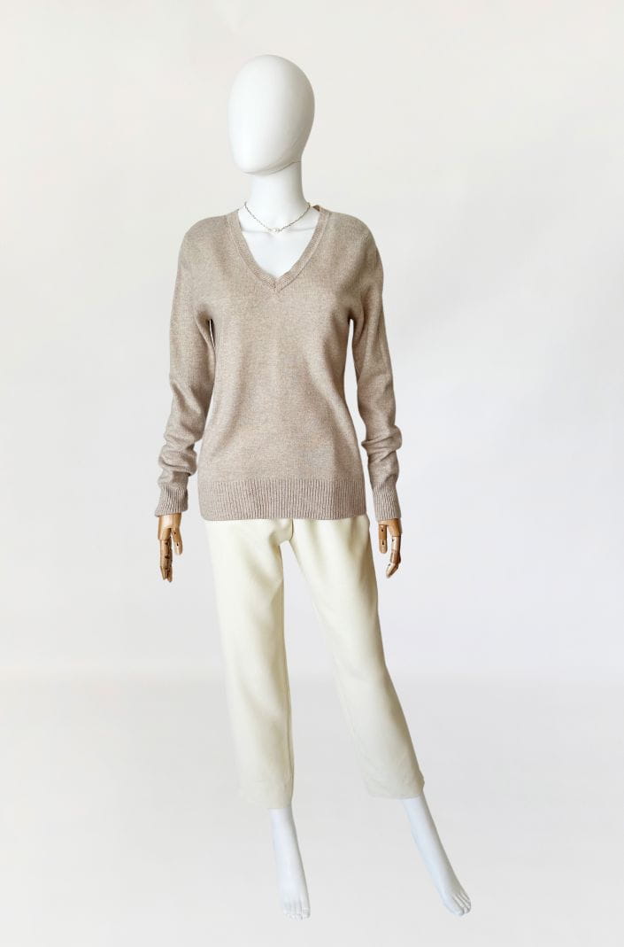 Minimalistyczny sweter wykonany w całości z lekkiego jak chmurka kaszmiru w odcieniu piaskowego beżu. Klasyczny fason z długimi rękawami i dekoltem "V". U dołu wyższy ściągacz.