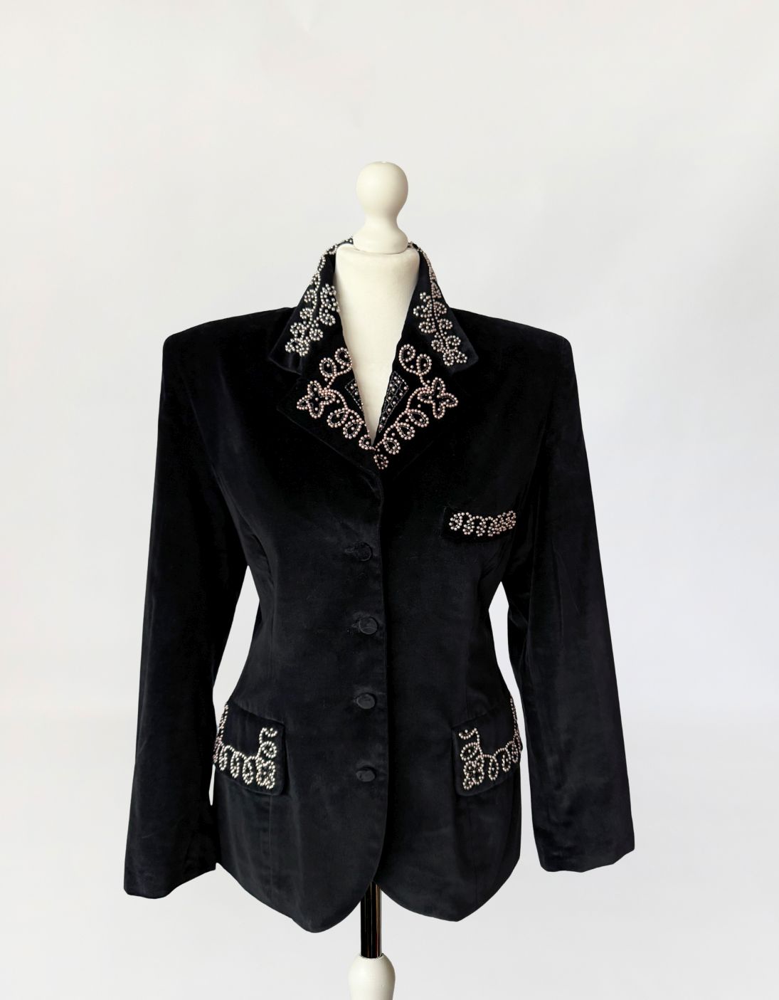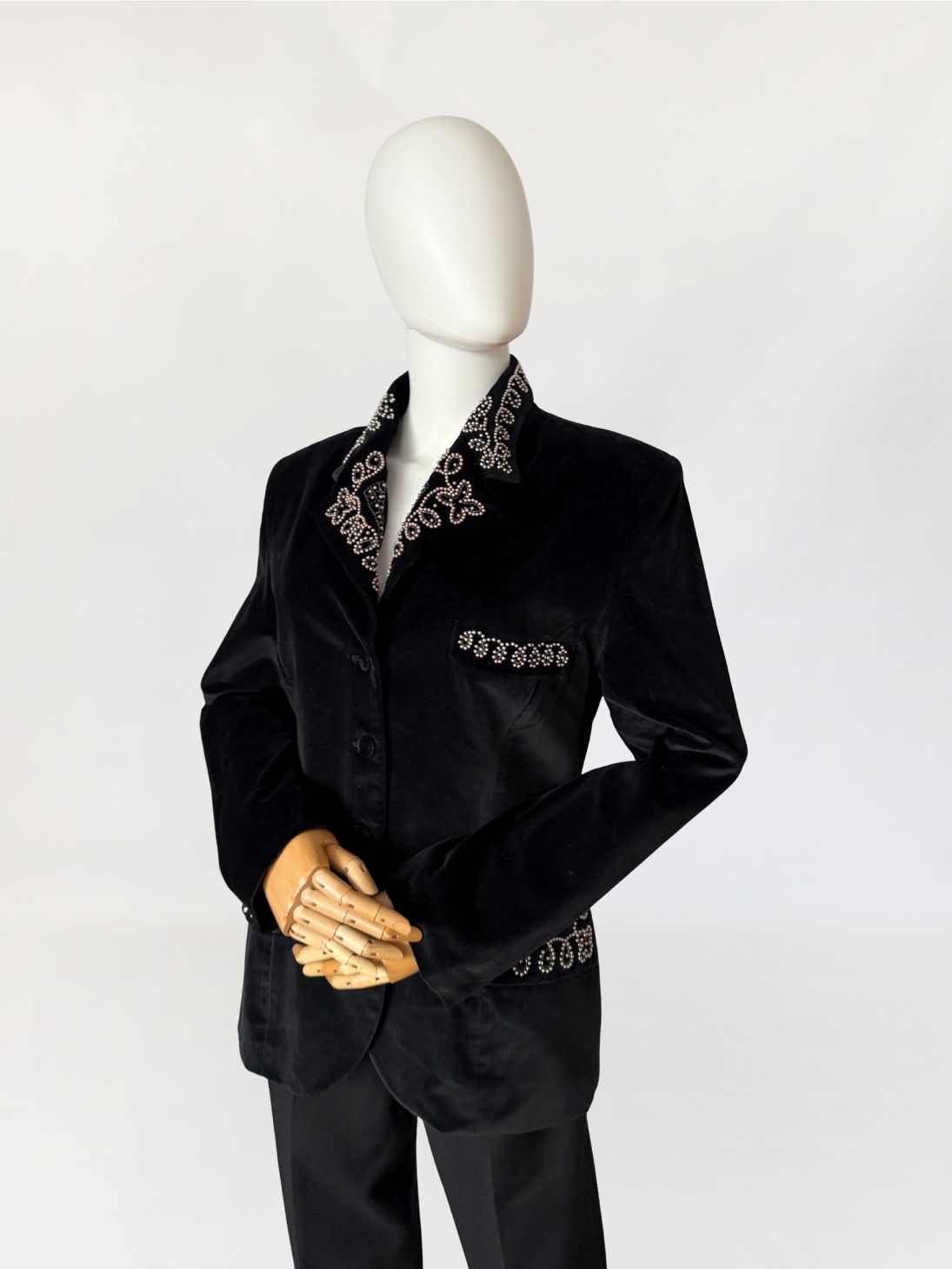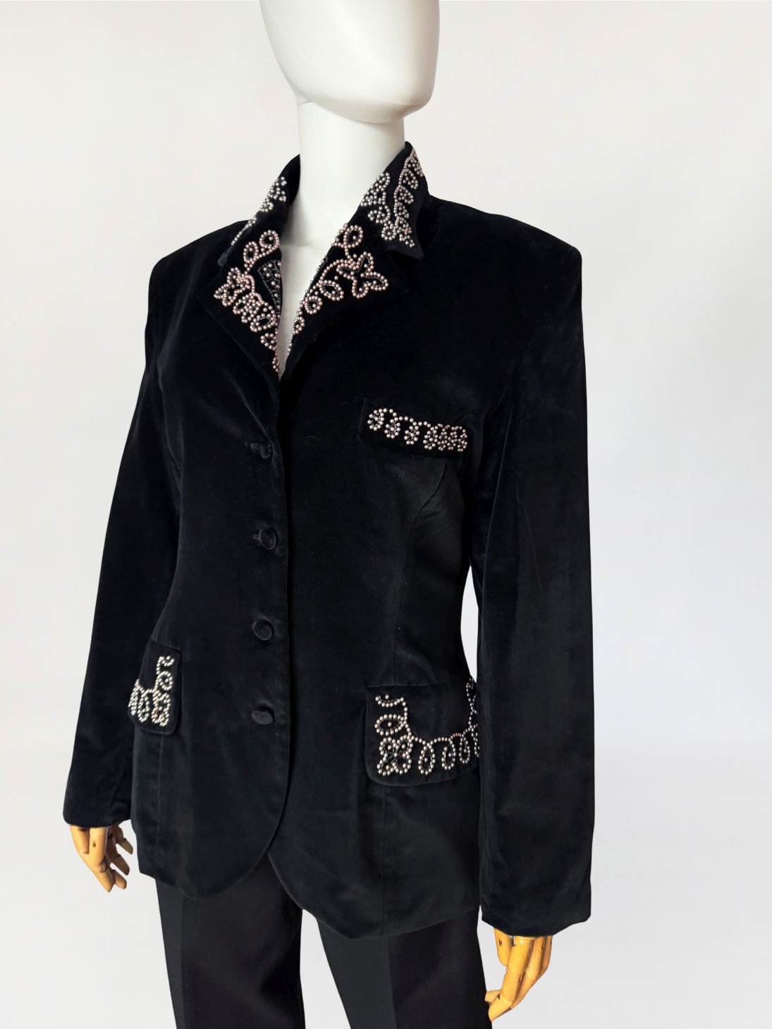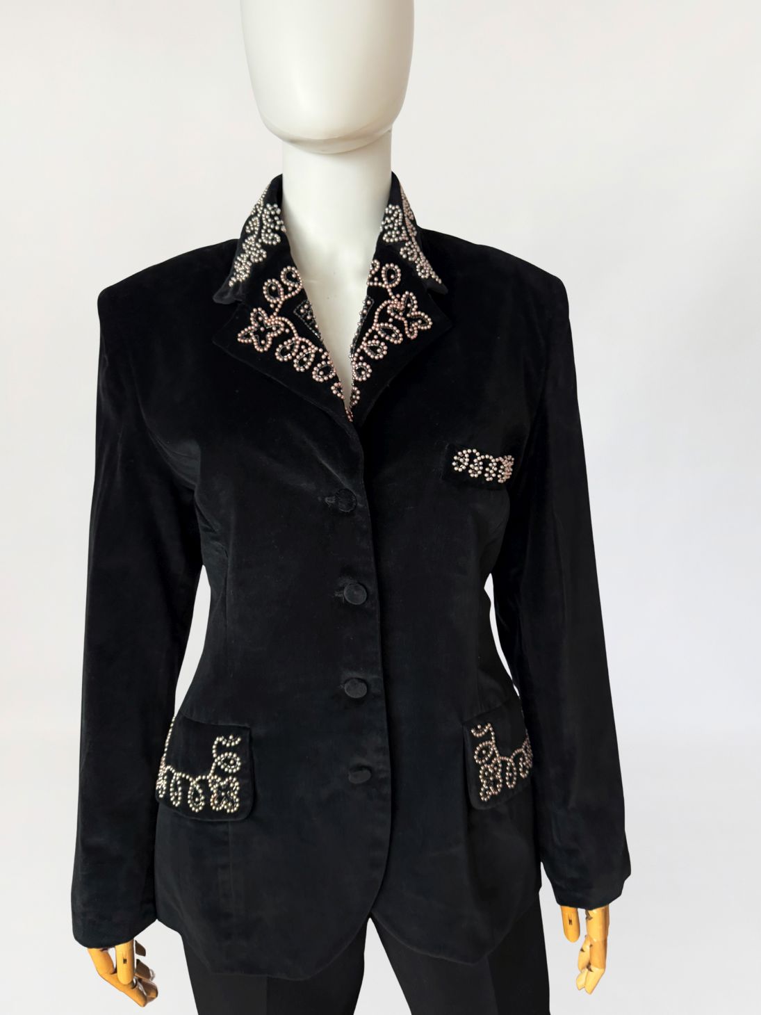 Francuska marynarka vintage Claude Barthelemy w przełomu lat 80-tych/90-tych. Wykonana z czarnego szlachetnego aksamitu. Kołnierz oraz patki kieszeni zdobione misternym haftem z aplikacją drobnych perełek i koralików układających się w ornamentalny motyw roślinny. Taliowany fason z długimi rękawami, w ramionach poduszki, dół lekko zaokrąglany. Od wewnątrz na podszewce.