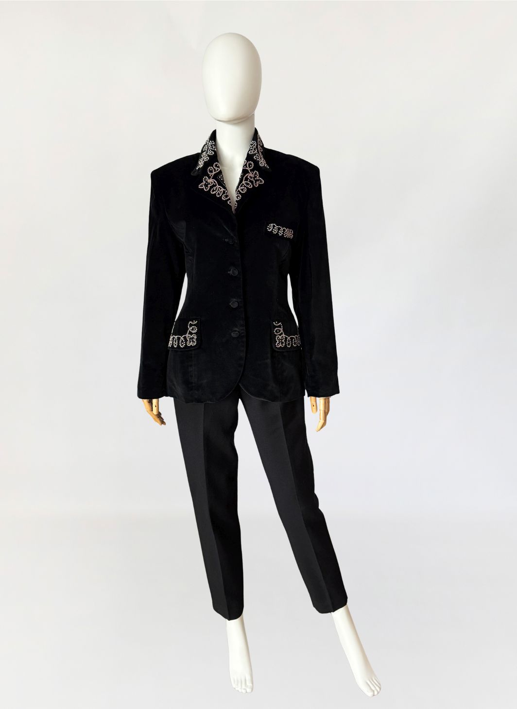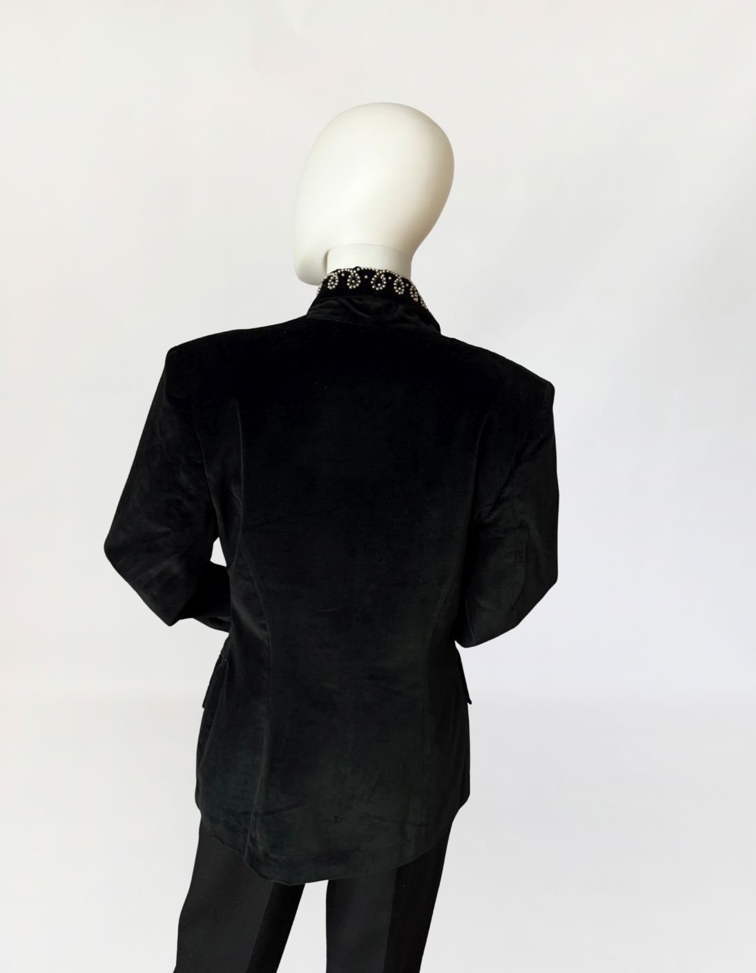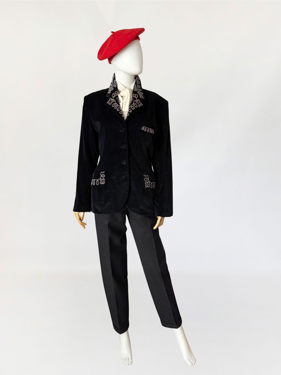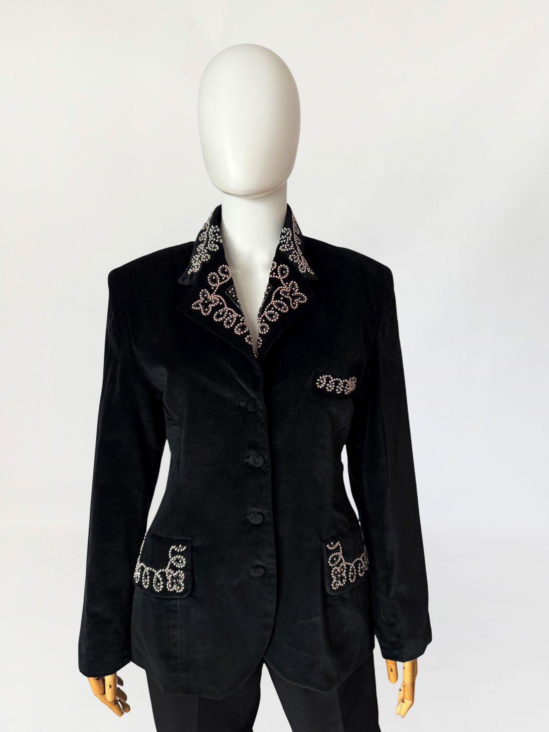 Francuska marynarka vintage Claude Barthelemy w przełomu lat 80-tych/90-tych. Wykonana z czarnego szlachetnego aksamitu. Kołnierz oraz patki kieszeni zdobione misternym haftem z aplikacją drobnych perełek i koralików układających się w ornamentalny motyw roślinny. Taliowany fason z długimi rękawami, w ramionach poduszki, dół lekko zaokrąglany. Od wewnątrz na podszewce.