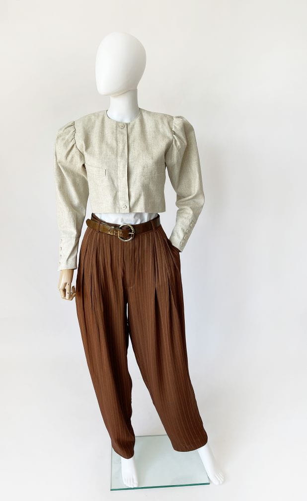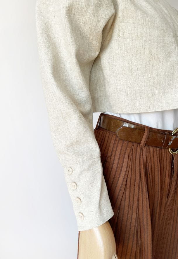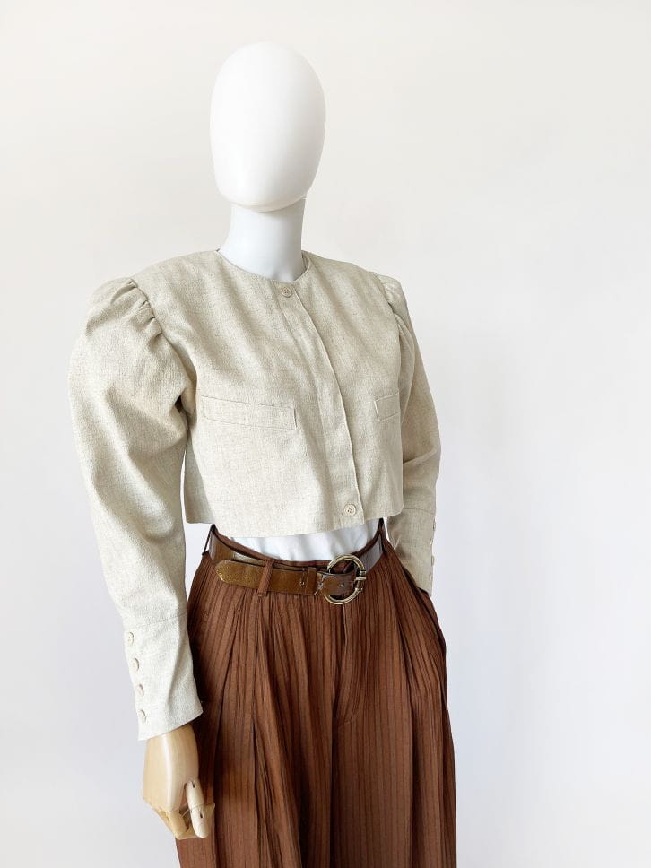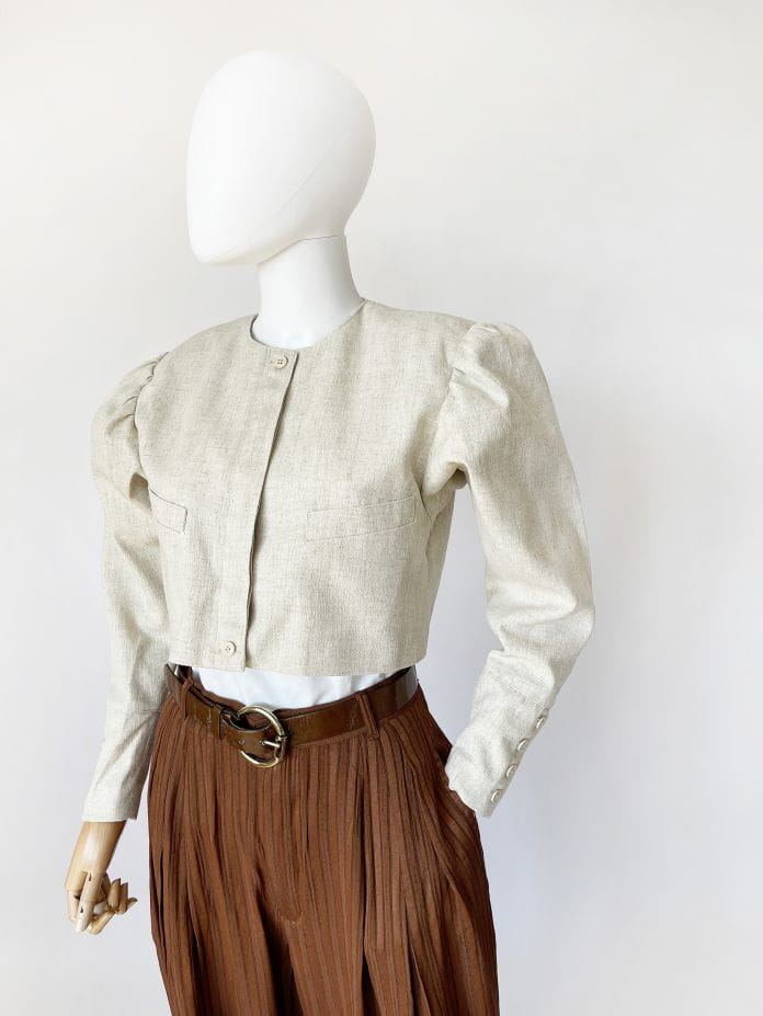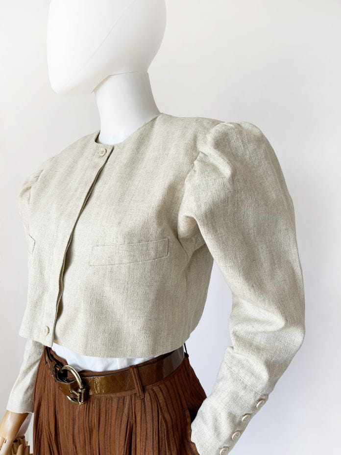 Żakiet vintage z przełomu lat 80-tych i 90-tych kultowej polskiej marki Cora. Wykonany z lnianej tkaniny w surowym odcieniu. Krótki rozpinany fason z długimi rękawami. Bufiaste drapowane ramiona, rękawy dopasowane zapięciem na wysokości mankietów. Z przodu niewielkie kieszonki. Na plecach duża zakładka.