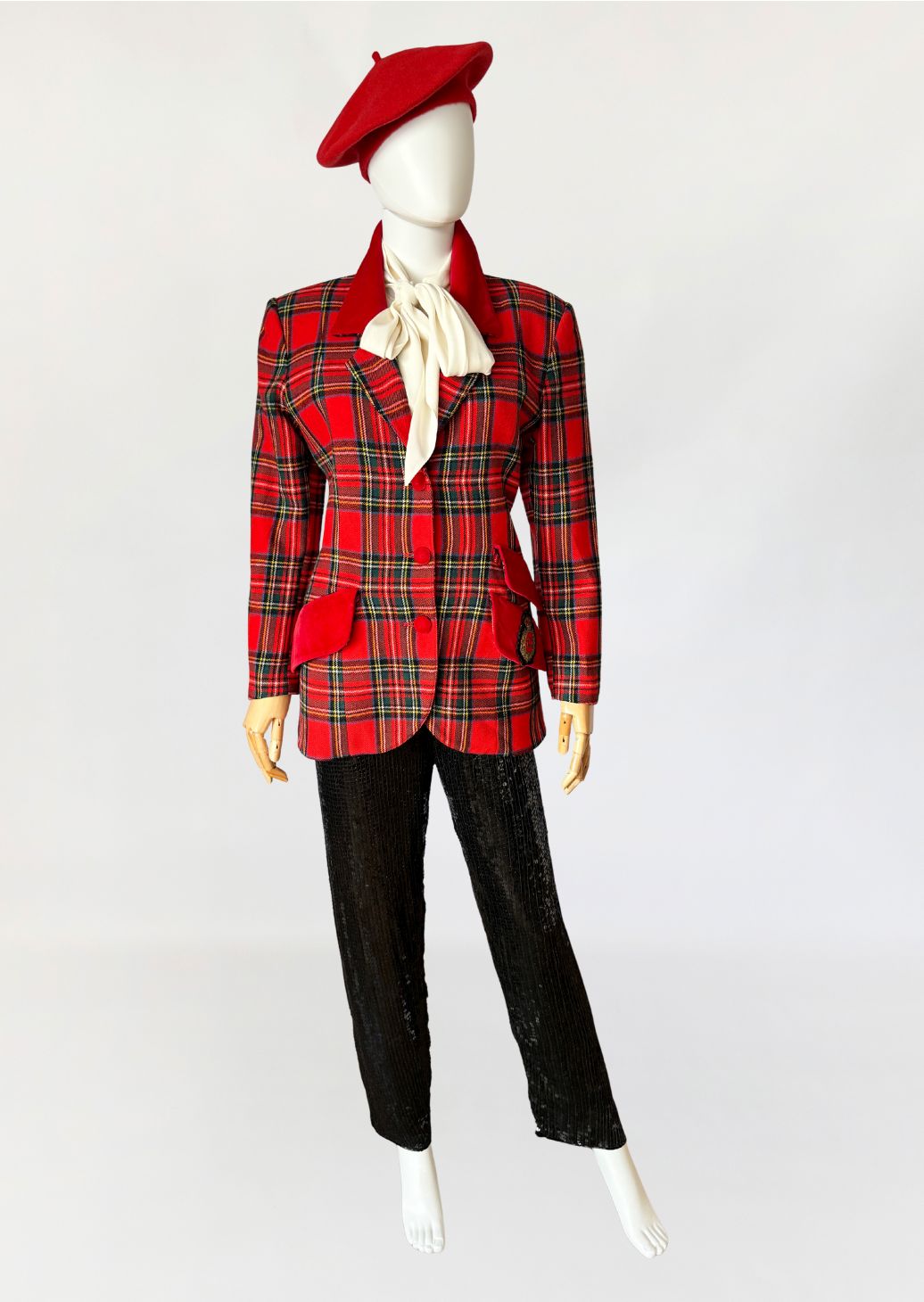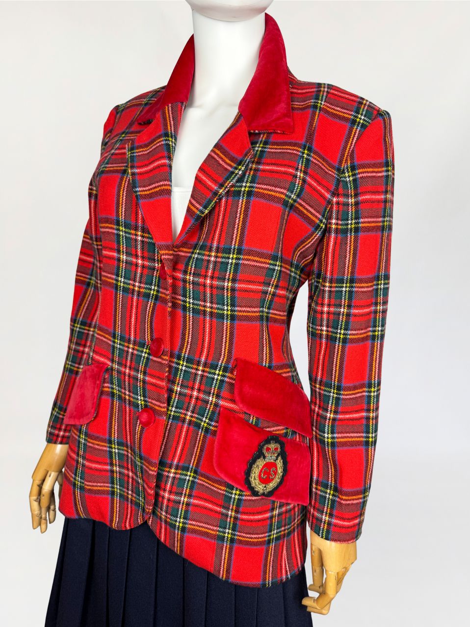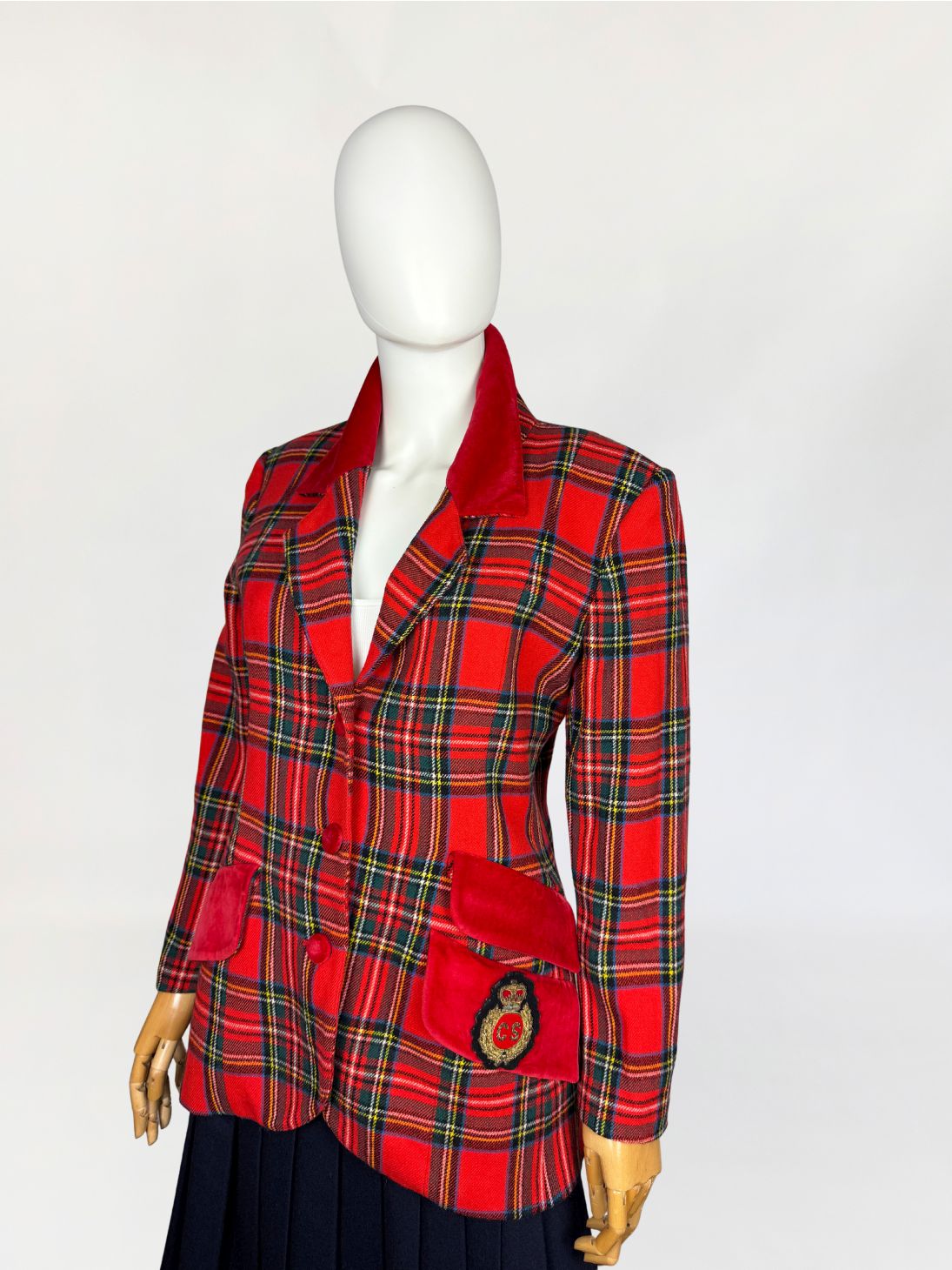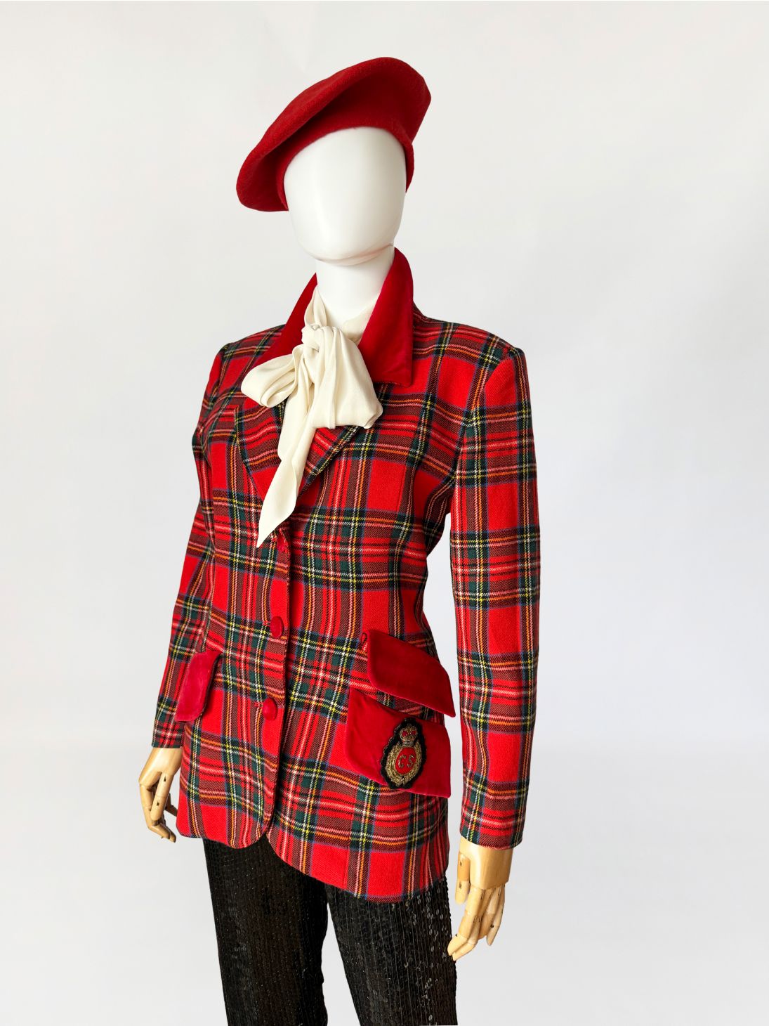Rzadki egzemplarz, włoska marynarka vintage Cristina Santandrea. Model z przełomu lat 80-tych/90-tych wykonany w całości z wełnianej tkaniny o deseniu w klasyczną szkocką kratę w palecie intensywnej czerwieni z akcentami zieleni, czerni i ecru. Konstrukcja charakterystyczna dla włoskiego krawiectwa tego okresu: precyzyjne cięcia modelujące, starannie opracowana linia ramion podkreślona poduszkami, zaakcentowana talia. Kołnierz z wykładanymi klapami wykonany z gładkiego weluru w jednolitym, nasyconym czerwonym odcieniu. Welurowe wykończenia powtórzone są w formie patkowych kieszeni: dwie dolne kieszenie, z czego prawa zdobiona aplikacją herbową wykonaną techniką haftu wypukłego z metalizowaną nicią i inicjałami projektantki. Front zapinany na powlekane guziki.