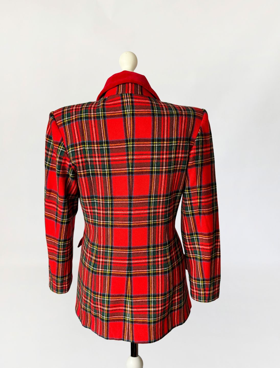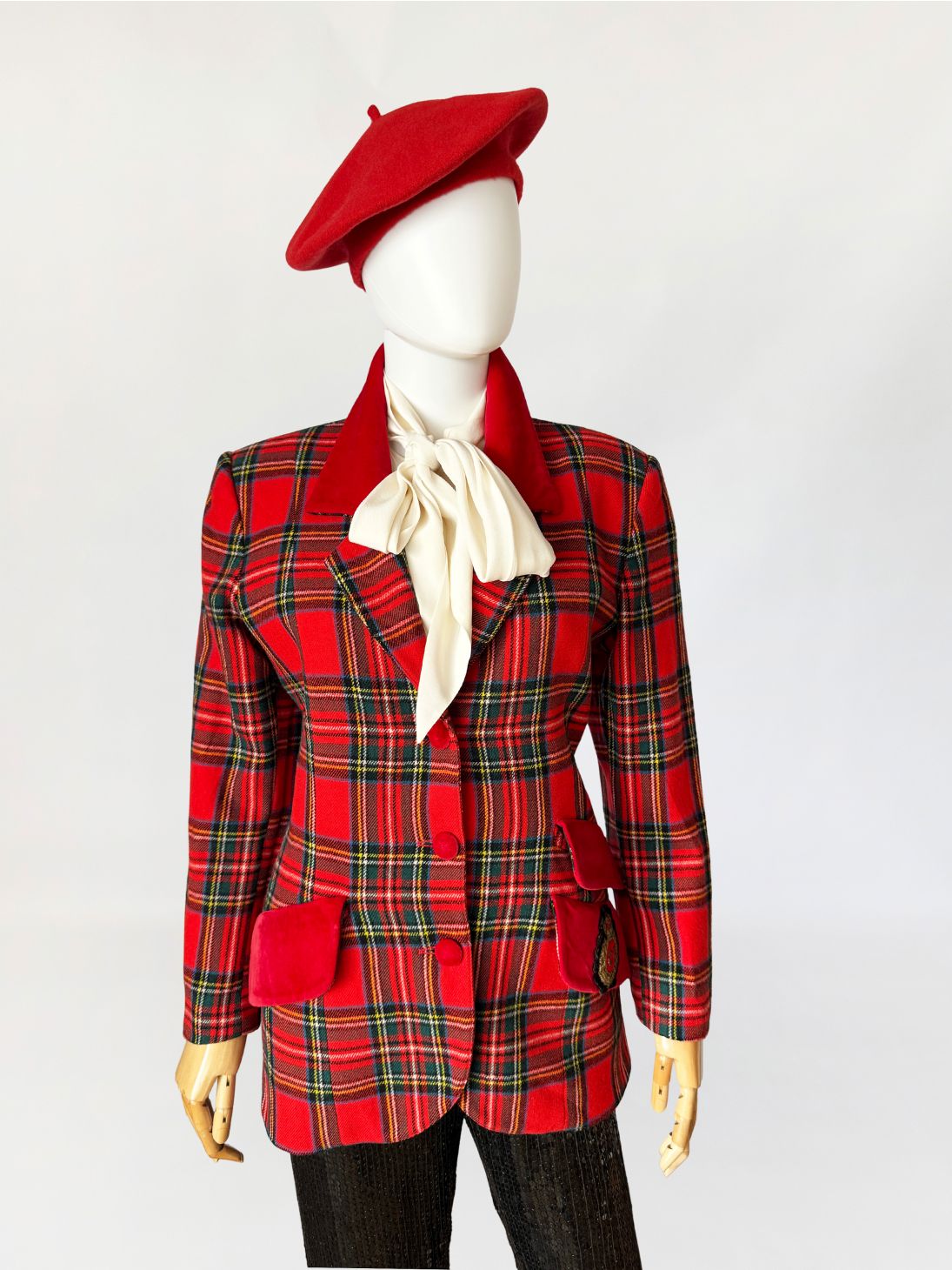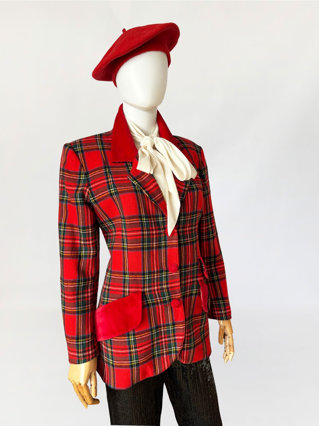 Rzadki egzemplarz, włoska marynarka vintage Cristina Santandrea. Model z przełomu lat 80-tych/90-tych wykonany w całości z wełnianej tkaniny o deseniu w klasyczną szkocką kratę w palecie intensywnej czerwieni z akcentami zieleni, czerni i ecru. Konstrukcja charakterystyczna dla włoskiego krawiectwa tego okresu: precyzyjne cięcia modelujące, starannie opracowana linia ramion podkreślona poduszkami, zaakcentowana talia. Kołnierz z wykładanymi klapami wykonany z gładkiego weluru w jednolitym, nasyconym czerwonym odcieniu. Welurowe wykończenia powtórzone są w formie patkowych kieszeni: dwie dolne kieszenie, z czego prawa zdobiona aplikacją herbową wykonaną techniką haftu wypukłego z metalizowaną nicią i inicjałami projektantki. Front zapinany na powlekane guziki.