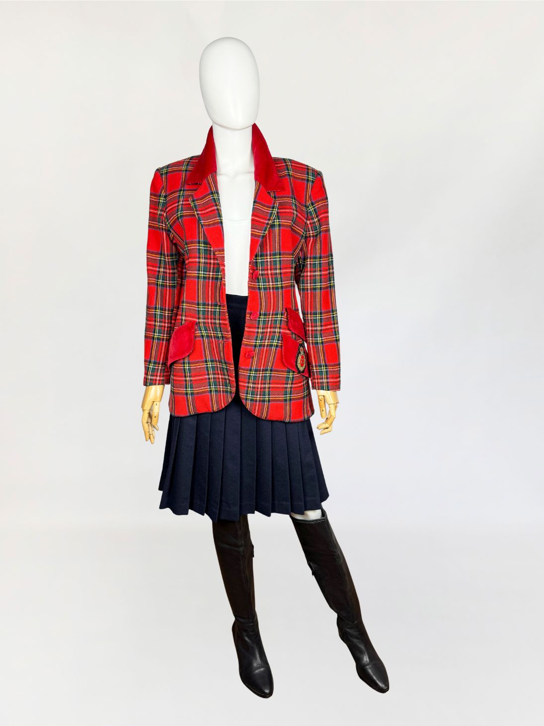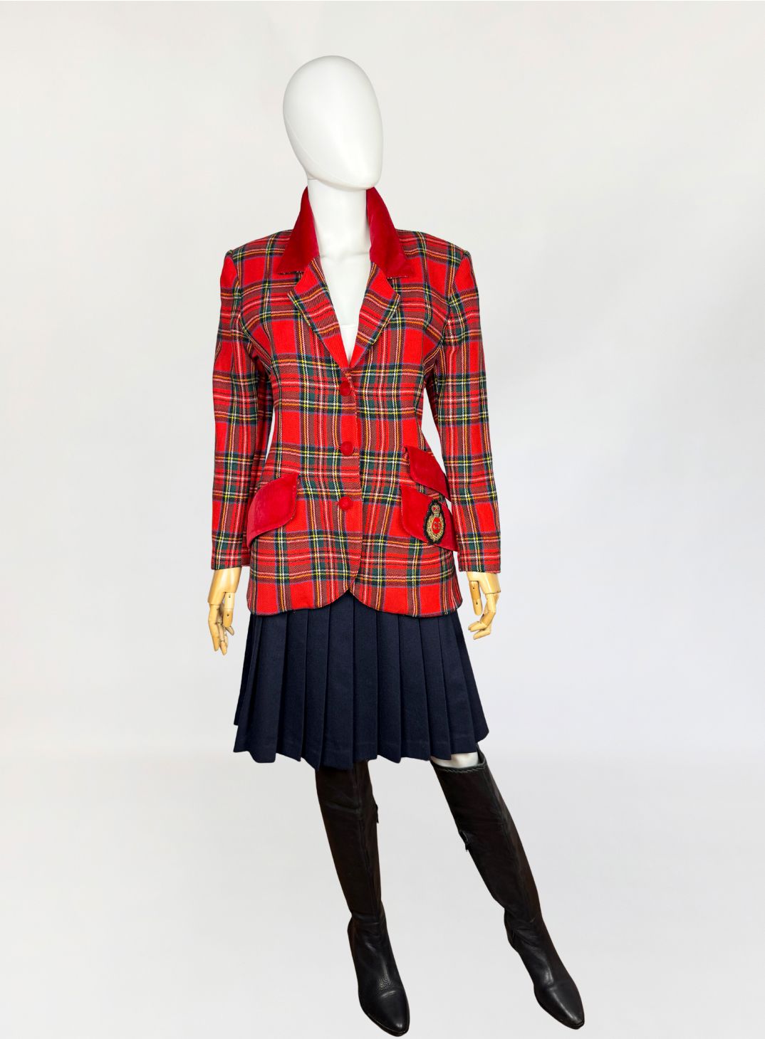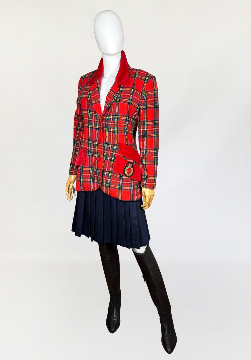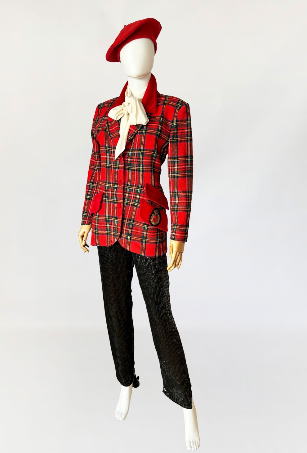 Rzadki egzemplarz, włoska marynarka vintage Cristina Santandrea. Model z przełomu lat 80-tych/90-tych wykonany w całości z wełnianej tkaniny o deseniu w klasyczną szkocką kratę w palecie intensywnej czerwieni z akcentami zieleni, czerni i ecru. Konstrukcja charakterystyczna dla włoskiego krawiectwa tego okresu: precyzyjne cięcia modelujące, starannie opracowana linia ramion podkreślona poduszkami, zaakcentowana talia. Kołnierz z wykładanymi klapami wykonany z gładkiego weluru w jednolitym, nasyconym czerwonym odcieniu. Welurowe wykończenia powtórzone są w formie patkowych kieszeni: dwie dolne kieszenie, z czego prawa zdobiona aplikacją herbową wykonaną techniką haftu wypukłego z metalizowaną nicią i inicjałami projektantki. Front zapinany na powlekane guziki.
