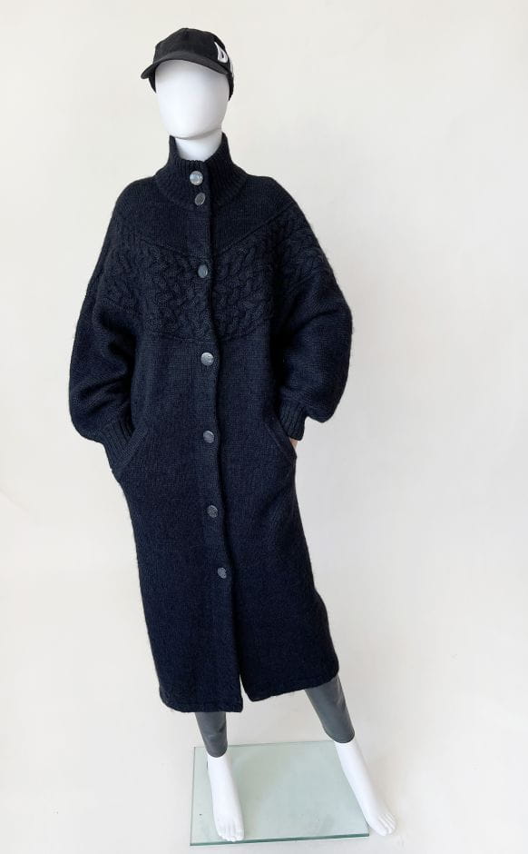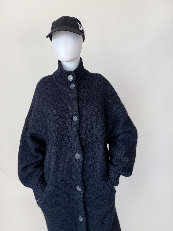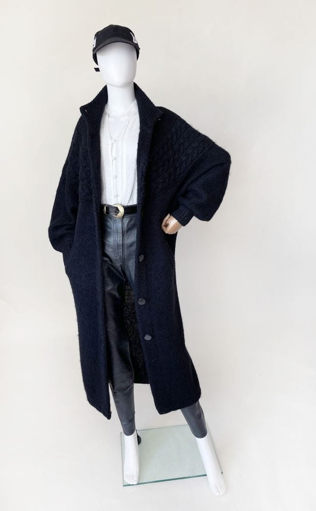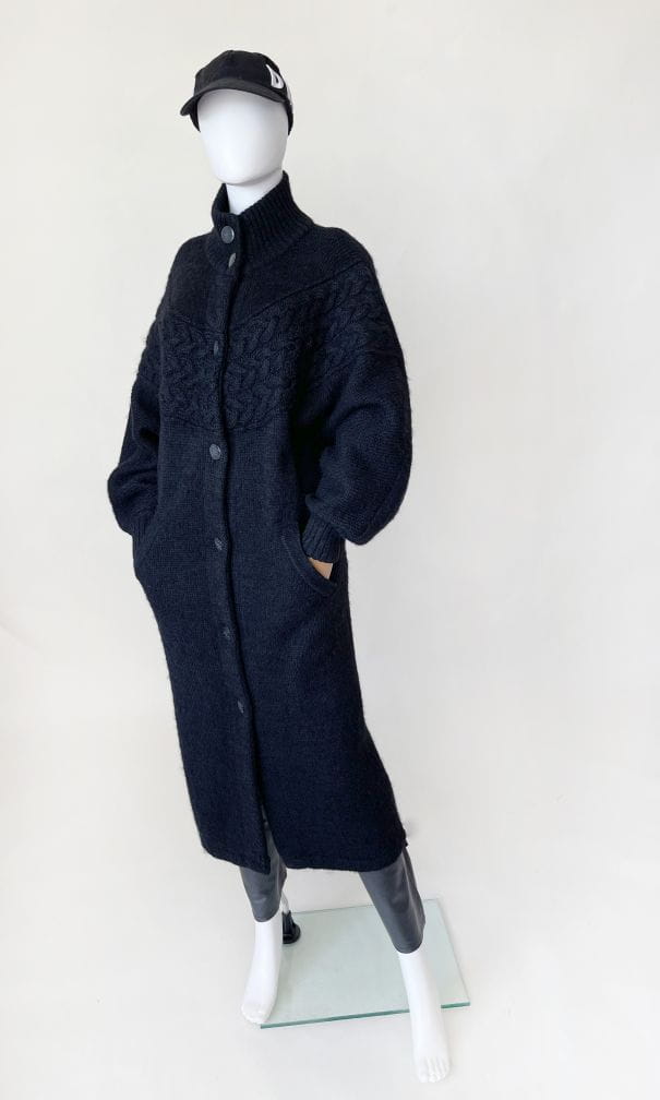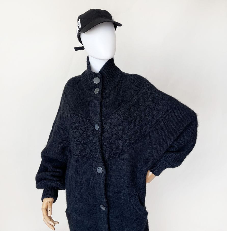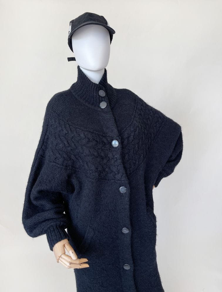 Ciepłe swetrzysko o długości maxi, z powodzeniem zastąpi płaszcz jesienią. Wykonany z dobrej jakości, grubszej dzianiny w kolorze czarnym. Góra luźna, ze stójką. W centralnej części, dekoracyjny warkoczowy splot. Długie raglanowy rękawy, obniżona linia pach. Dół o prostym fasonie, z kieszeniami na wysokości pasa. Zapinany na duże guziki. Vintage w doskonałym stanie.
