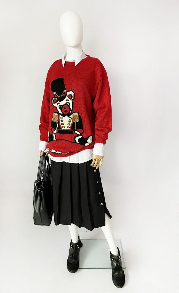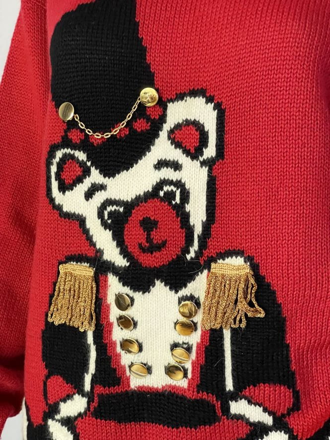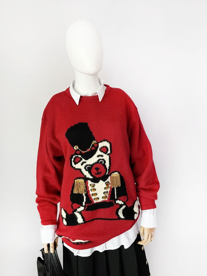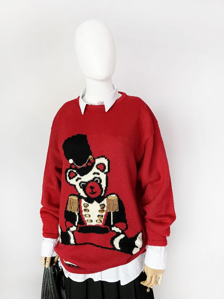 Pudełkowy czerwony sweter vintage. Z przodu duży miś - gwardzista, którego mundur zdobią złote pagony i guziki. Wykonany z miękkiej, przyjemnej dzianiny.