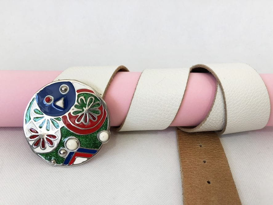 Pasek marki Diesel wykonany ze skóry naturalnej w kolorze ecru. Model z dużą kolorową klamrą. Model naszym zdaniem unisex.