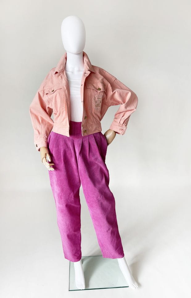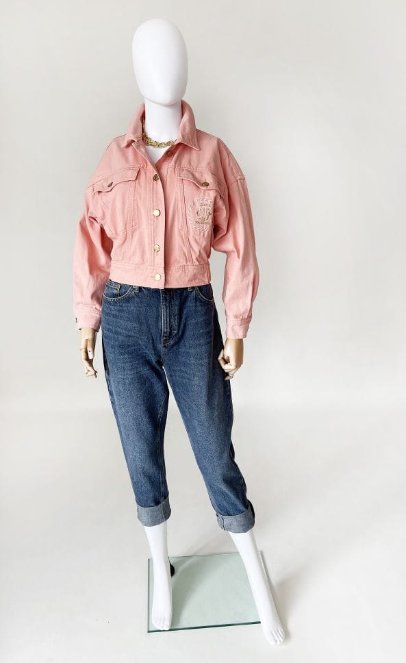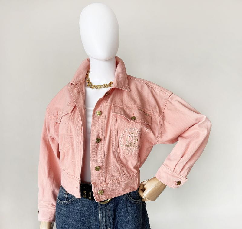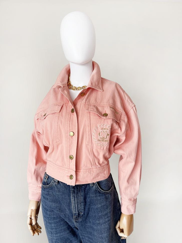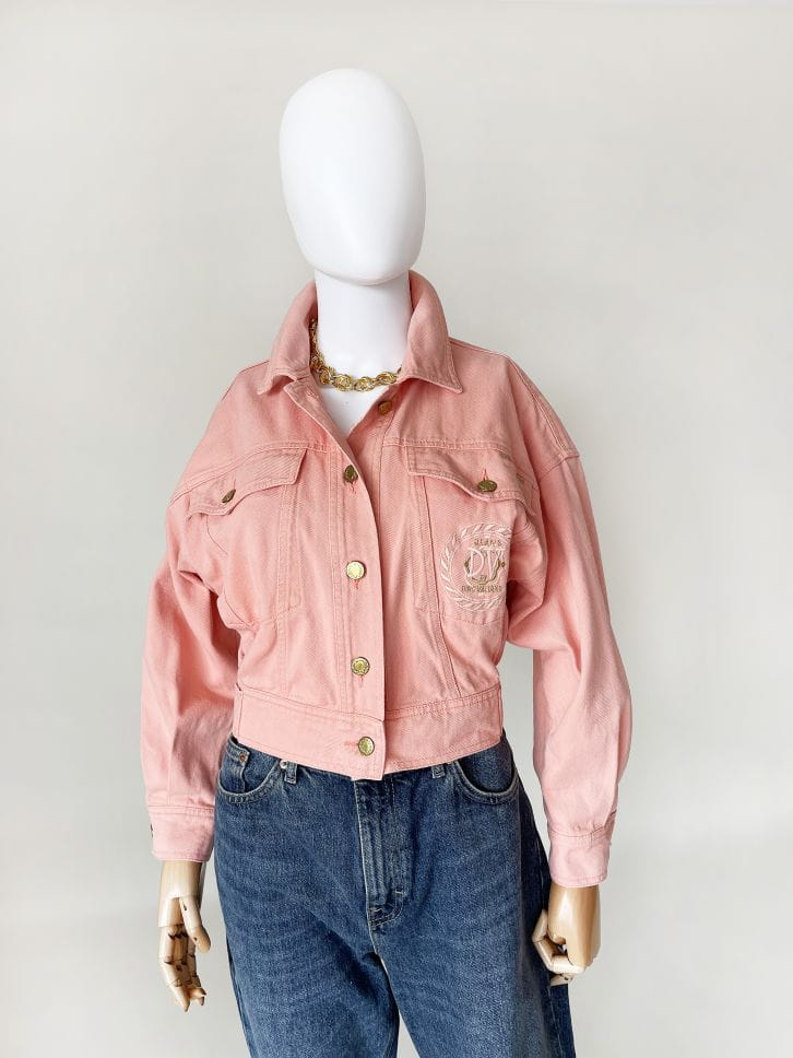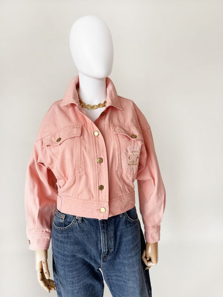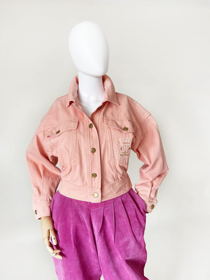 Obłędna kurtka vintage z przełomu lat 80-tycch/90-tych. Model projektu marki Dino Valiano. Wykonana z jeansowej tkaniny w kolorze morelowym. Krótki fason, góra luźniejsza, stopniowo zwęża się do dołu. W pasie dopasowana. Zapinana na metalowe złote guziki. U góry kieszenie, na jednej wyhaftowana nazwa marki.
