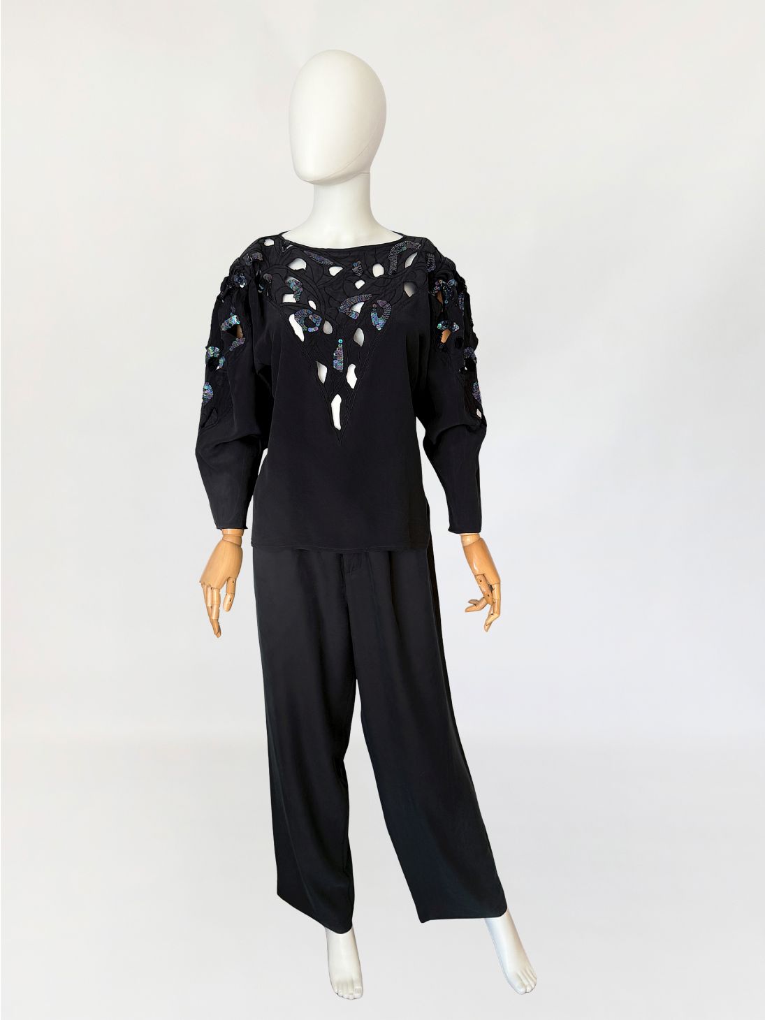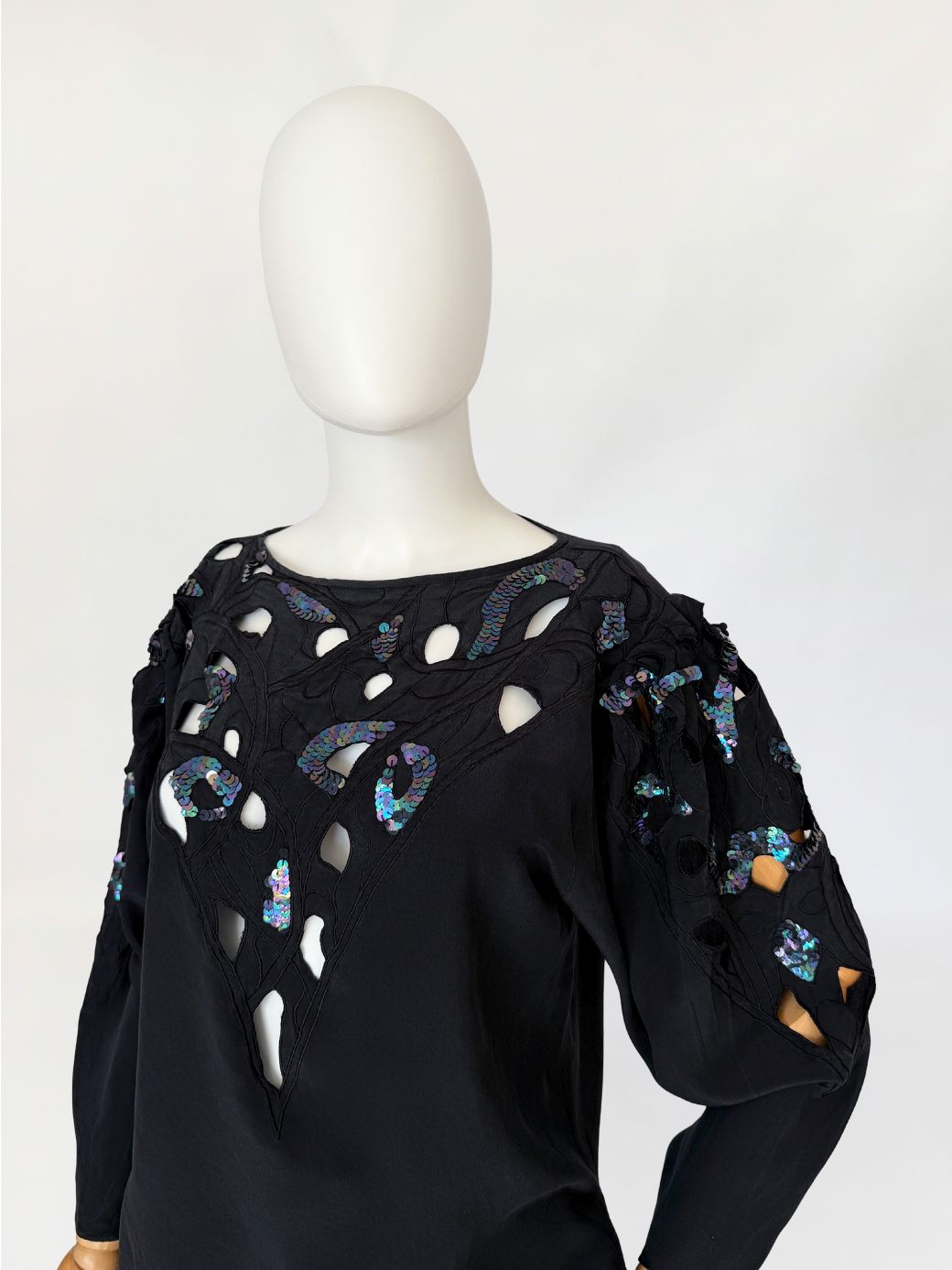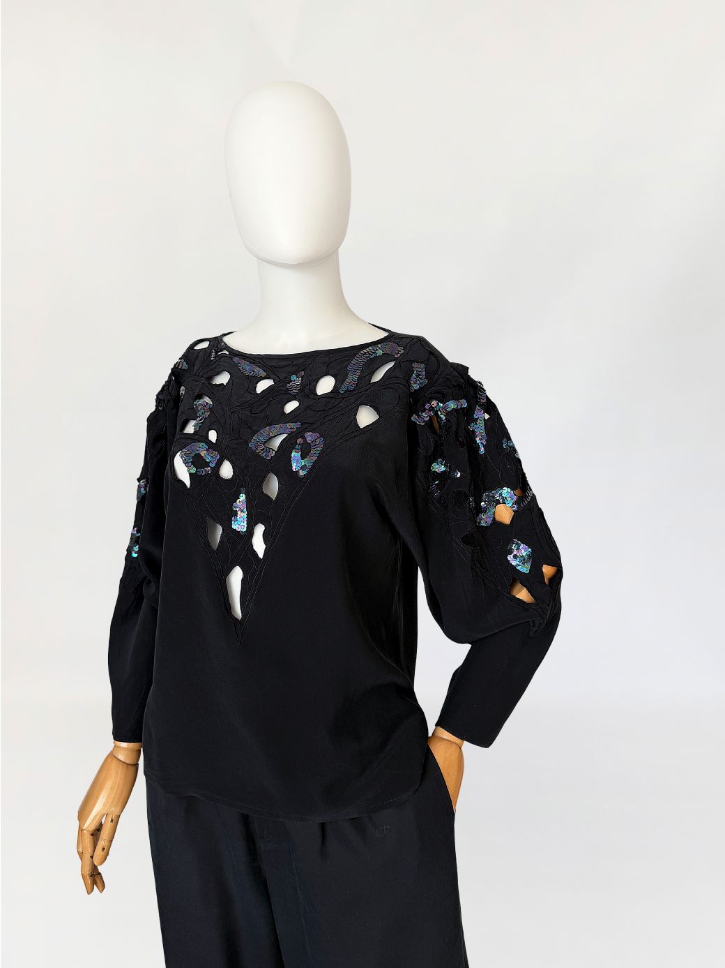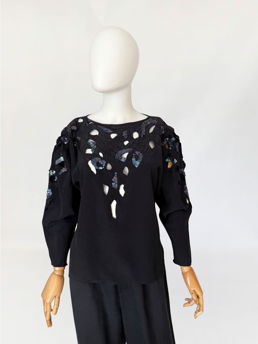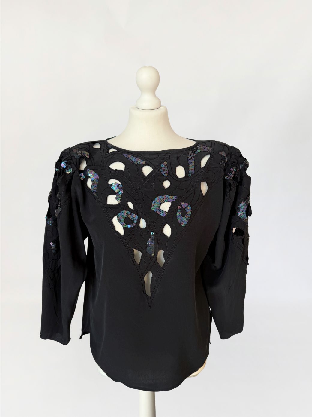 Bluzka vintage marki Dino Valiano wykonana z naturalnego jedwabiu w czarnym odcieniu o umiarkowanej intensywności koloru. Górna część przodu oraz rękawy wykończone aplikacją z ażurowo wycinanej tkaniny, tworzącej nieregularny, organiczny układ prześwitów. Na powierzchni aplikacji naszycia z cekinów w odcieniach grafitu, zieleni i fioletu. Rękawy długie, o zwiększonej objętości w górnej części, zwężane ku dołowi. W ramionach poduszki. Tył gładki.