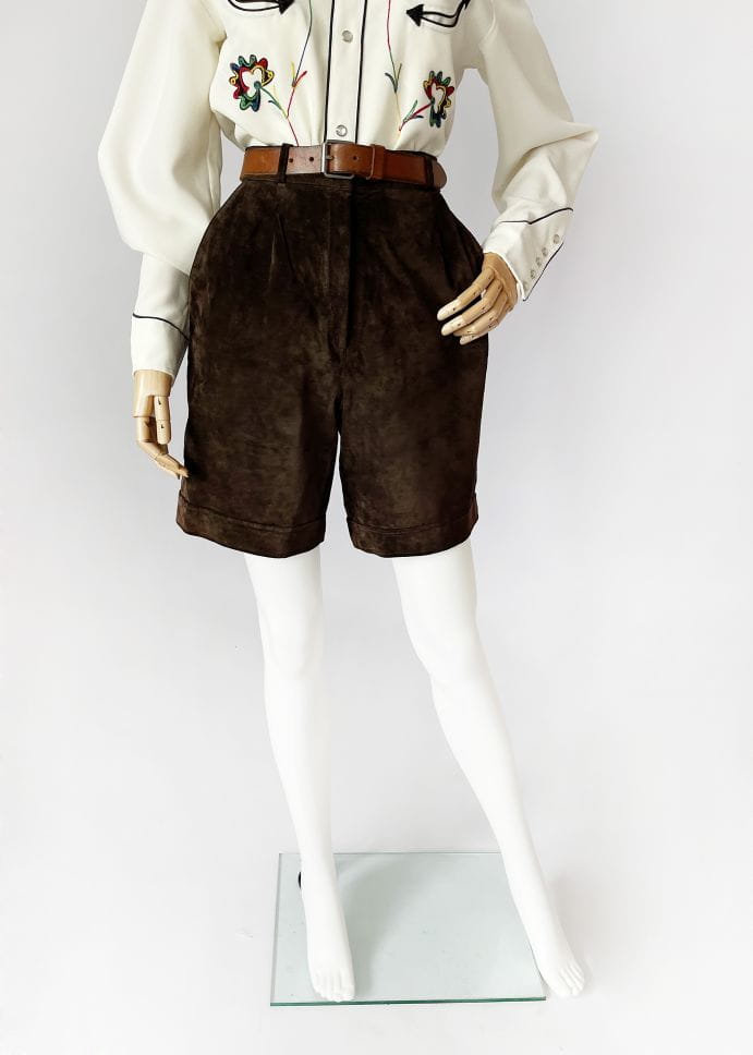 Szorty vintage z lat 90-tych projektu marki Dino'z. Wykonane z lekkiego zamszu w kolorze brązowym. Model z wyższym stanem i prostymi nogawkami. W pasie wsuwane kieszenie. Od wewnątrz na podszewce.