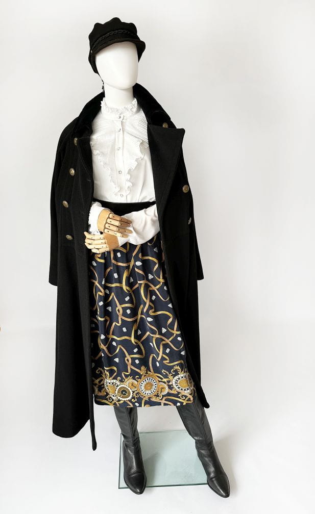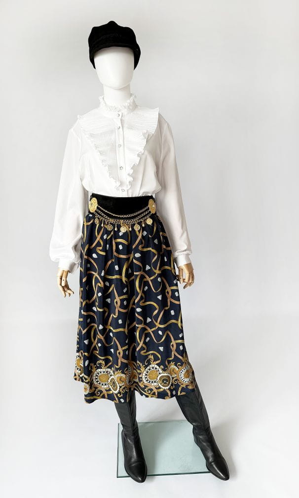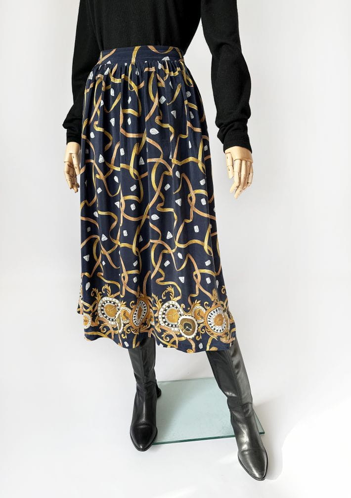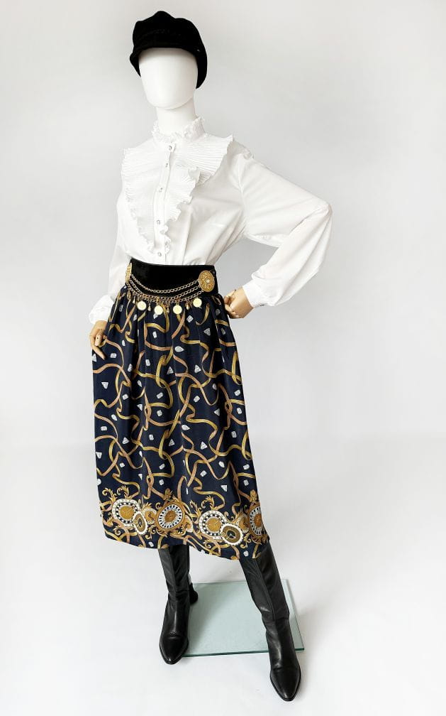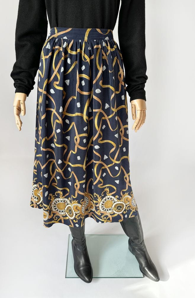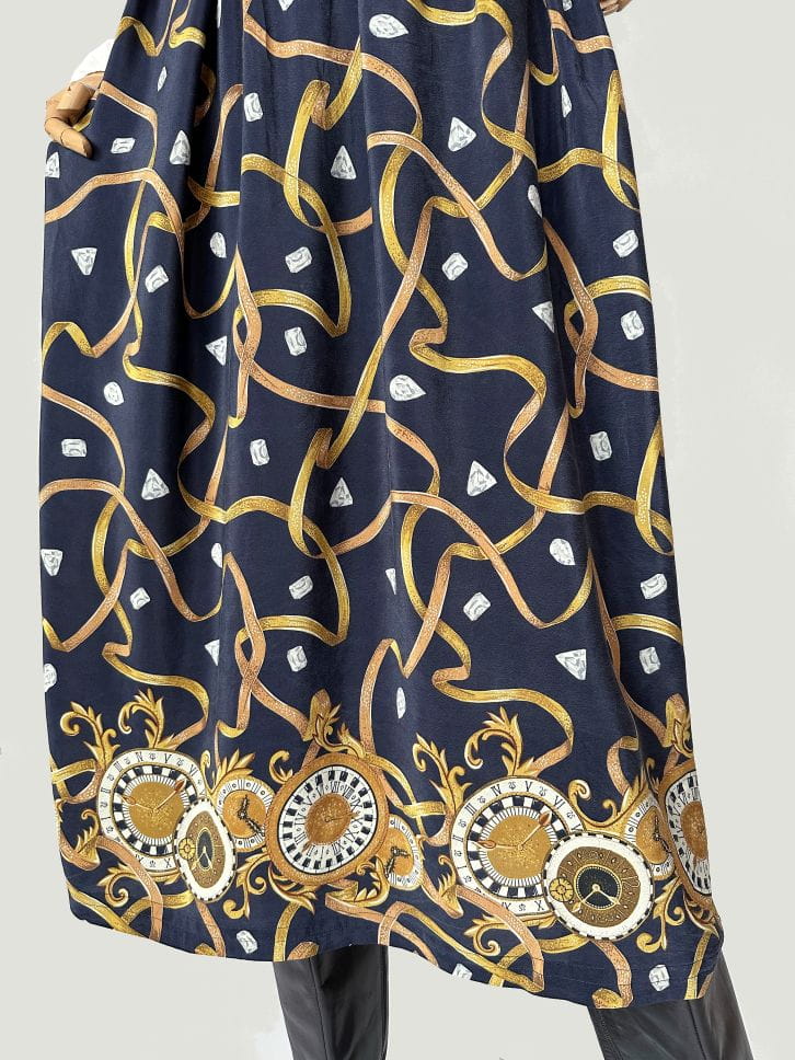 Spódnica vintage uszyta z delikatnej jedwabnej tkaniny we wzory: diamenty, łańcuchy, zegary. Rozkloszowany fason o długości midi. Tył pasa elastyczny. Nie ma podszewki. Szeroki pas ze stylizacji nie jest elementem kompletu. Intensywność kolorów najlepiej odzwierciedla ostatnie zdjęcie.