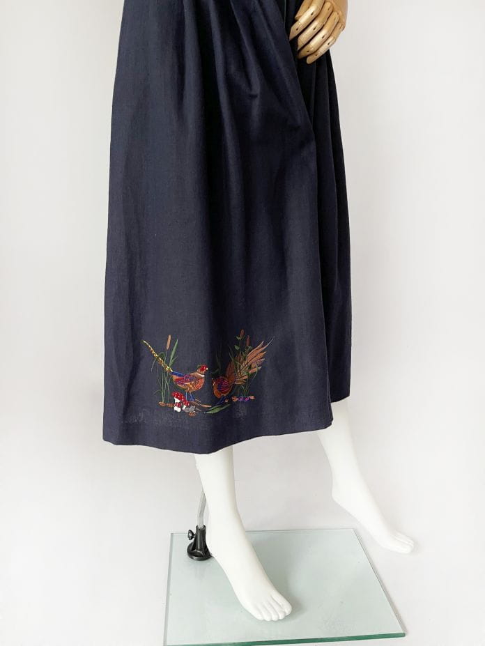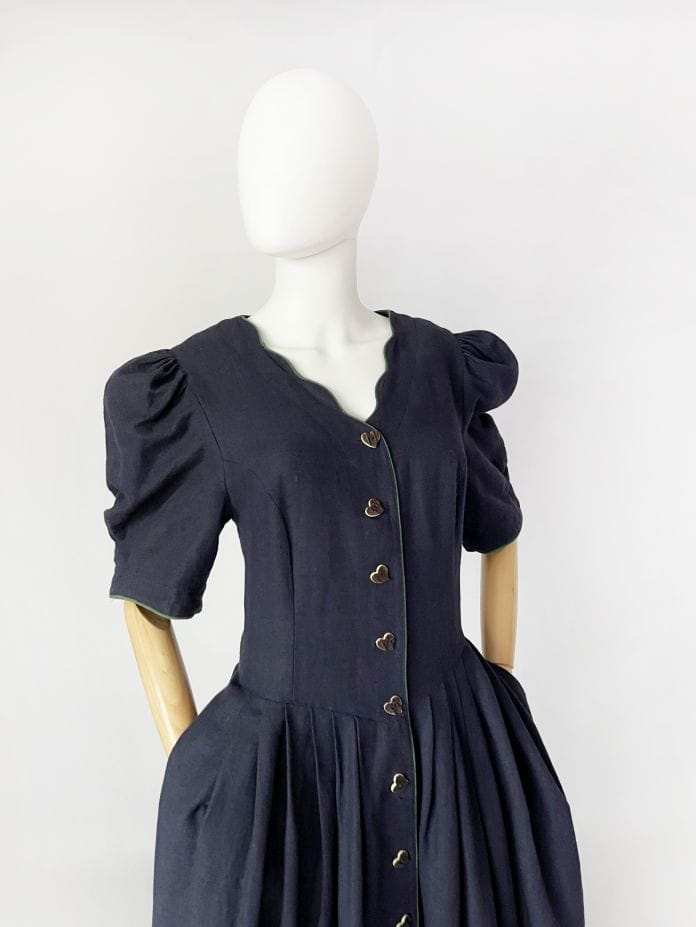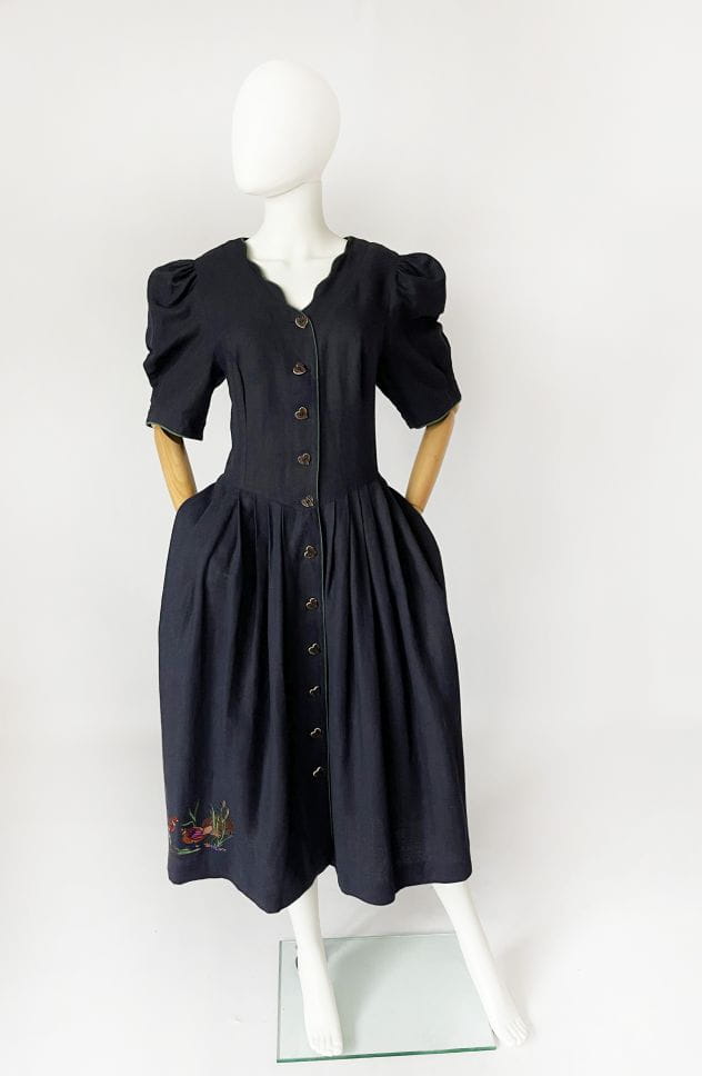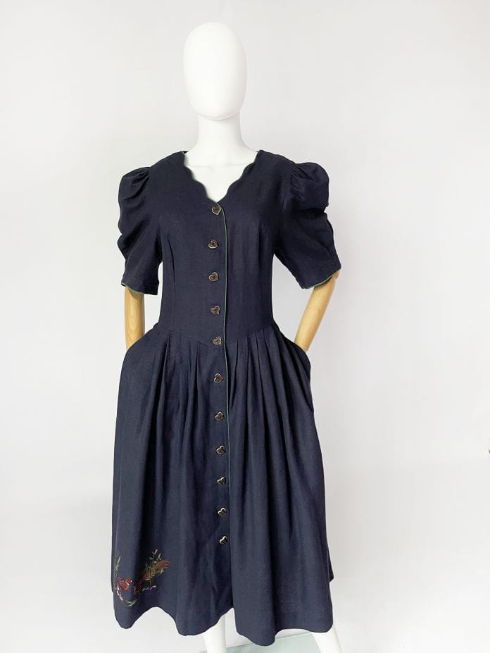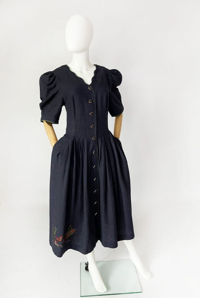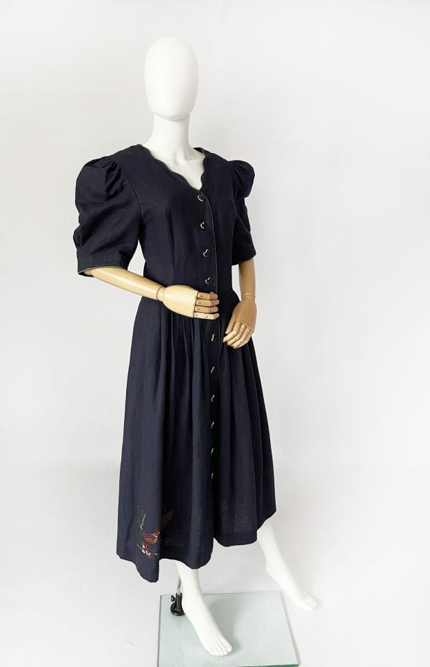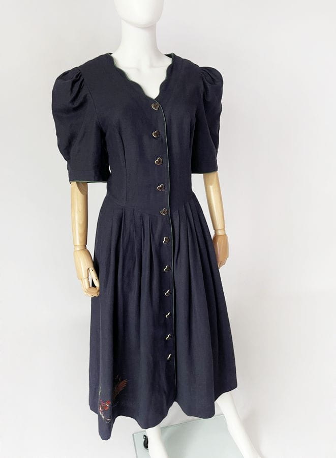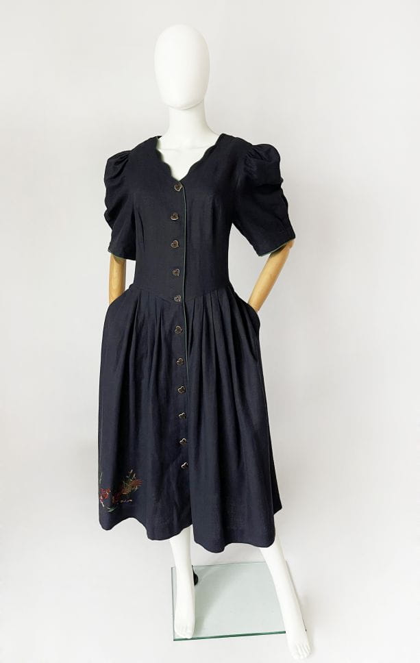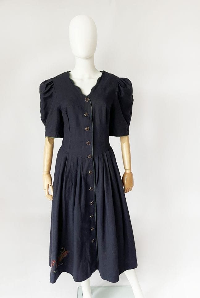 Przepiękna bawarska sukienka vintage marki Berwin&Wolf. Wykonana z lniano-bawełnianego płótna w kolorze granatowym. Dopasowana góra z krótkimi, bufiastymi rękawami. Spódnica rozkloszowana, rozłożysta, z wsuwanymi kieszeniami w bocznych szwach. W pasie zaszewki. U dołu urocza, dyskretna haftowana aplikacja. Zapinana na spore guziki - serca.