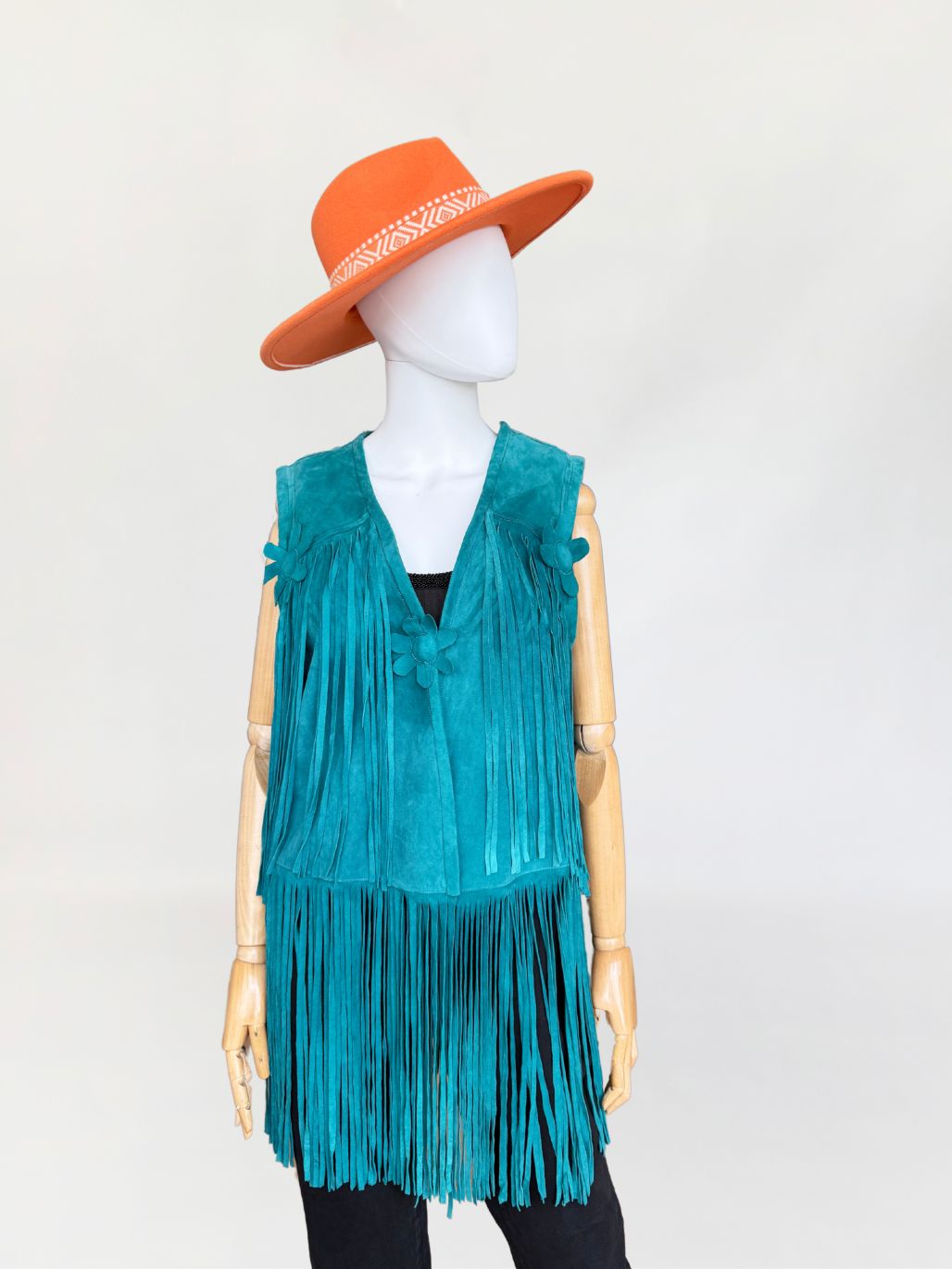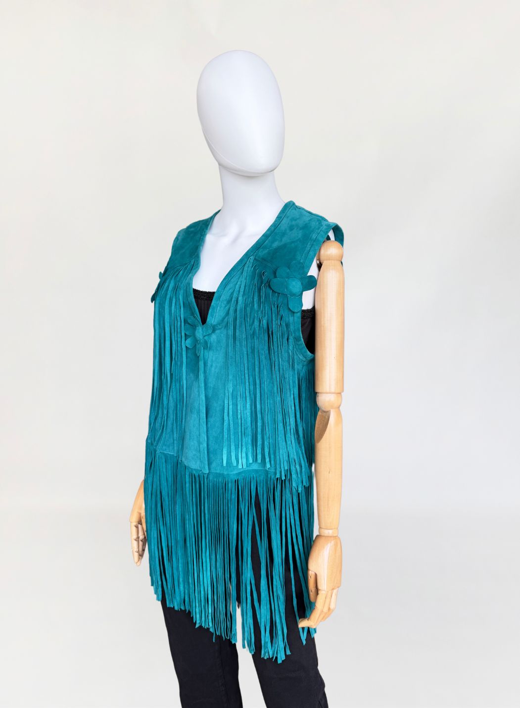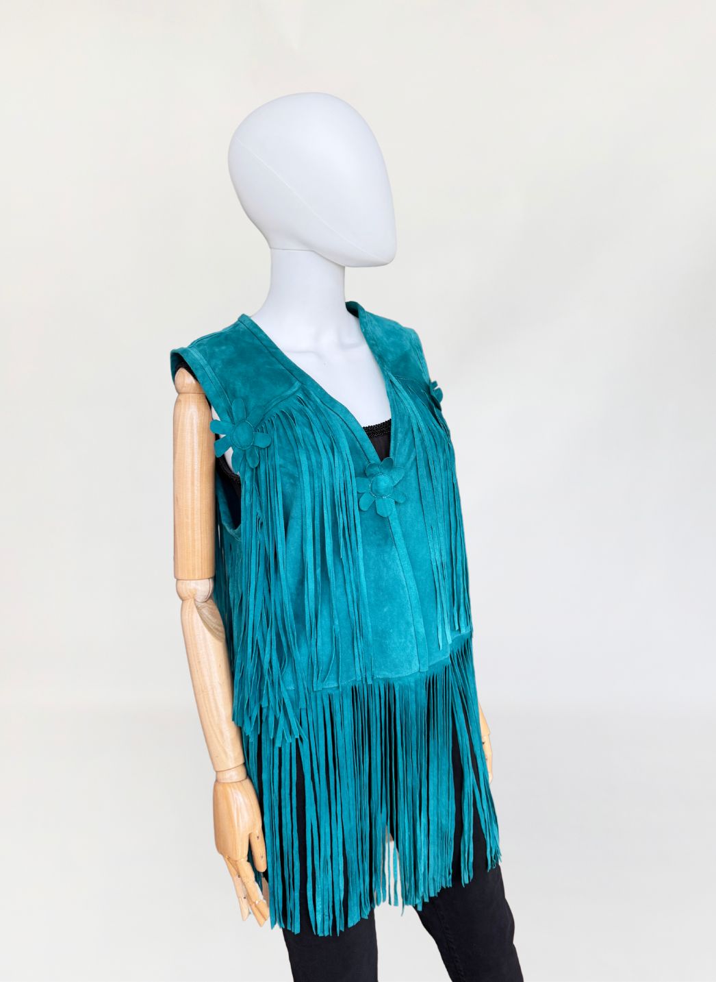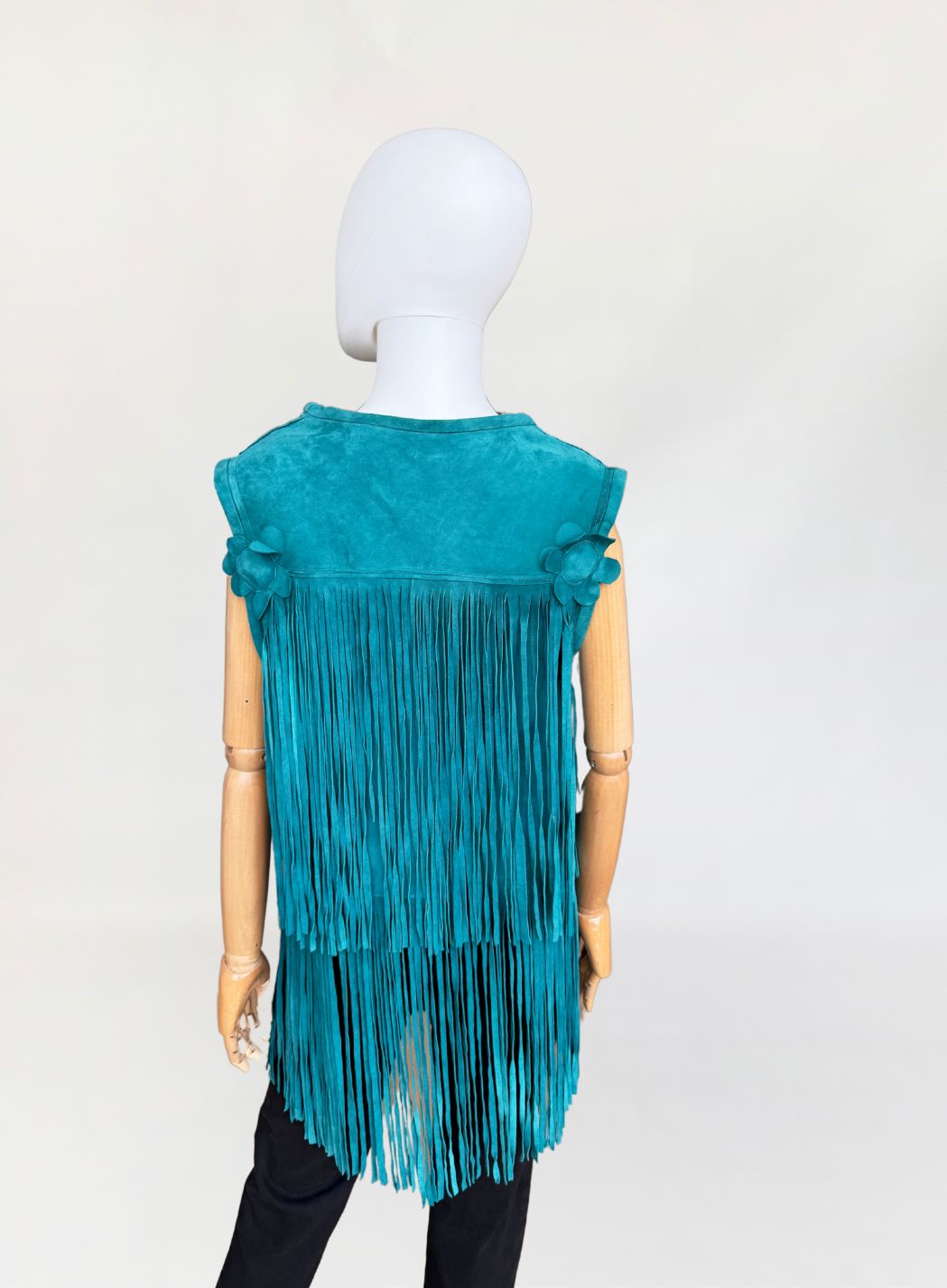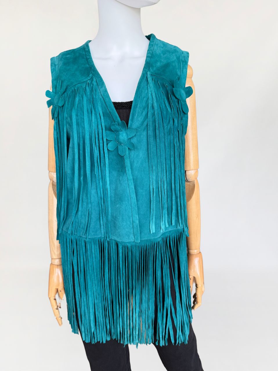 Kamizelka vintage w stylu lat 70-tych. Wykonana z miękkiego zamszu w morskim turkusowym odcieniu. Wykończona kwiatowymi zamszowymi aplikacjami i długimi wirującymi frędzlami wszytymi w górnej i dolnej części. Zapinana na haftkę w pasie.