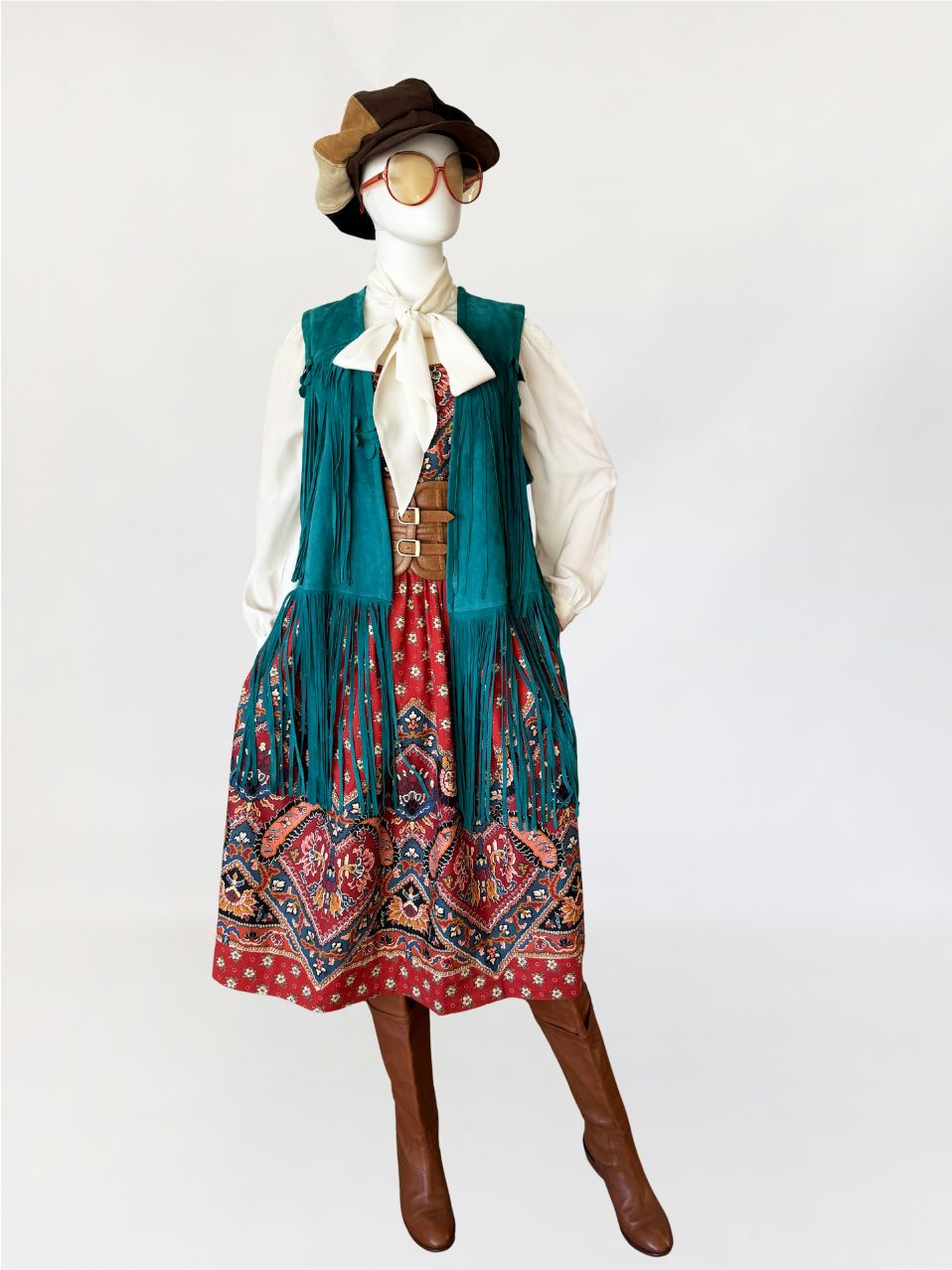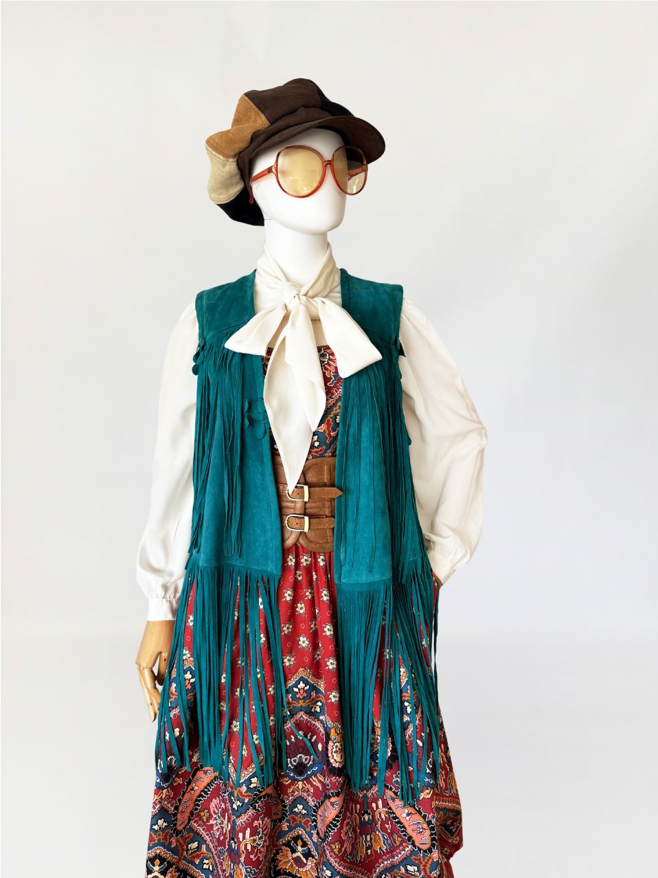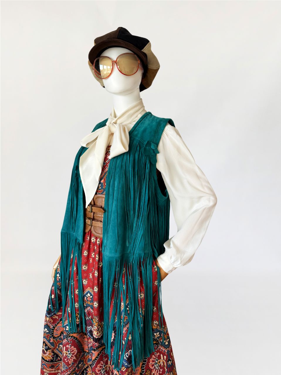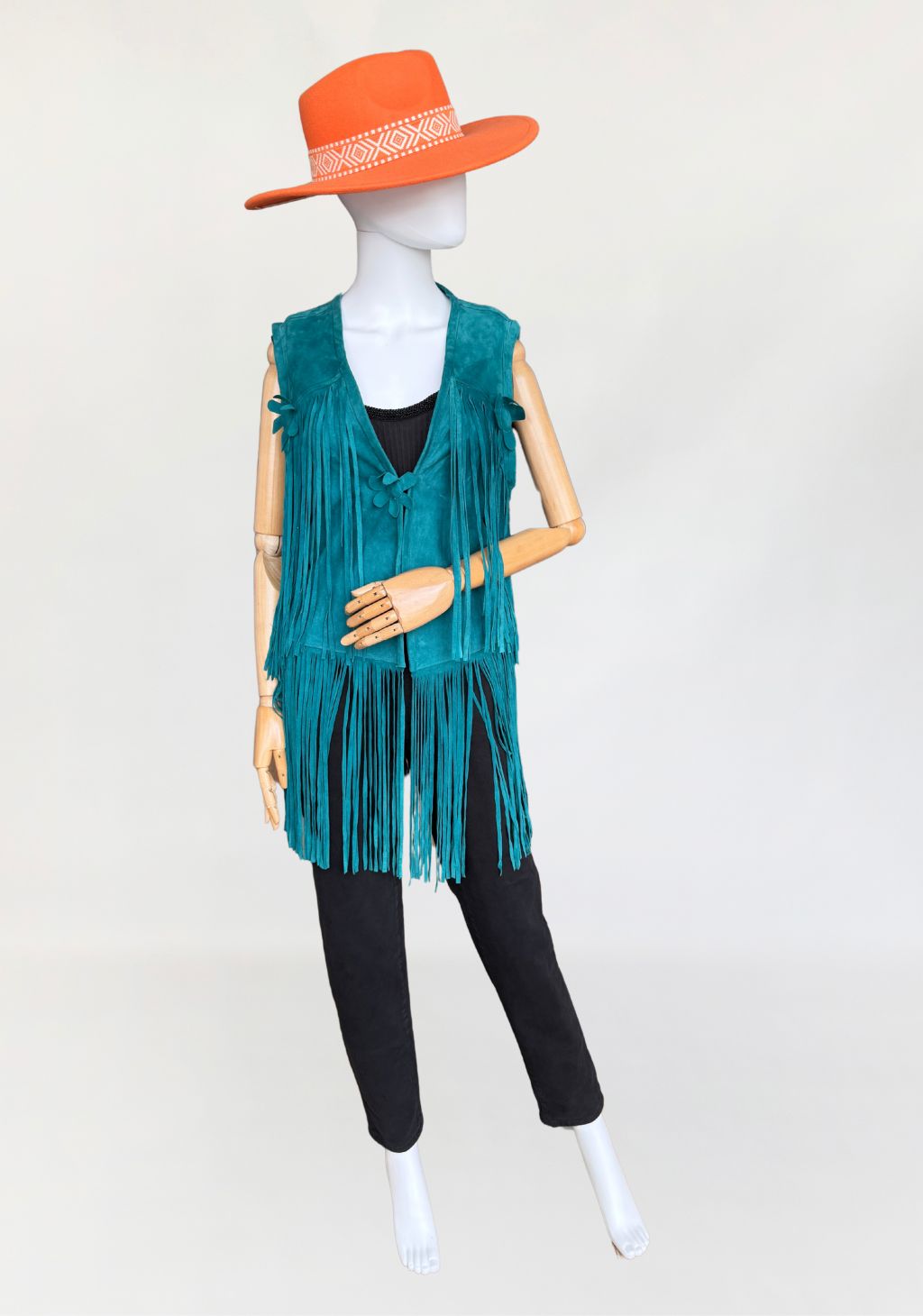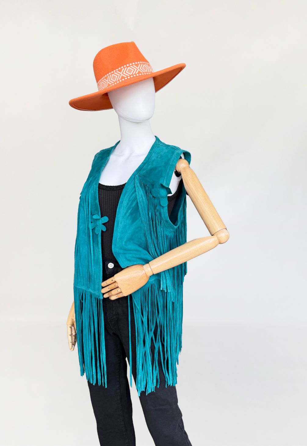 Kamizelka vintage w stylu lat 70-tych. Wykonana z miękkiego zamszu w morskim turkusowym odcieniu. Wykończona kwiatowymi zamszowymi aplikacjami i długimi wirującymi frędzlami wszytymi w górnej i dolnej części. Zapinana na haftkę w pasie.