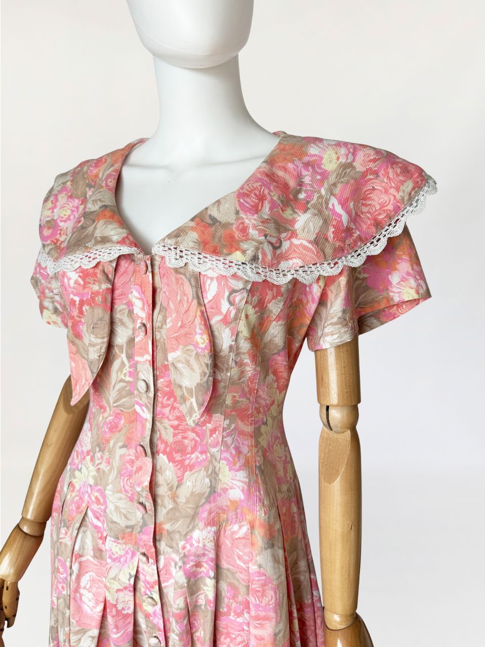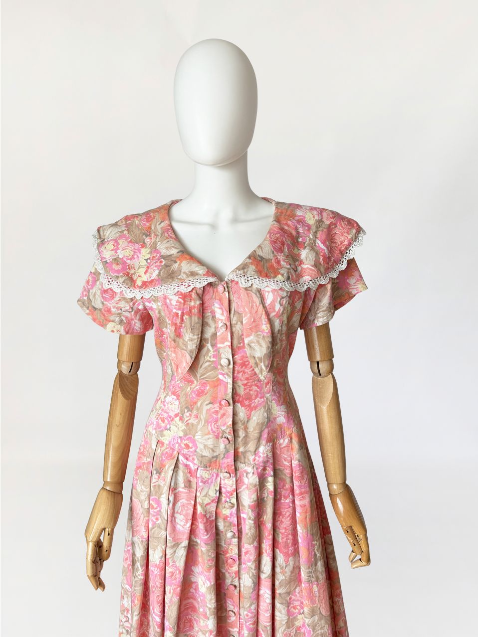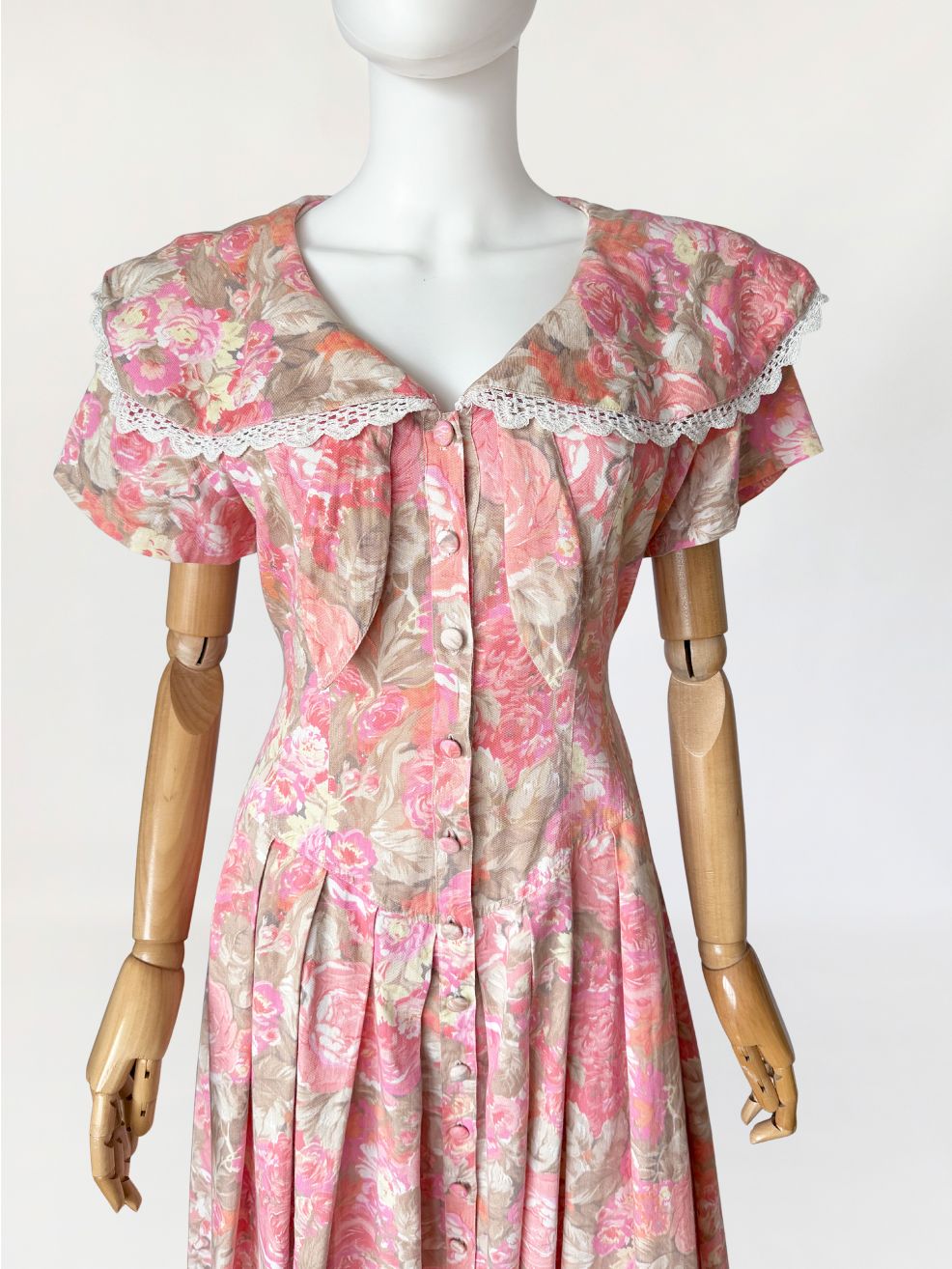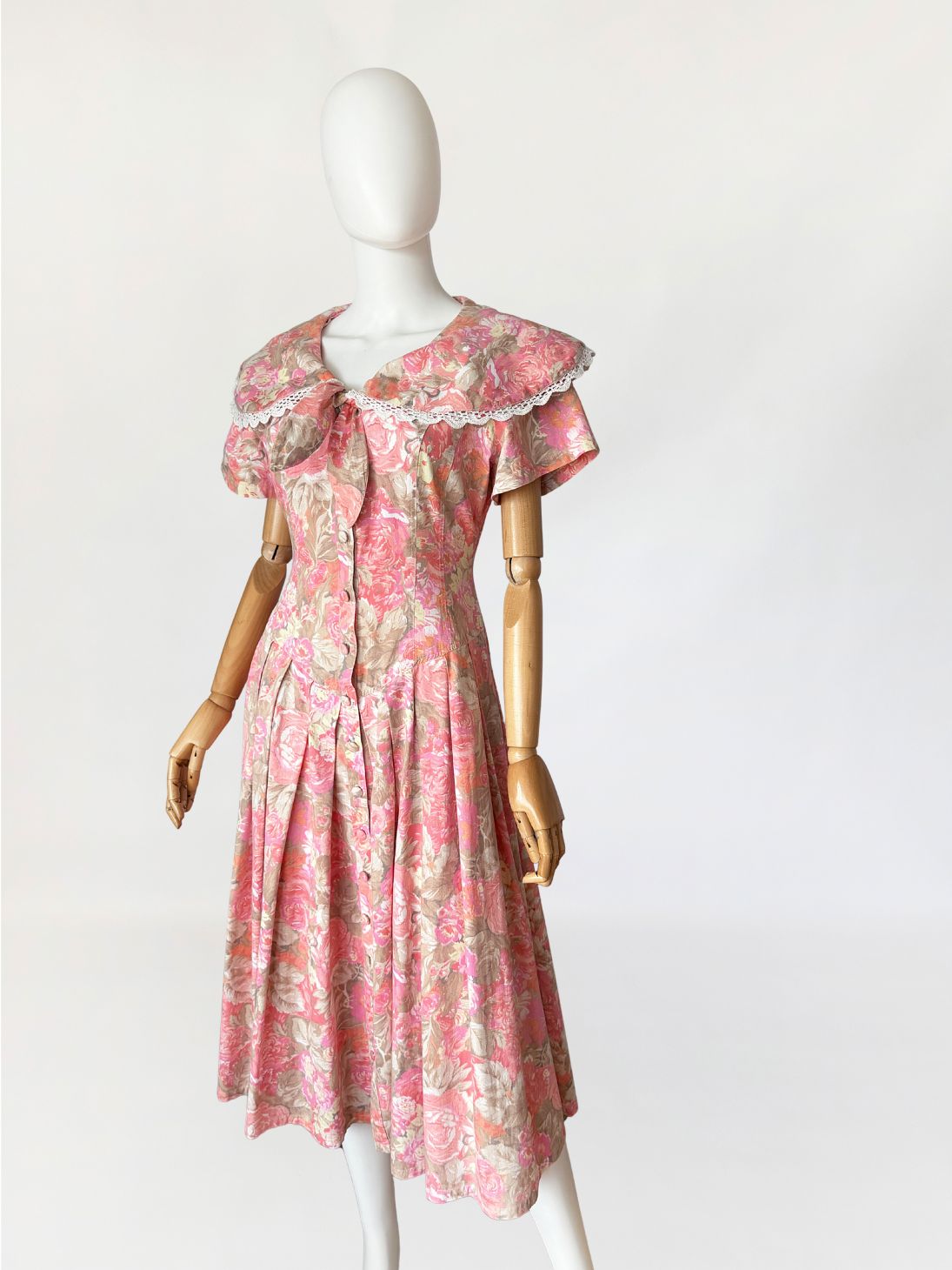 Sukienka vintage wykonana z bawełnianej tkaniny w wielotonowym nadruku kwiatowym utrzymanym w odcieniach różu, beżu i przygaszonej pomarańczy. Góra dopasowana, modelowana pionowymi cięciami, zapinana na rząd powlekanych tkaniną guzików. Dekolt w kształcie litery V, wykończony szerokim, rozkładanym kołnierzem typu pelerynowego, obszytym dekoracyjną koronką. Pod kołnierzem wszyte wiązanie tworzące miękką kokardę. Fason utrzymany w estetyce charakterystycznej dla modeli w stylu Laura Ashley. Rękawy krótkie, talia wyraźnie zaznaczona, przechodząca w dół o zwiększonej objętości. Spódnica układana w głębokie zakładki, zapewniające pełniejsze rozłożenie tkaniny.
