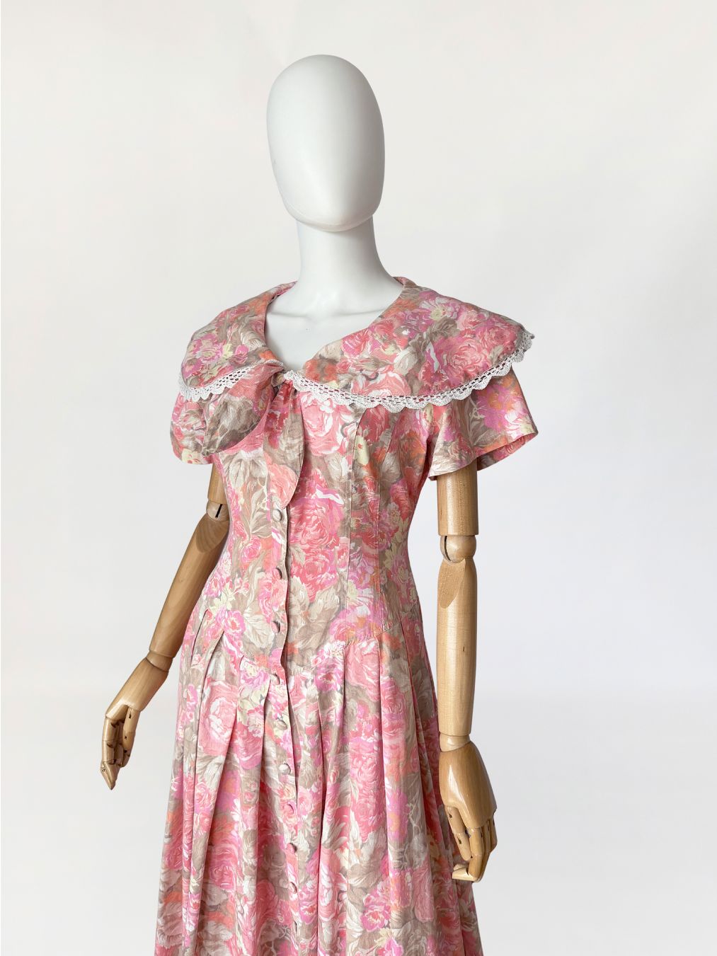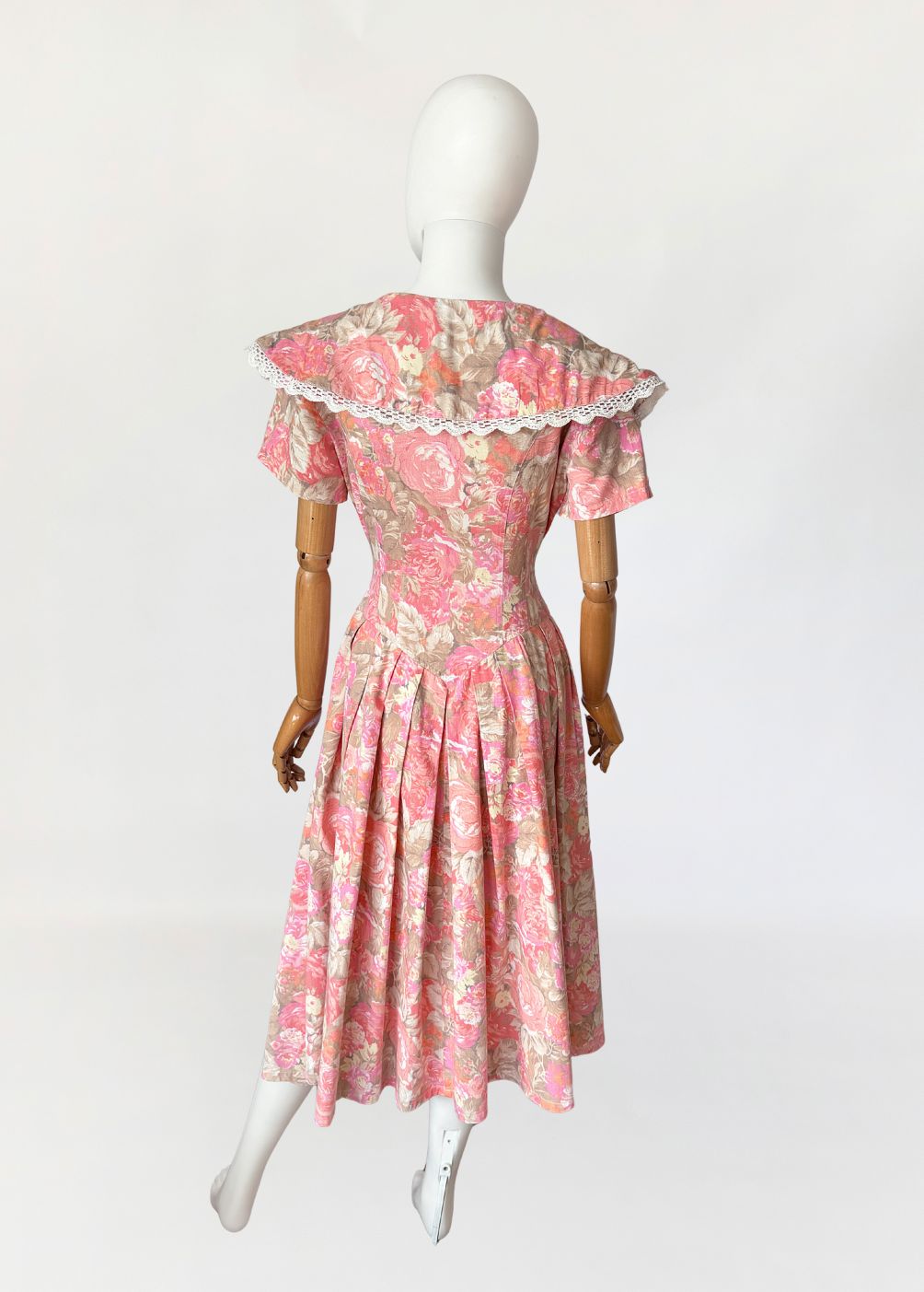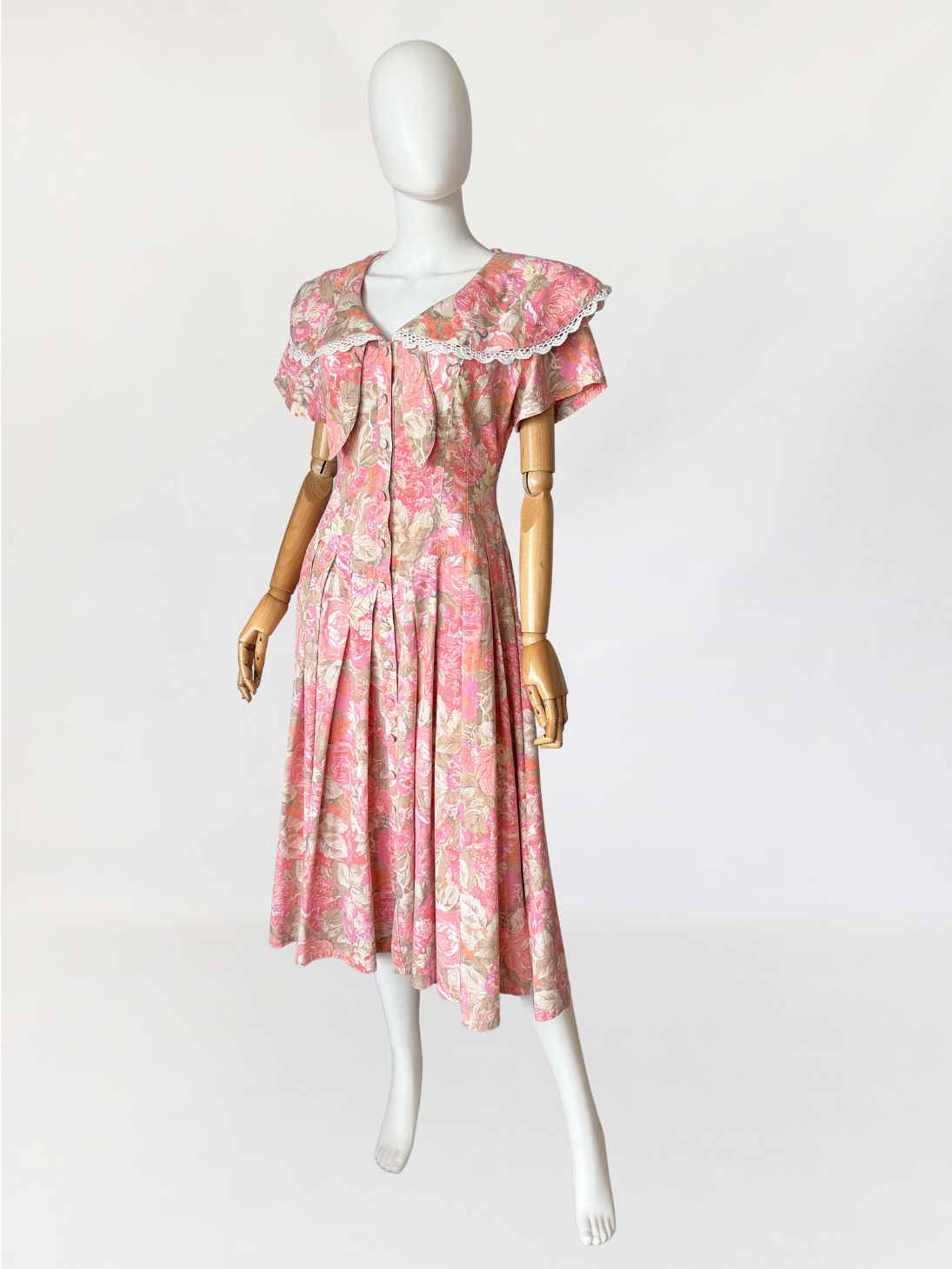 Sukienka vintage wykonana z bawełnianej tkaniny w wielotonowym nadruku kwiatowym utrzymanym w odcieniach różu, beżu i przygaszonej pomarańczy. Góra dopasowana, modelowana pionowymi cięciami, zapinana na rząd powlekanych tkaniną guzików. Dekolt w kształcie litery V, wykończony szerokim, rozkładanym kołnierzem typu pelerynowego, obszytym dekoracyjną koronką. Pod kołnierzem wszyte wiązanie tworzące miękką kokardę. Fason utrzymany w estetyce charakterystycznej dla modeli w stylu Laura Ashley. Rękawy krótkie, talia wyraźnie zaznaczona, przechodząca w dół o zwiększonej objętości. Spódnica układana w głębokie zakładki, zapewniające pełniejsze rozłożenie tkaniny.
