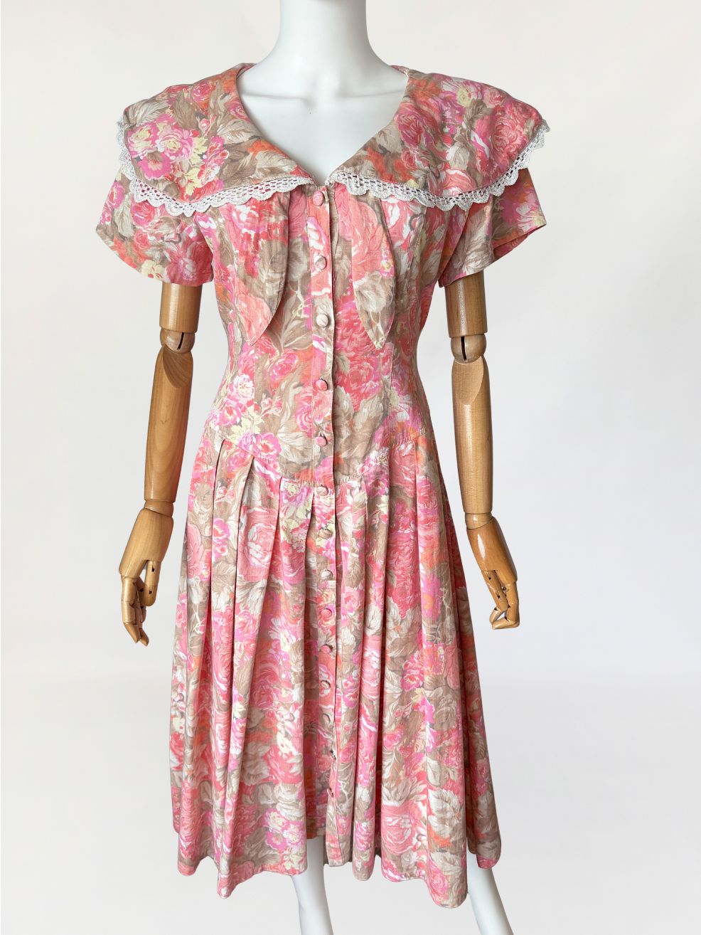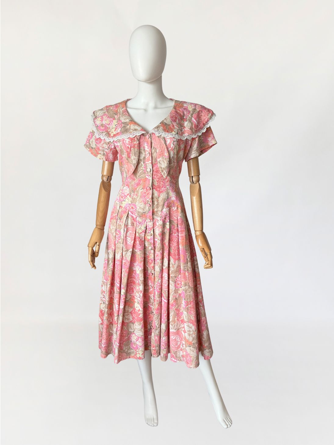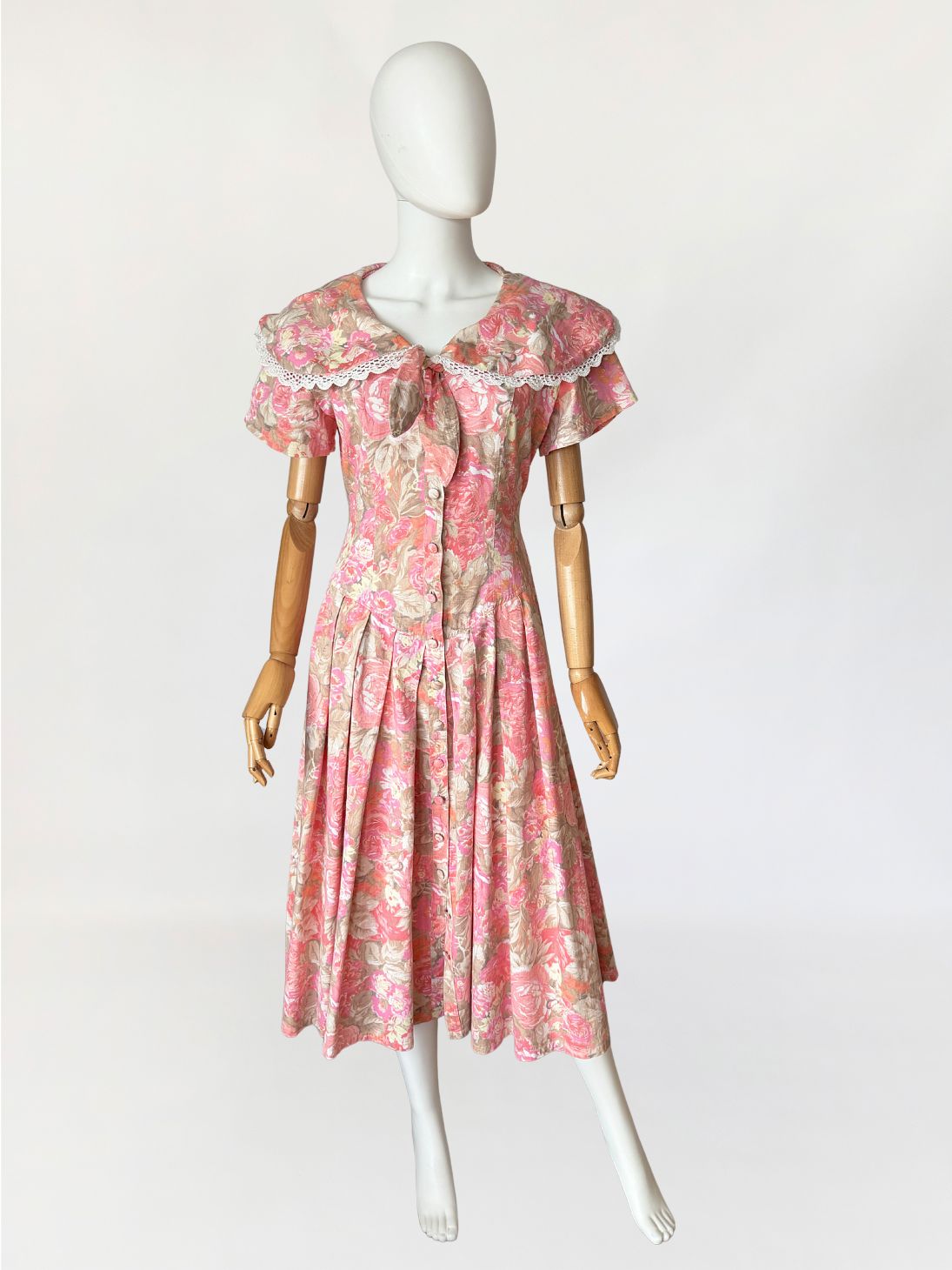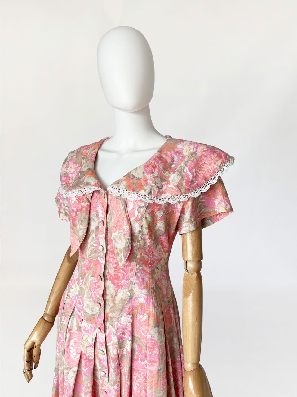 Sukienka vintage wykonana z bawełnianej tkaniny w wielotonowym nadruku kwiatowym utrzymanym w odcieniach różu, beżu i przygaszonej pomarańczy. Góra dopasowana, modelowana pionowymi cięciami, zapinana na rząd powlekanych tkaniną guzików. Dekolt w kształcie litery V, wykończony szerokim, rozkładanym kołnierzem typu pelerynowego, obszytym dekoracyjną koronką. Pod kołnierzem wszyte wiązanie tworzące miękką kokardę. Fason utrzymany w estetyce charakterystycznej dla modeli w stylu Laura Ashley. Rękawy krótkie, talia wyraźnie zaznaczona, przechodząca w dół o zwiększonej objętości. Spódnica układana w głębokie zakładki, zapewniające pełniejsze rozłożenie tkaniny.