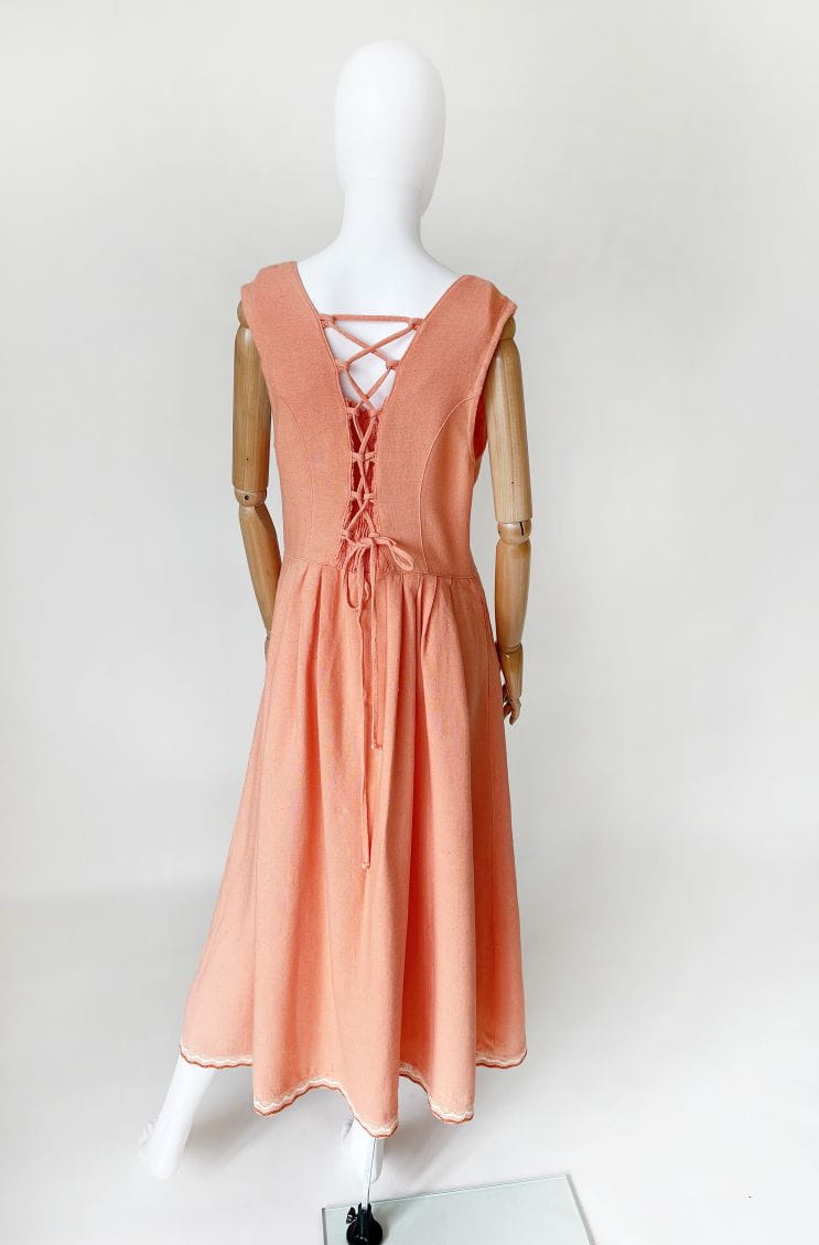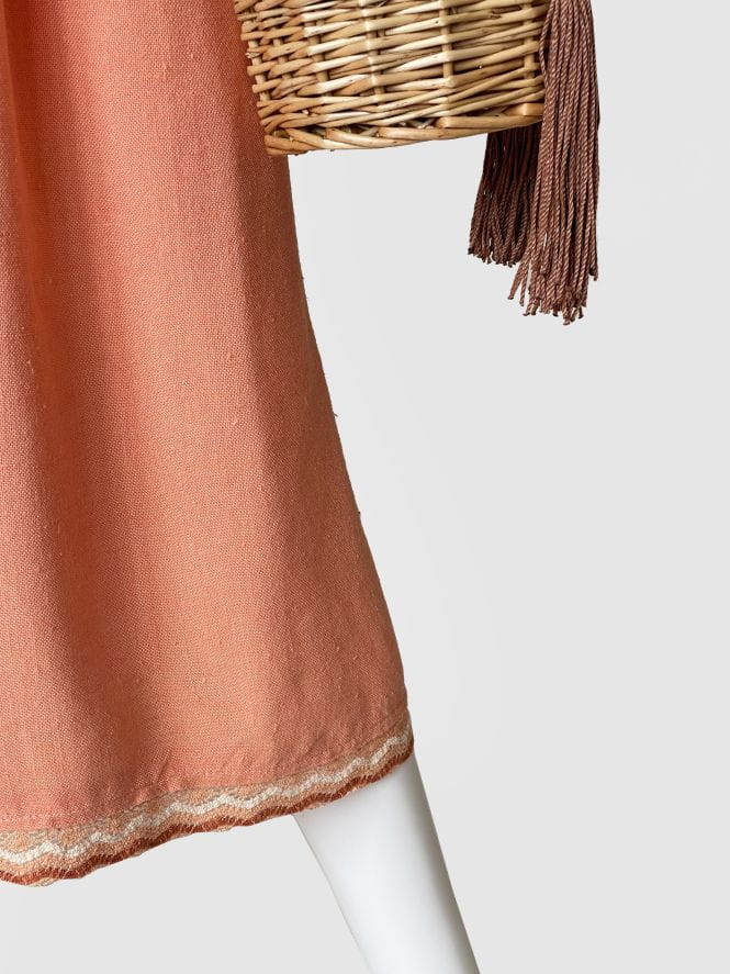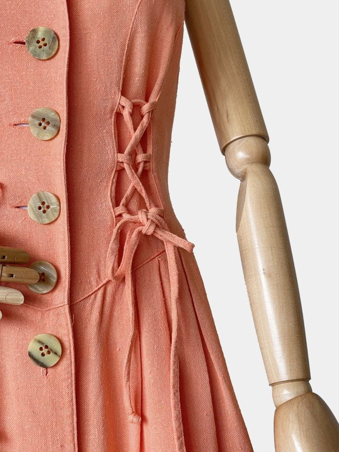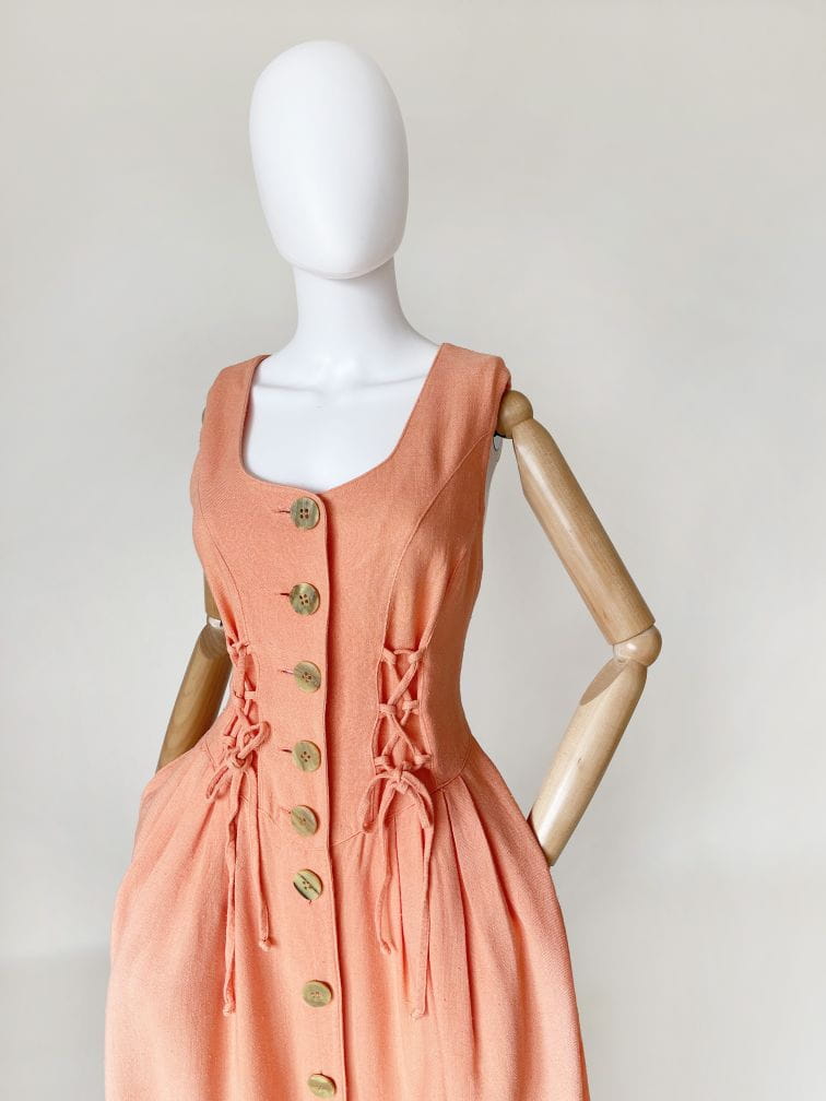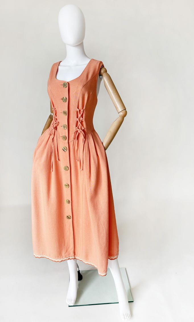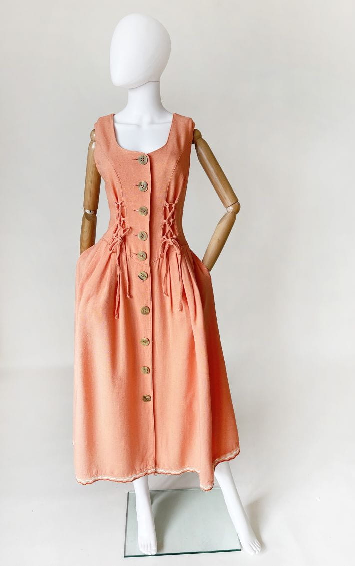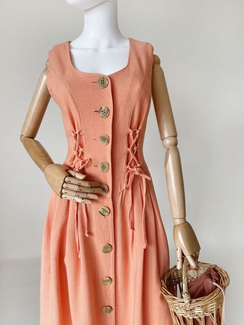 Długa rozpinana sukienka vintage uszyta z wiskozowo-lnianej tkaniny w kolorze brzoskwiniowym. Góra bez rękawów, obwód można regulować wspomagając się sznurowaniem na plecach, oraz po bokach. W dolnej części rozkloszowana spódnica z wsuwanymi kieszeniami. Wykończona koronkową tasiemką.