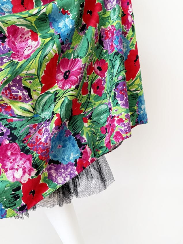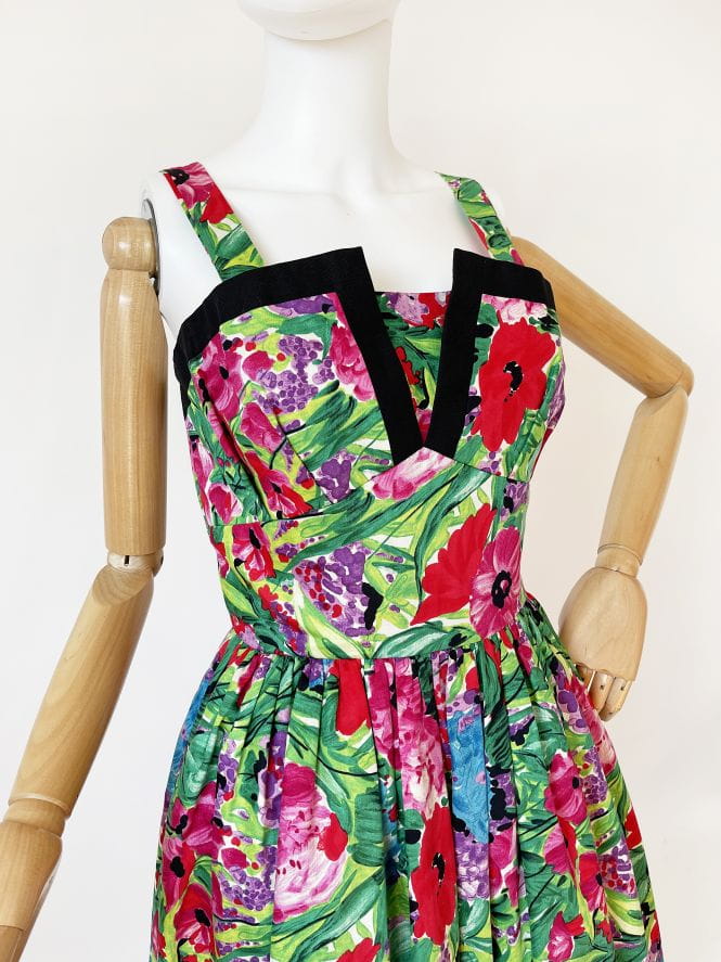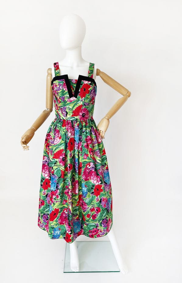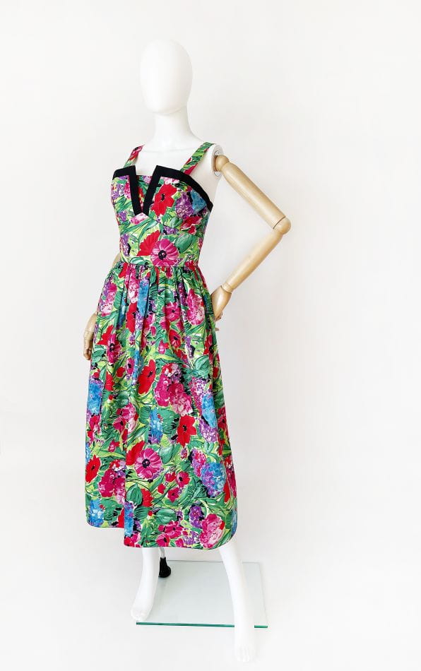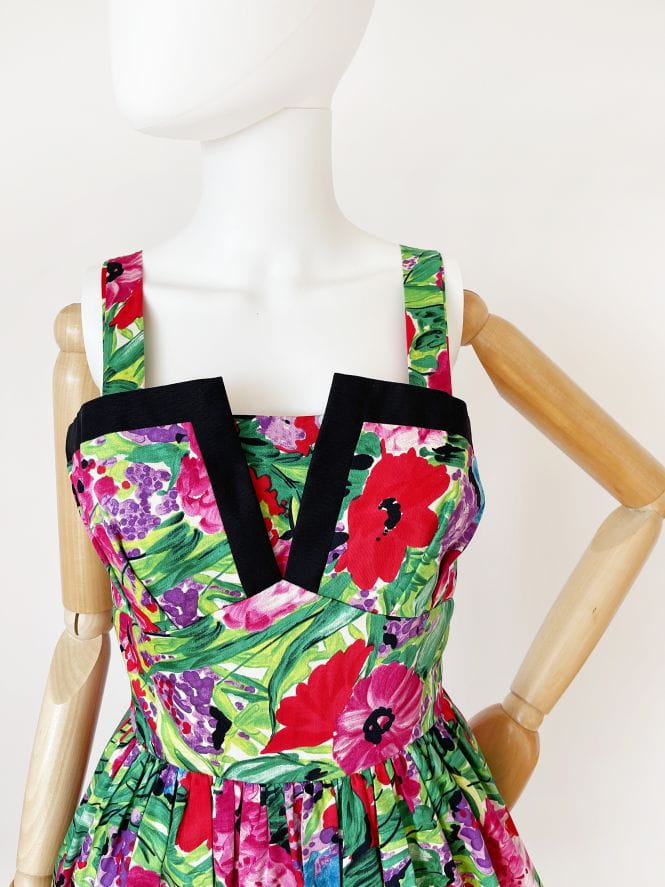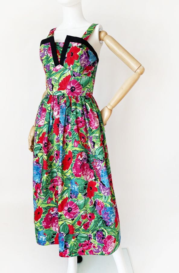 Sukienka vintage z lat 80-tych projektu duetu Trina Lewis & Marjon Couture dla marki Baker Sports. Model w stylu lat 50-tych, wykonany z bawełnianej tkaniny o kwiatowym malowanym deseniu w mocnych, wyraźnych barwach. Gorsetowa dopasowana góra usztywniana fiszbinami z mocno rozkloszowanym dołem, który naturalnie unosi się za sprawą podszytej tiulem podszewki. Ramiączka były przez kogoś lekko skracane, mają trochę zapasu i bez problemu można je ponownie obniżyć.
