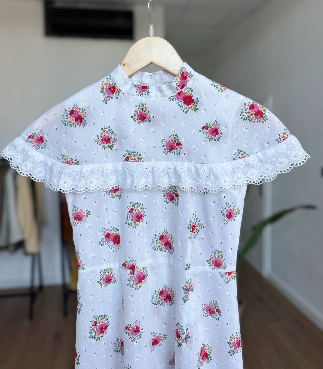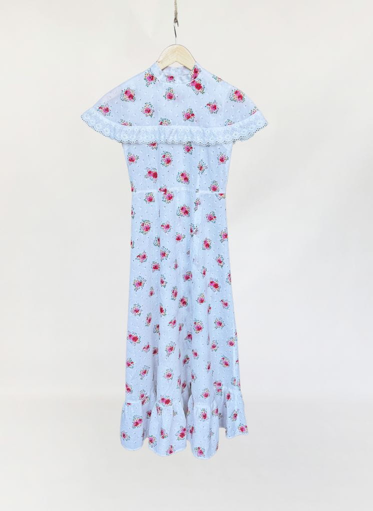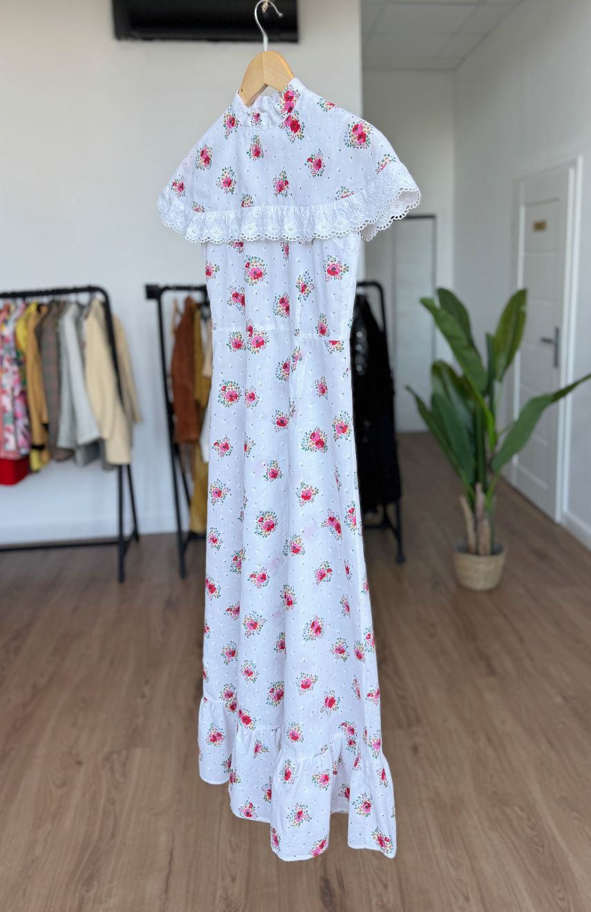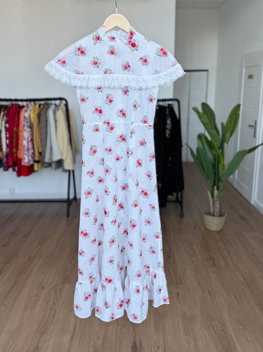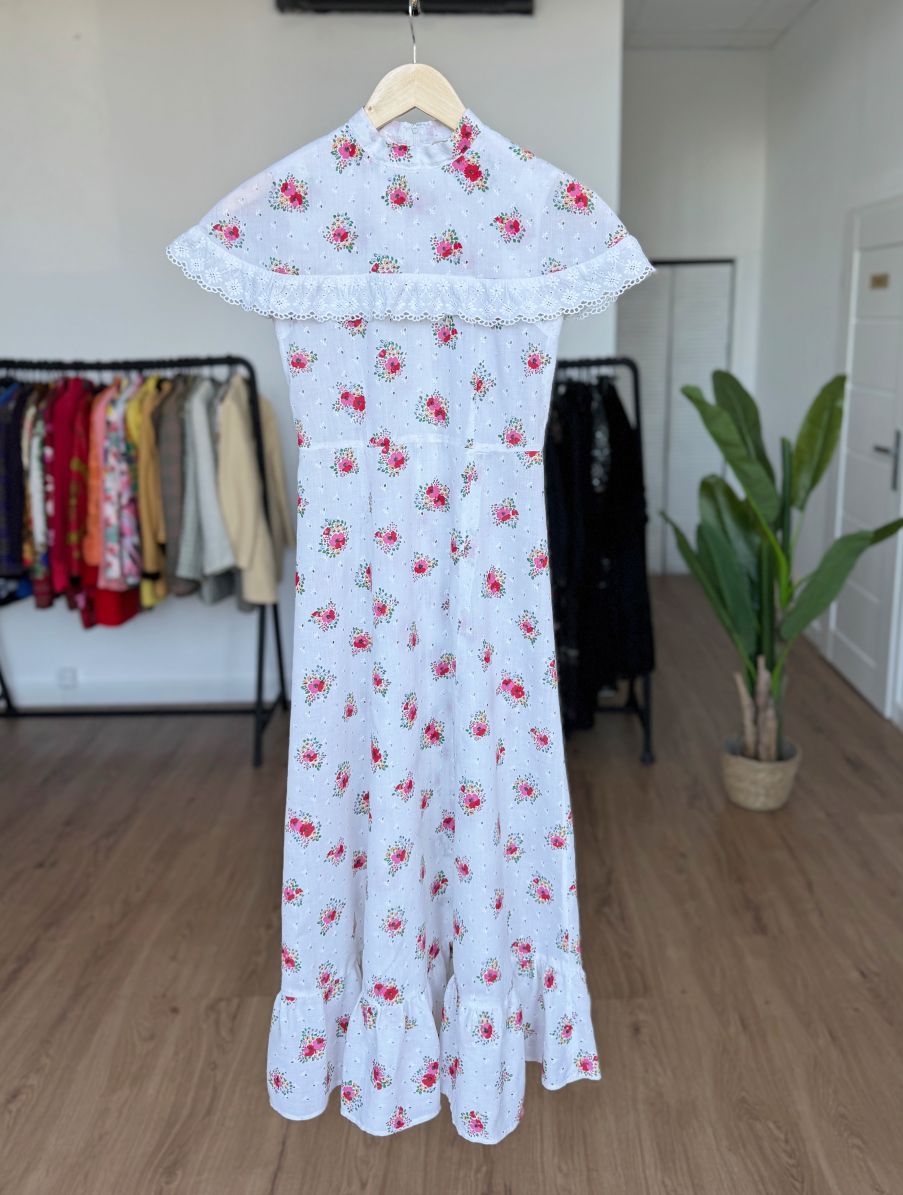 Sukienka vintage z lat 70-tych uszyta z bawełnianej tkaniny zdobionej subtelnym haftem richelieu i kwiatowymi printami. Model o długości maxi i klasycznym kroju A-line. Góra sukienki bez rękawów, na ramionach spoczywa dodatkowa wierzchnia warstwa tkaniny, wszyta od stójki i wykończona ażurową lamówką. Zasuwana na kryty zamek na plecach.