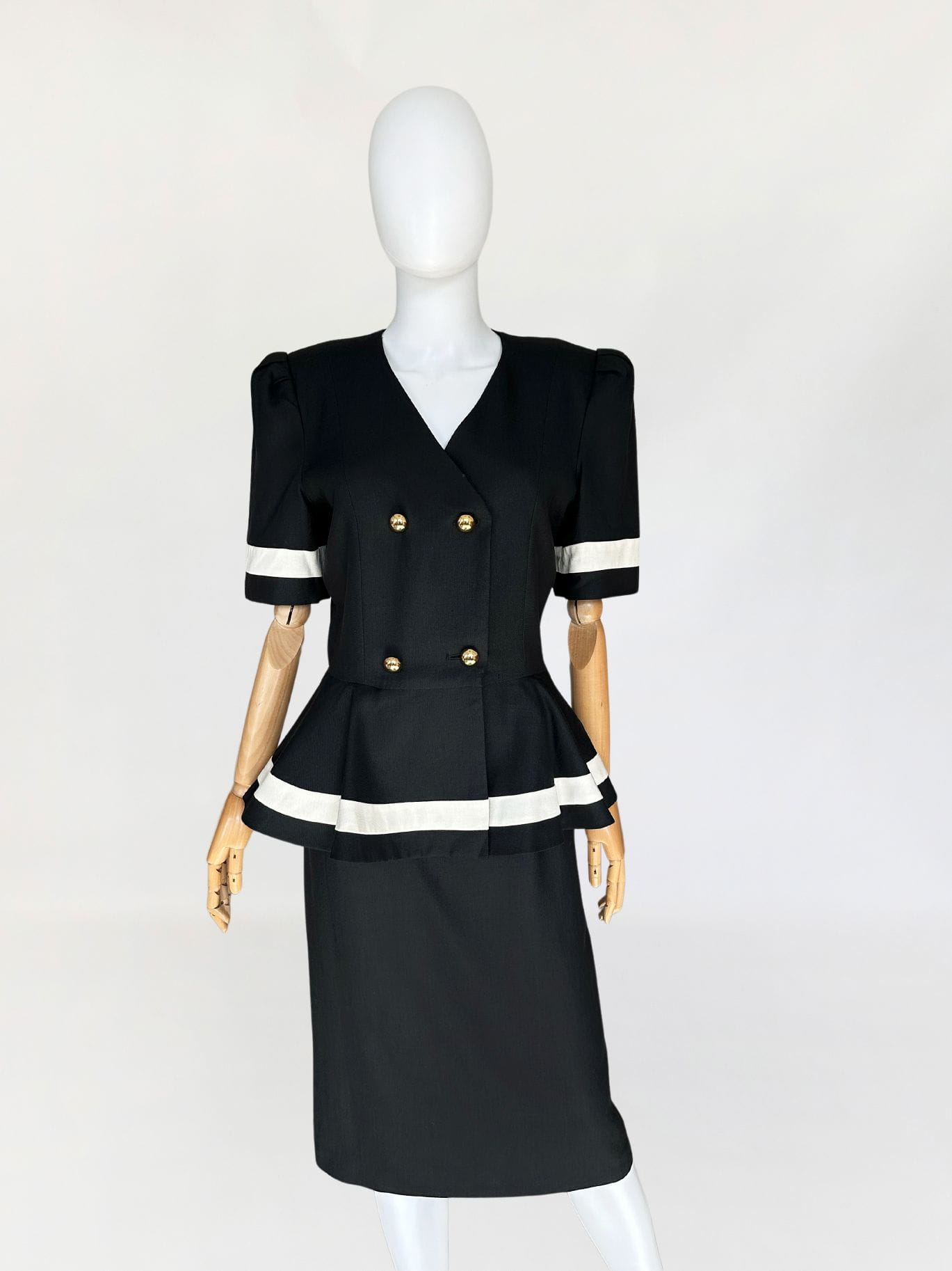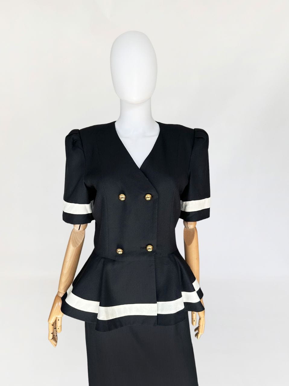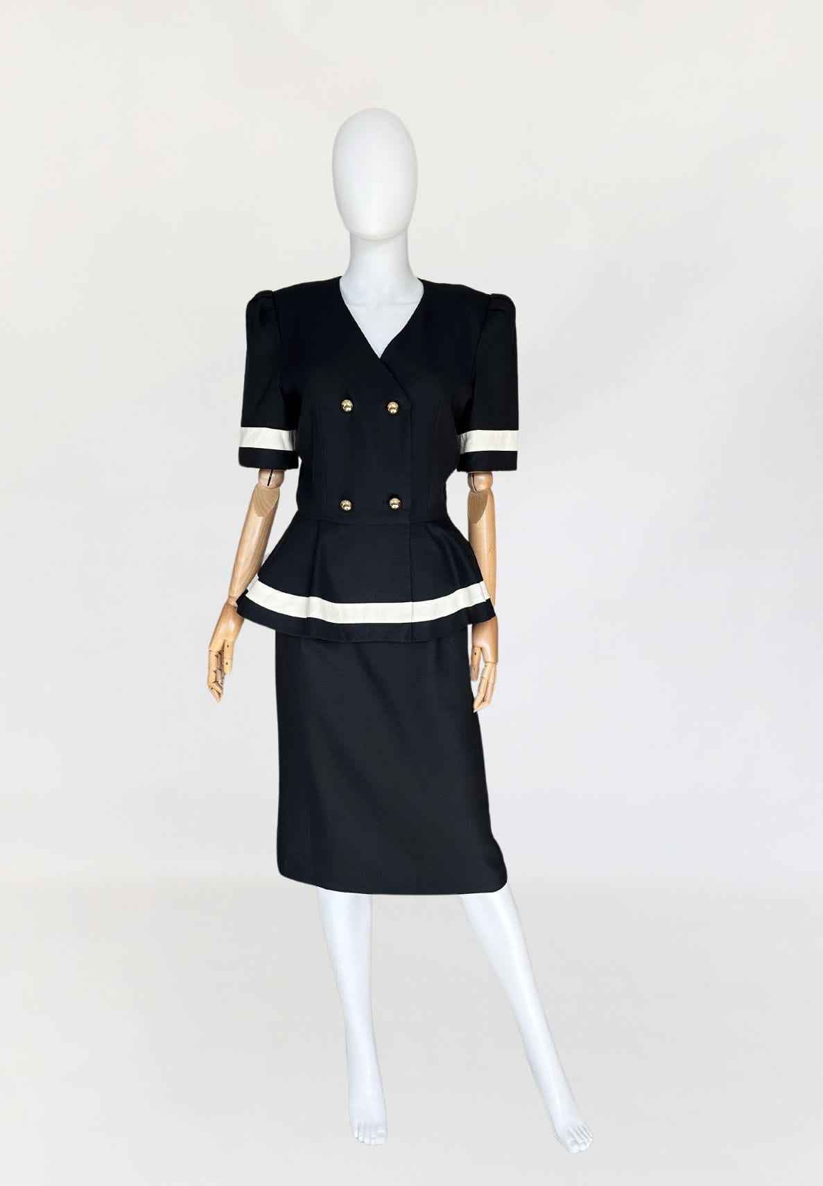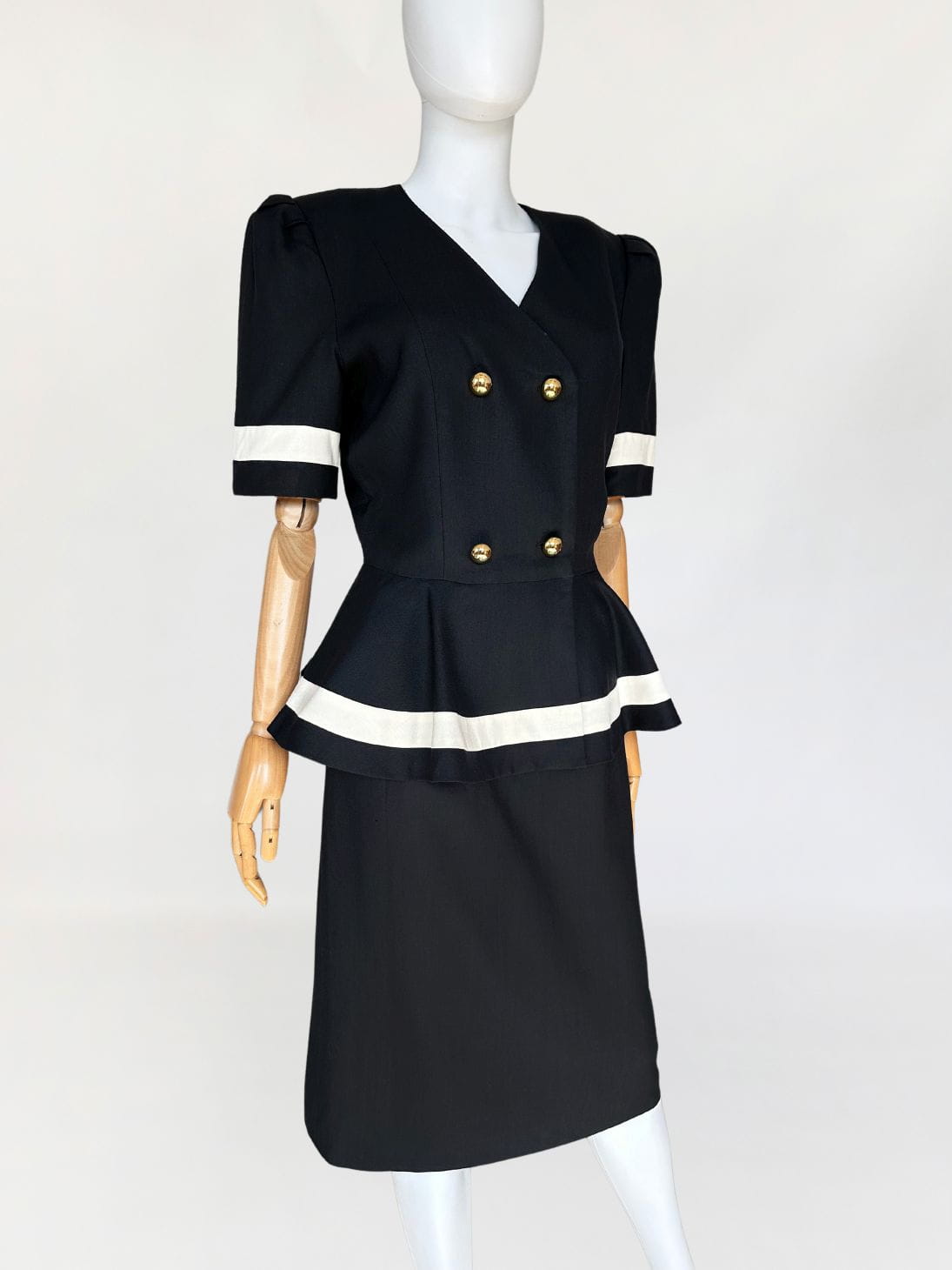 Długa sukienka vintage z lat 90-tych. Model w klimatach kolekcji od Chanel z lat 80-tych/90-tych, my widzimy w niej Julie Roberts w "Pretty Woman". Dwurzędowa góra zapinana kopertowo na duże złote guziki. W pasie duża baskinka z zakładkami, lekko opadająca na biodra. Spódnica o prostym, klasycznym fasonie z rozporkiem z tyłu.