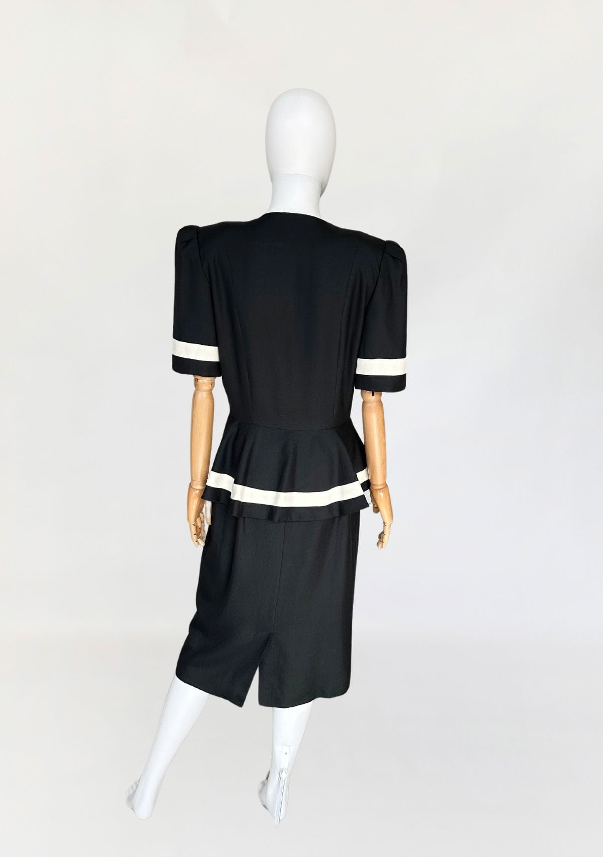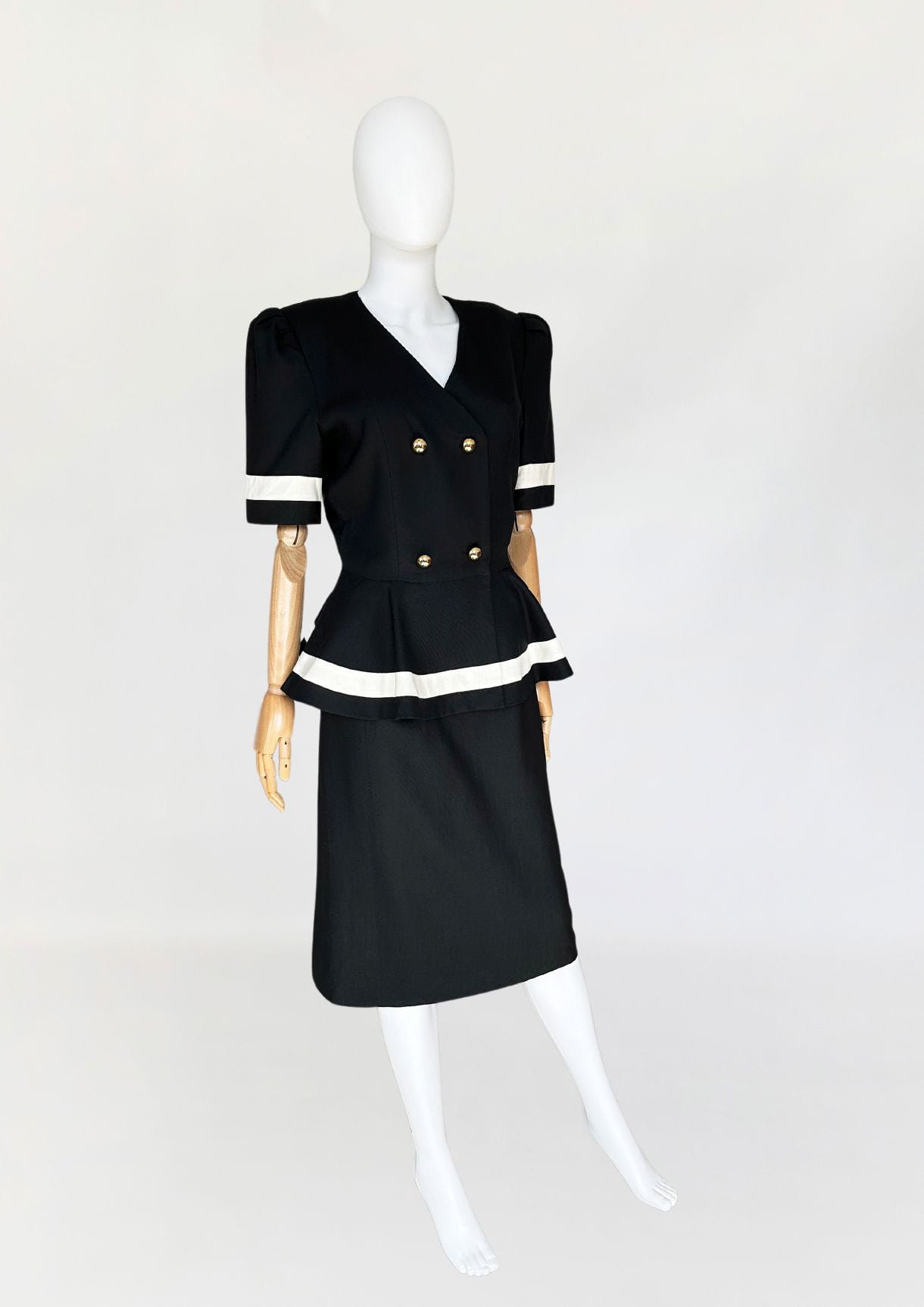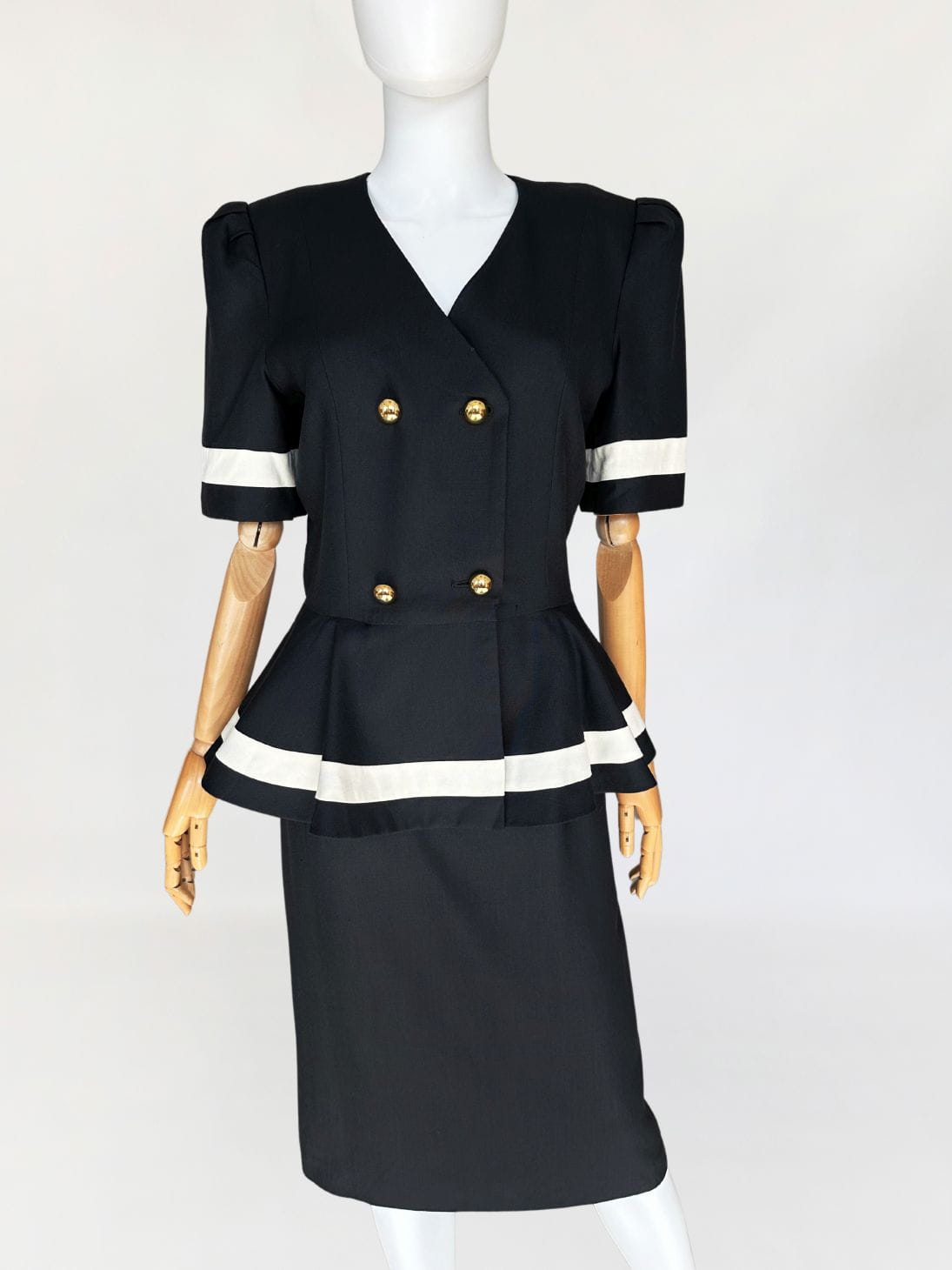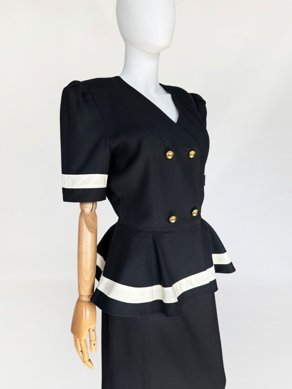 Długa sukienka vintage z lat 90-tych. Model w klimatach kolekcji od Chanel z lat 80-tych/90-tych, my widzimy w niej Julie Roberts w "Pretty Woman". Dwurzędowa góra zapinana kopertowo na duże złote guziki. W pasie duża baskinka z zakładkami, lekko opadająca na biodra. Spódnica o prostym, klasycznym fasonie z rozporkiem z tyłu.