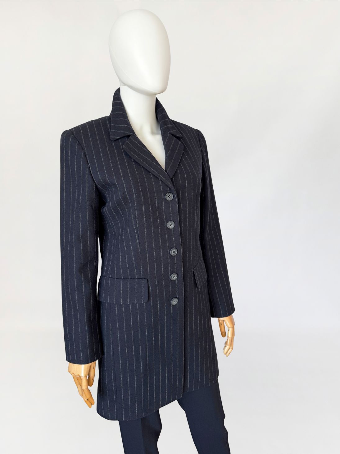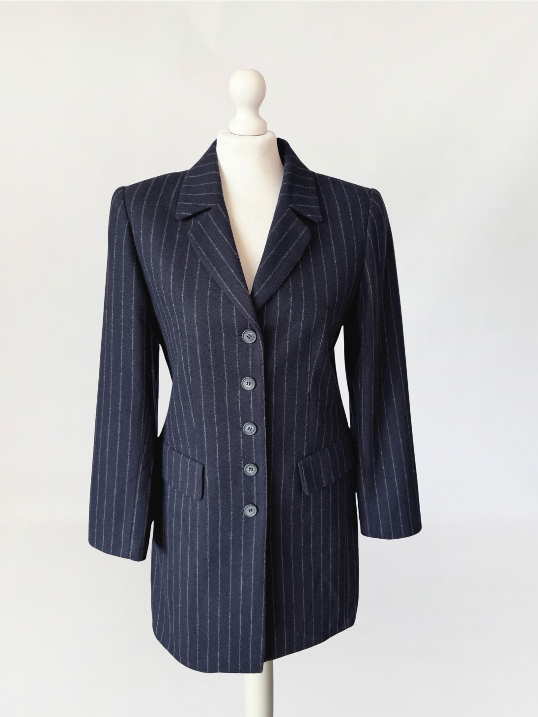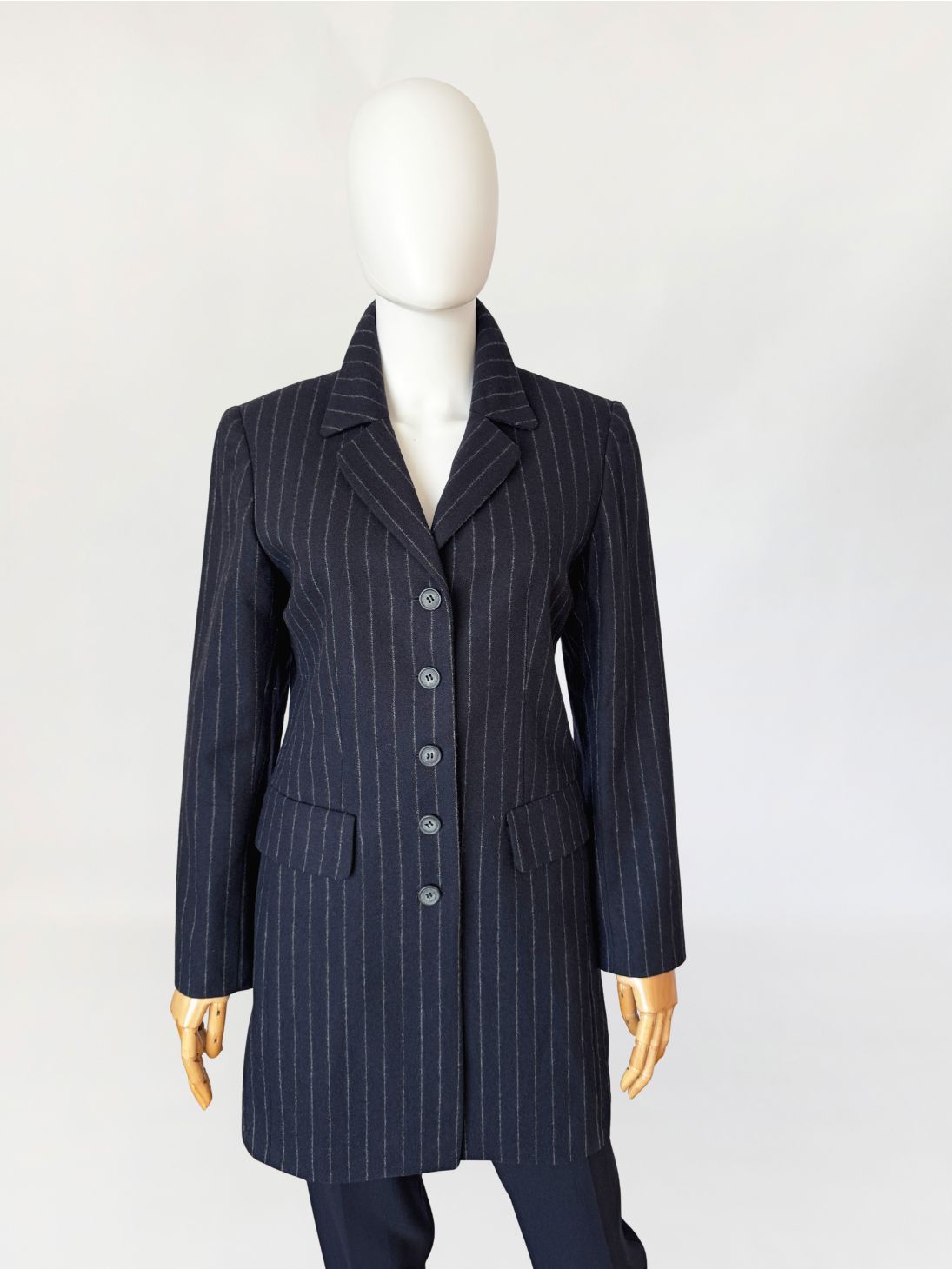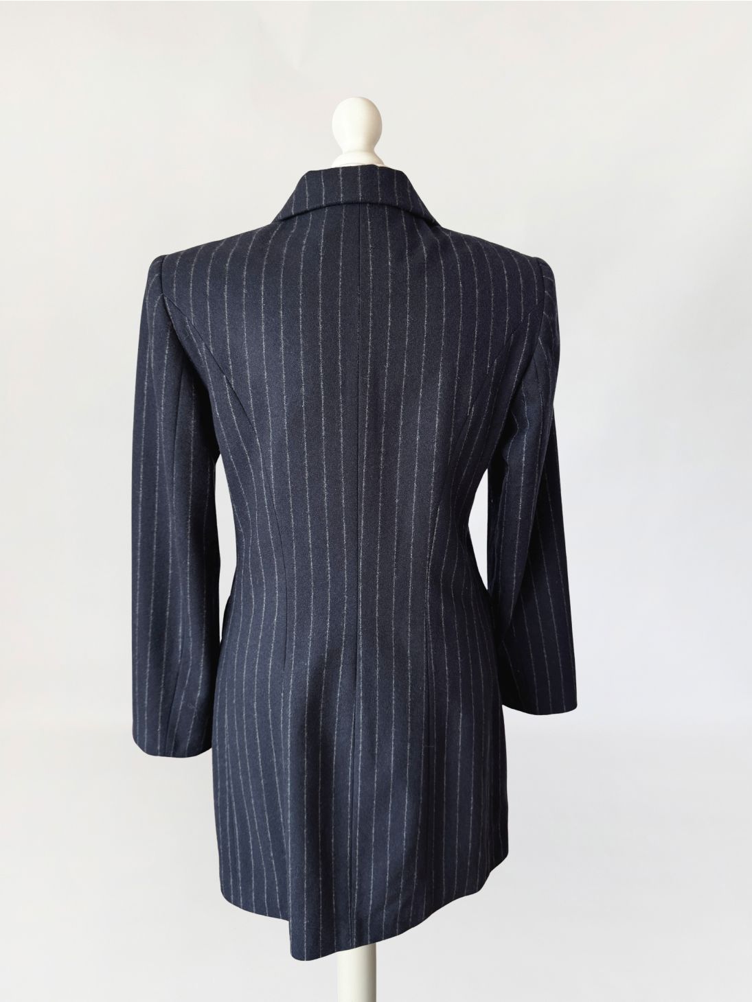 Włoska marynarka vintage o dłuższym taliowanym fasonie wykonana w całości z wełnianej tkaniny w atramentowo-grafitowym odcieniu z pionowymi prążkami o regularnym rytmie. Model o mocno wydłużonej linii z wyraźnie ukształtowaną talią podkreśloną cięciami konstrukcyjnymi. U góry nieduży kołnierz. Front zapinany na rząd guzików w tonacji dopasowanej do tkaniny. Kieszenie wpuszczane z patkami, wkomponowane w linię prążków. Rękawy długie, klasycznie wszyte, o prostej formie, dobrze wyprofilowane, lekko usztywnione ramiona.