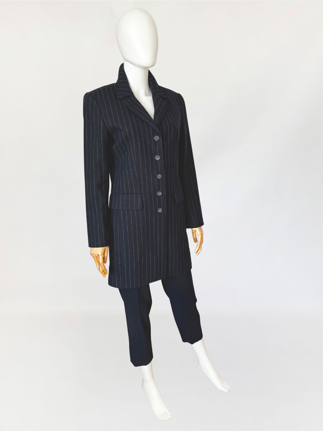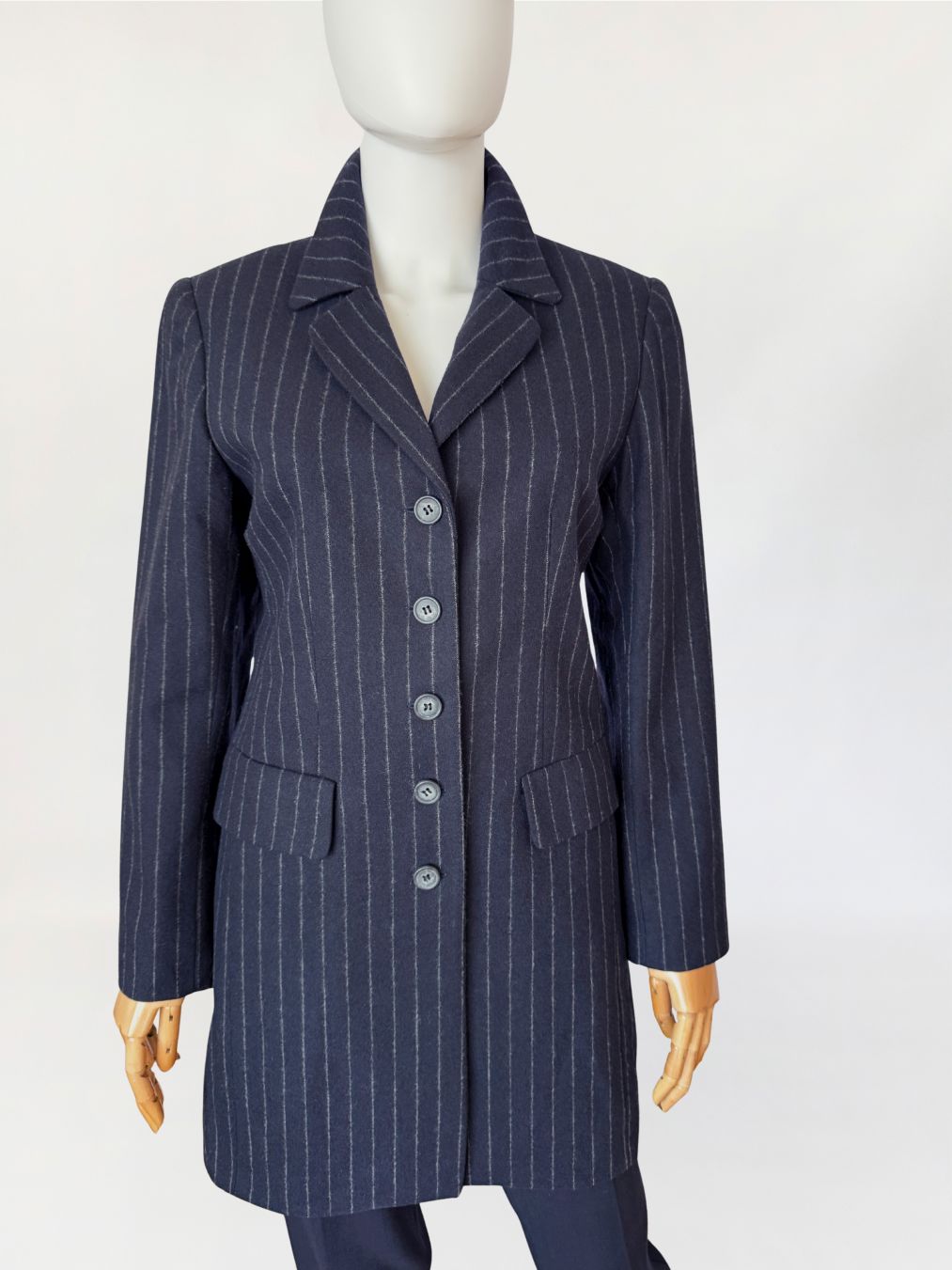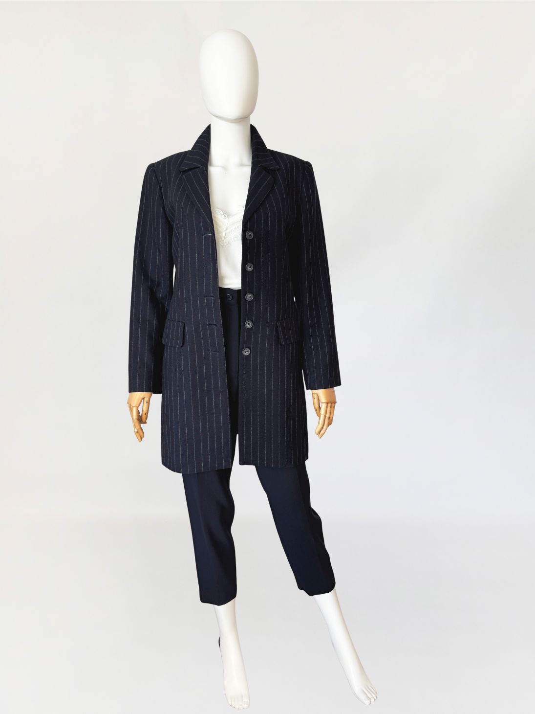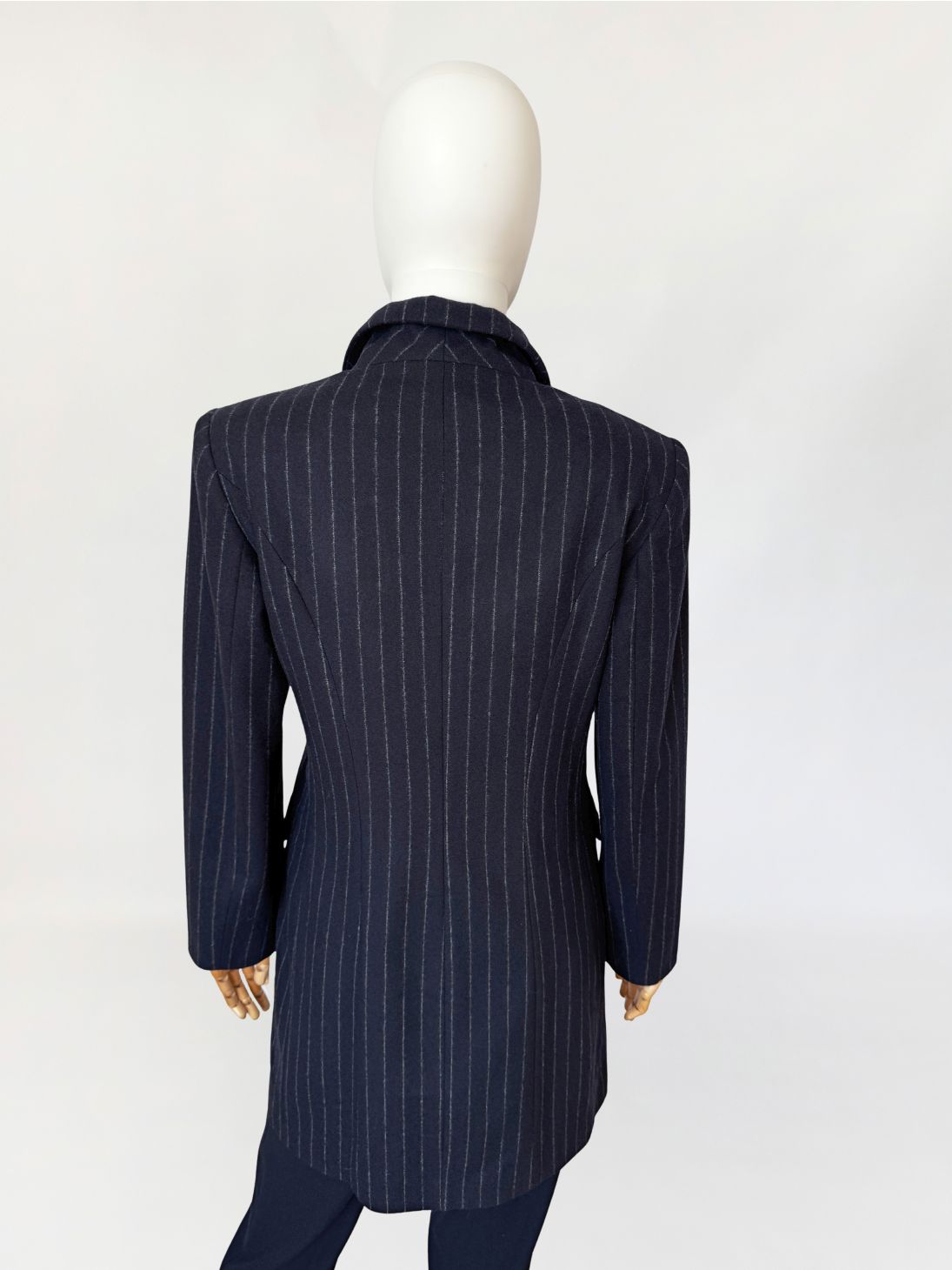 Włoska marynarka vintage o dłuższym taliowanym fasonie wykonana w całości z wełnianej tkaniny w atramentowo-grafitowym odcieniu z pionowymi prążkami o regularnym rytmie. Model o mocno wydłużonej linii z wyraźnie ukształtowaną talią podkreśloną cięciami konstrukcyjnymi. U góry nieduży kołnierz. Front zapinany na rząd guzików w tonacji dopasowanej do tkaniny. Kieszenie wpuszczane z patkami, wkomponowane w linię prążków. Rękawy długie, klasycznie wszyte, o prostej formie, dobrze wyprofilowane, lekko usztywnione ramiona.