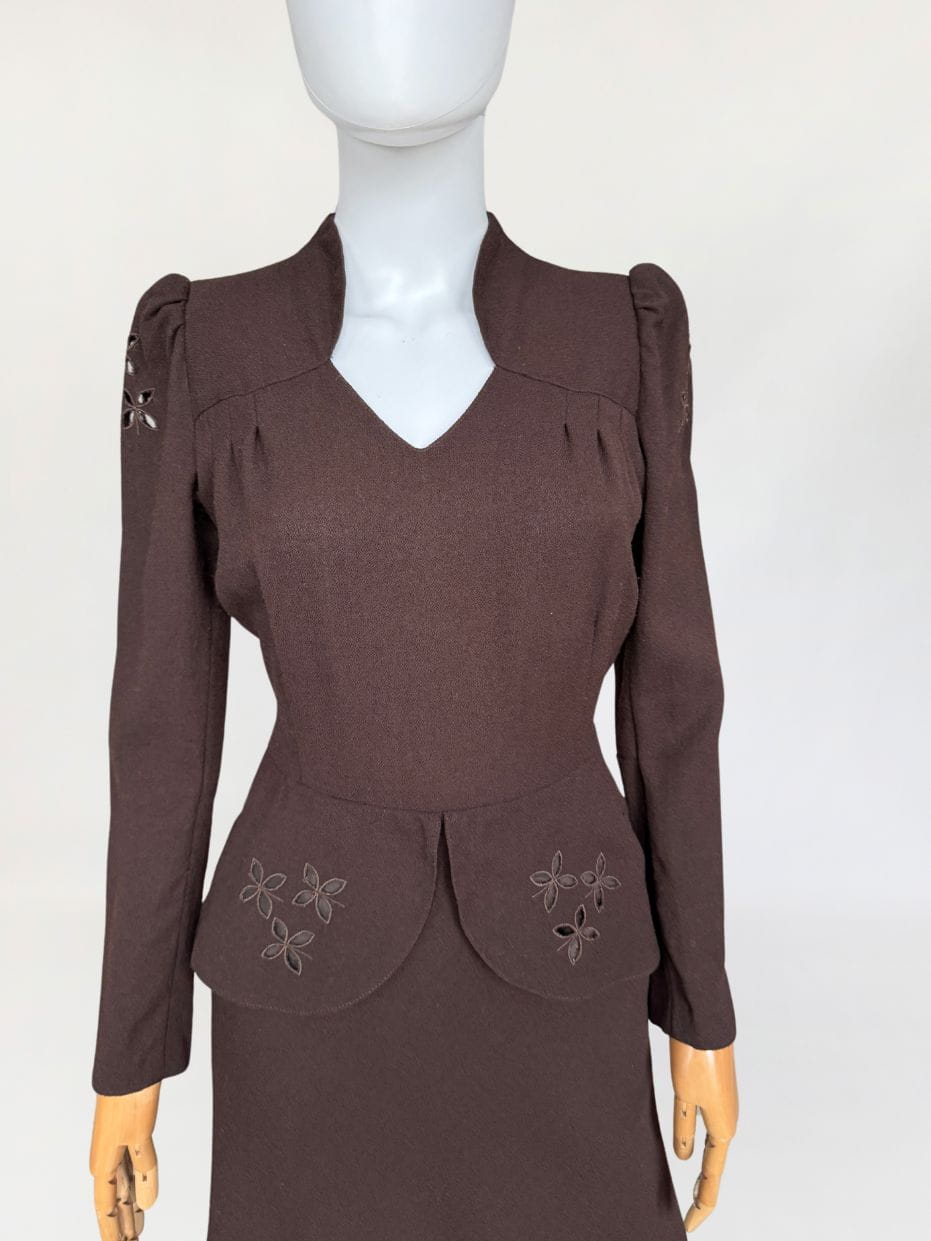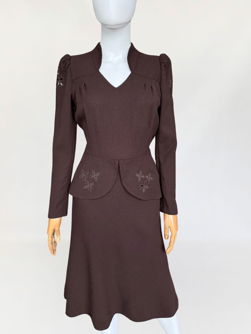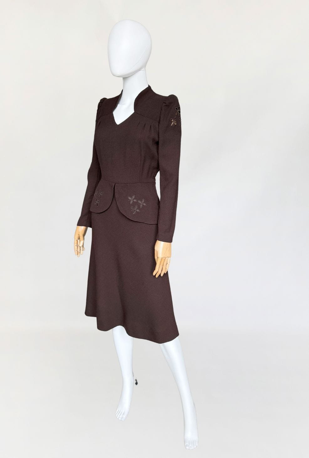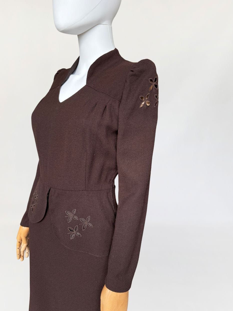 Zjawiskowa, stara sukienka true vintage wykonana z wełnianej krepy w kolorze brązowym. Pięknie uszyta, elegancka, a przy tym dość skromna w formie. Góra z długimi rękawami, które w ramionach mają ażurowe wycięte wzory. Ciekawie skrojony dekolt, na wysokości obojczyków zaszewki. W talii baskinka z powielonymi ażurowymi wzorami. Spódnica długa, o swobodnym fasonie. Zapinana na metalowy zamek z boku talii. Od wewnątrz na podszewce.