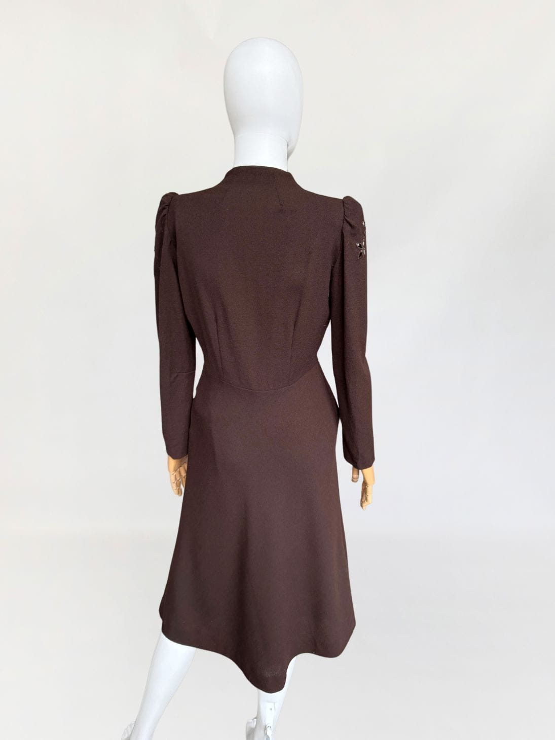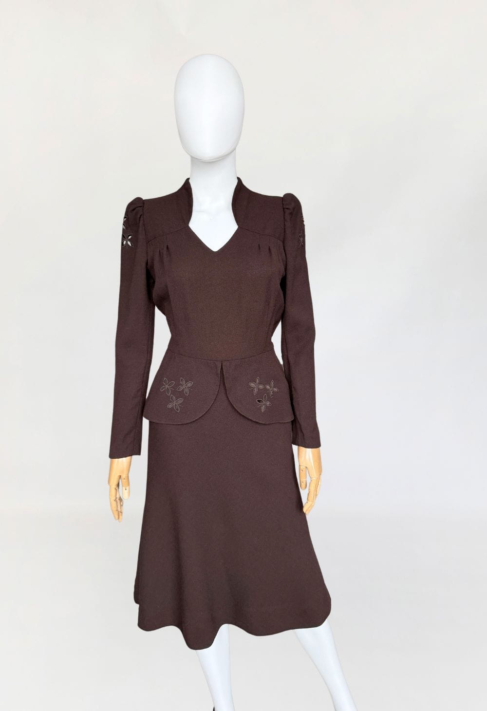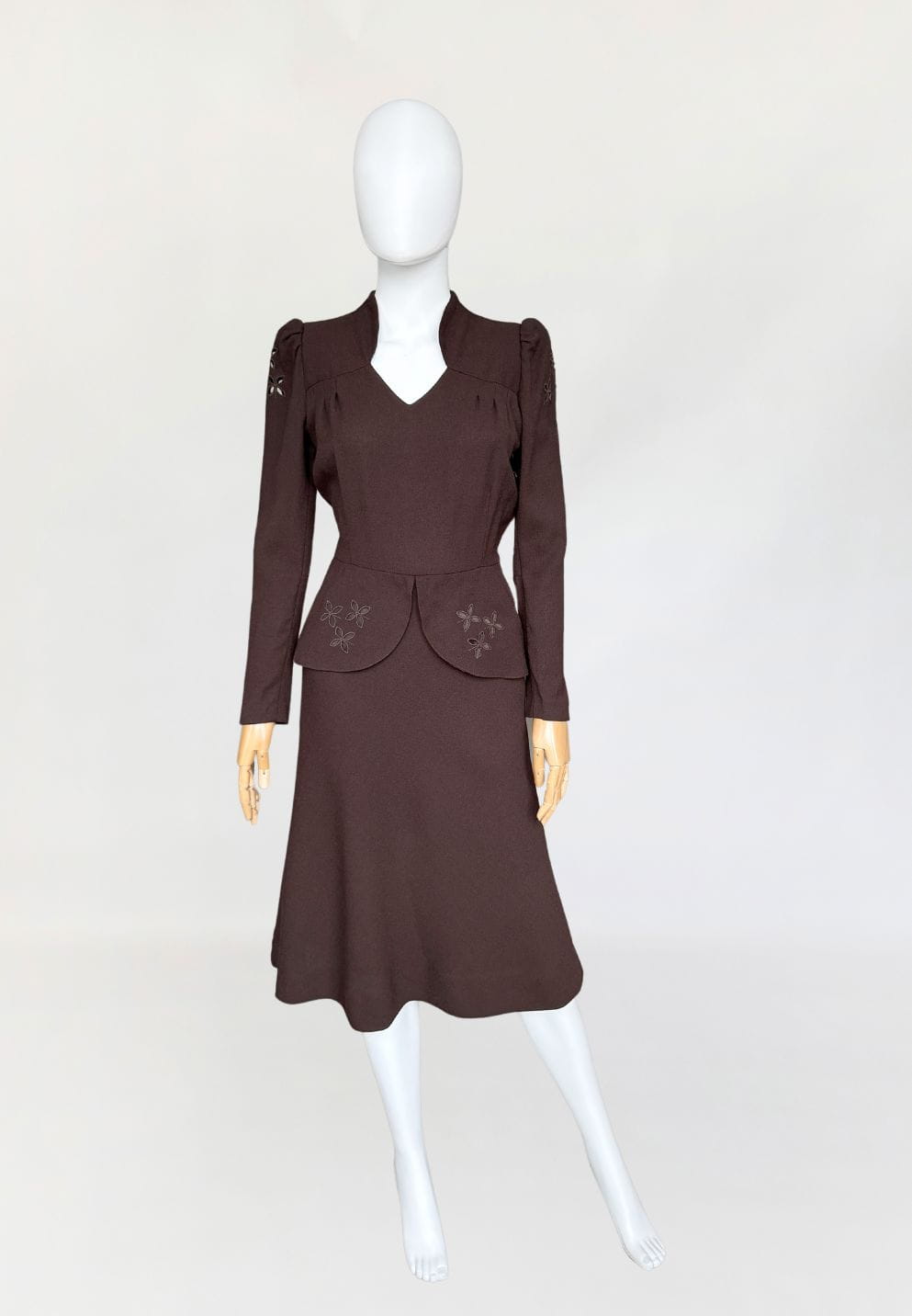 Zjawiskowa, stara sukienka true vintage wykonana z wełnianej krepy w kolorze brązowym. Pięknie uszyta, elegancka, a przy tym dość skromna w formie. Góra z długimi rękawami, które w ramionach mają ażurowe wycięte wzory. Ciekawie skrojony dekolt, na wysokości obojczyków zaszewki. W talii baskinka z powielonymi ażurowymi wzorami. Spódnica długa, o swobodnym fasonie. Zapinana na metalowy zamek z boku talii. Od wewnątrz na podszewce.
