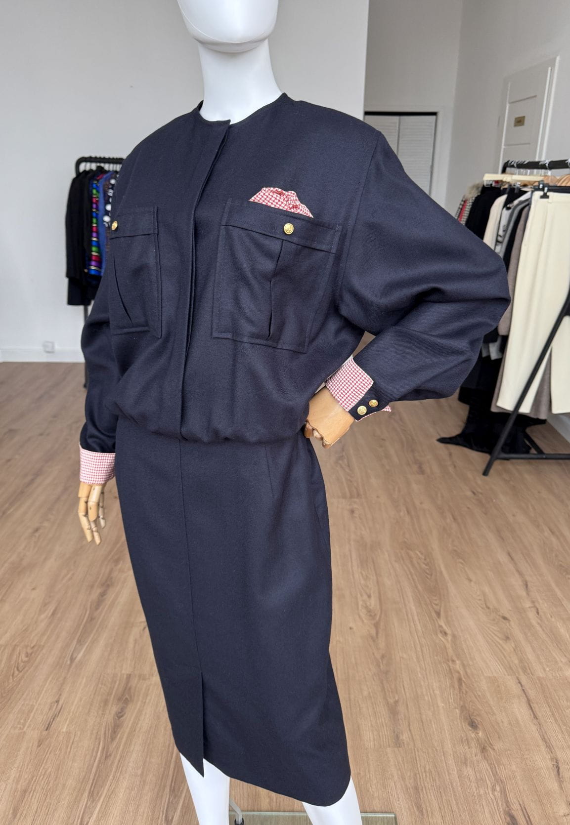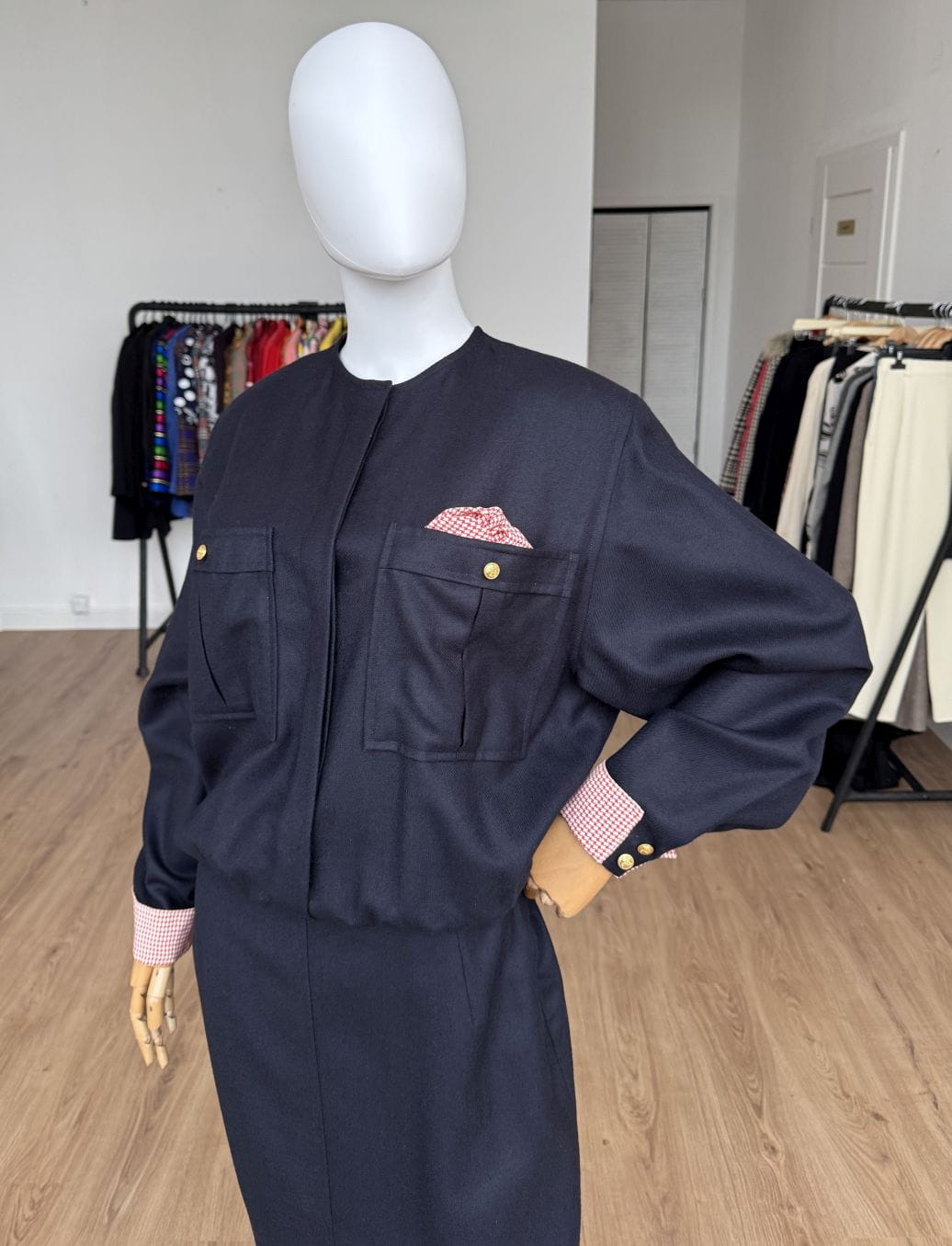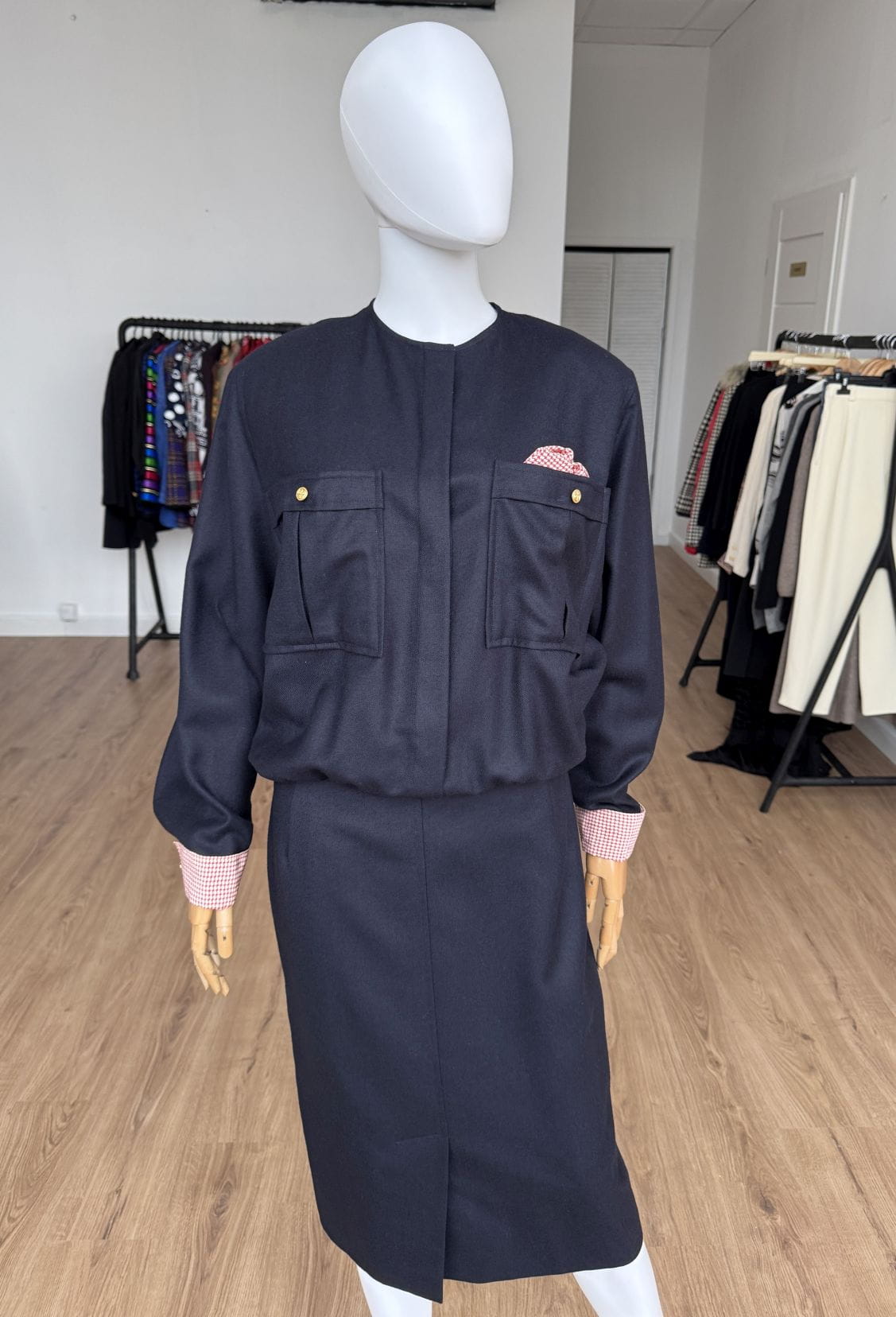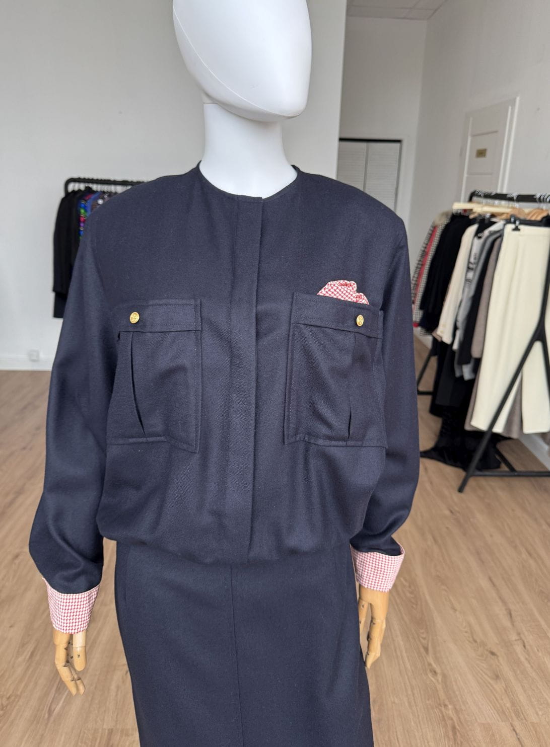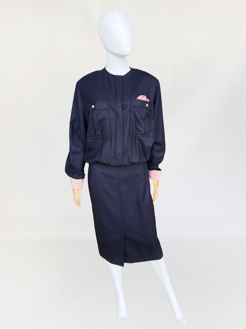 Sukienka vintage wykonana z wełnianej tkaniny w granatowym kolorze. Zapinana na złote guziki z kotwicami, dodające jej marynistycznego klimatu. Góra o swobodnym fasonie długimi rękawami i okrągłym dekoltem. Od frontu duże kieszenie, w jednej dekoracyjna jedwabna poszetka. Mankiety rękawów obszyte jedwabną tkaniną. Spódnica o ołówkowym fasonie z rozporkiem z przodu.