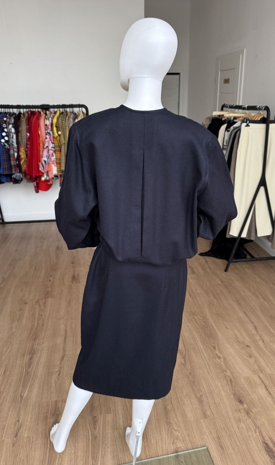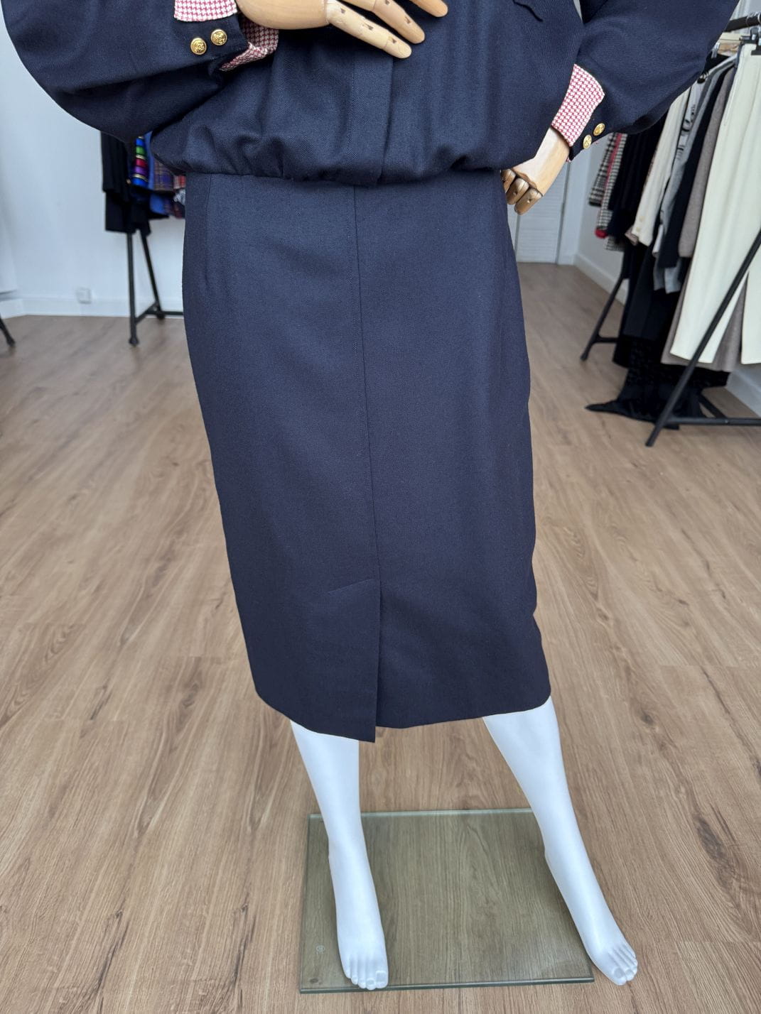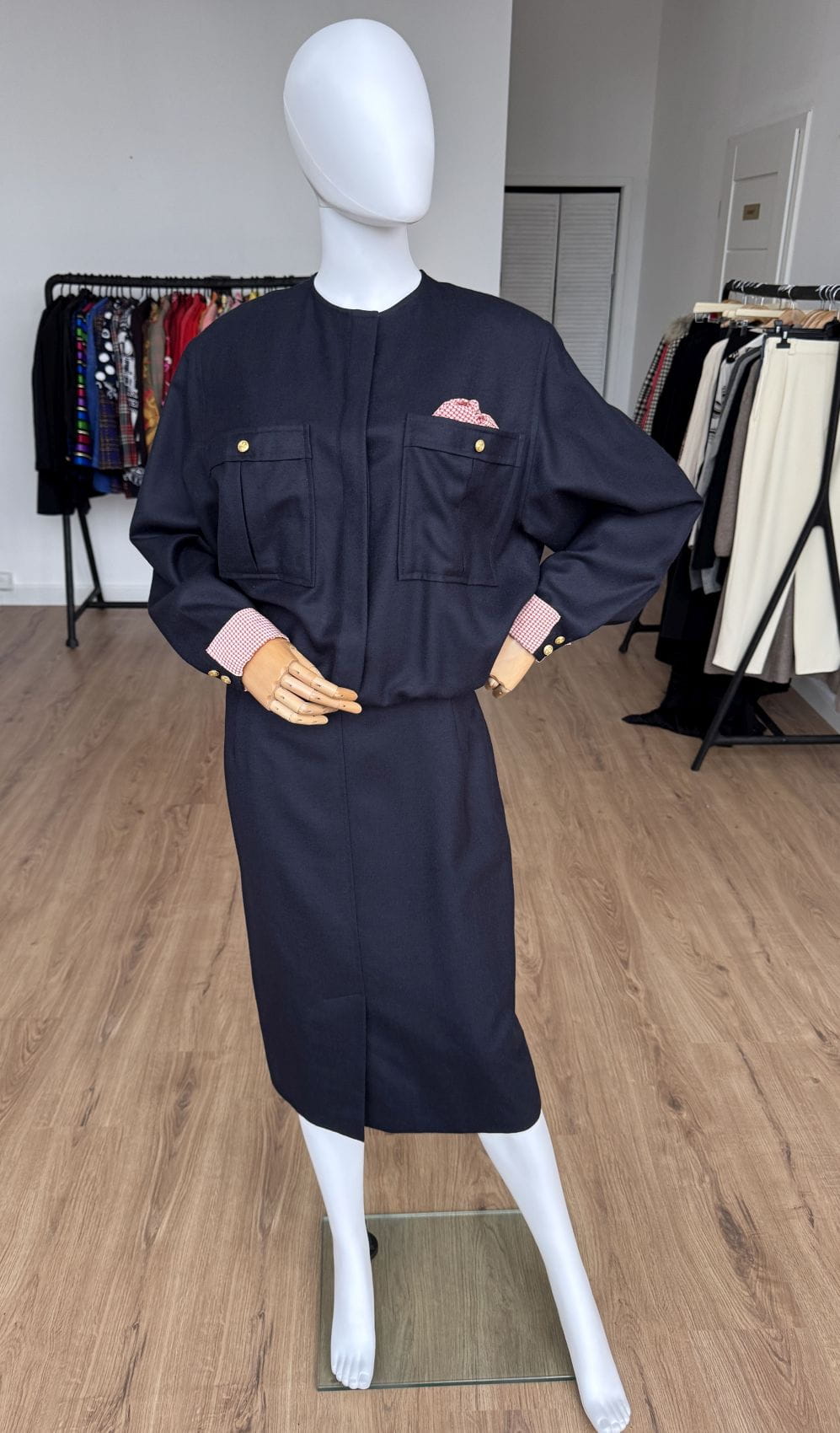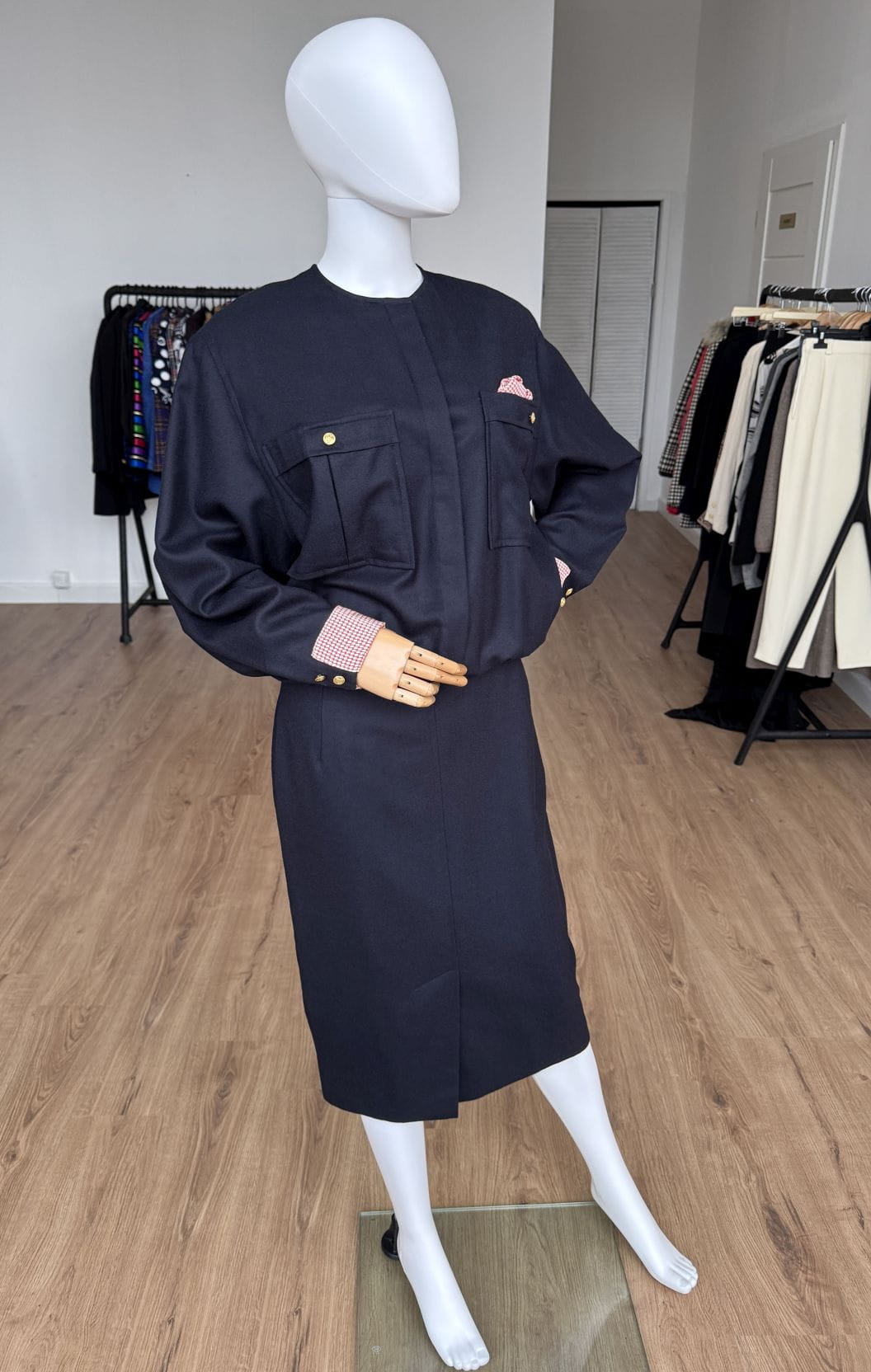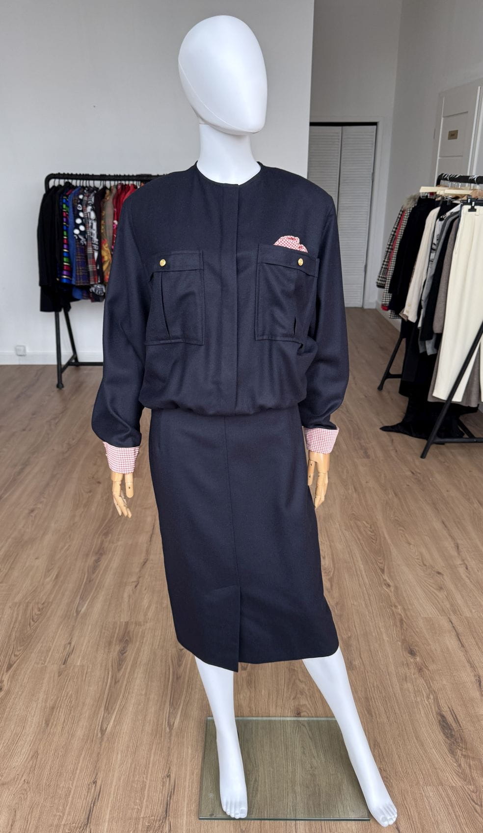 Sukienka vintage wykonana z wełnianej tkaniny w granatowym kolorze. Zapinana na złote guziki z kotwicami, dodające jej marynistycznego klimatu. Góra o swobodnym fasonie długimi rękawami i okrągłym dekoltem. Od frontu duże kieszenie, w jednej dekoracyjna jedwabna poszetka. Mankiety rękawów obszyte jedwabną tkaniną. Spódnica o ołówkowym fasonie z rozporkiem z przodu.