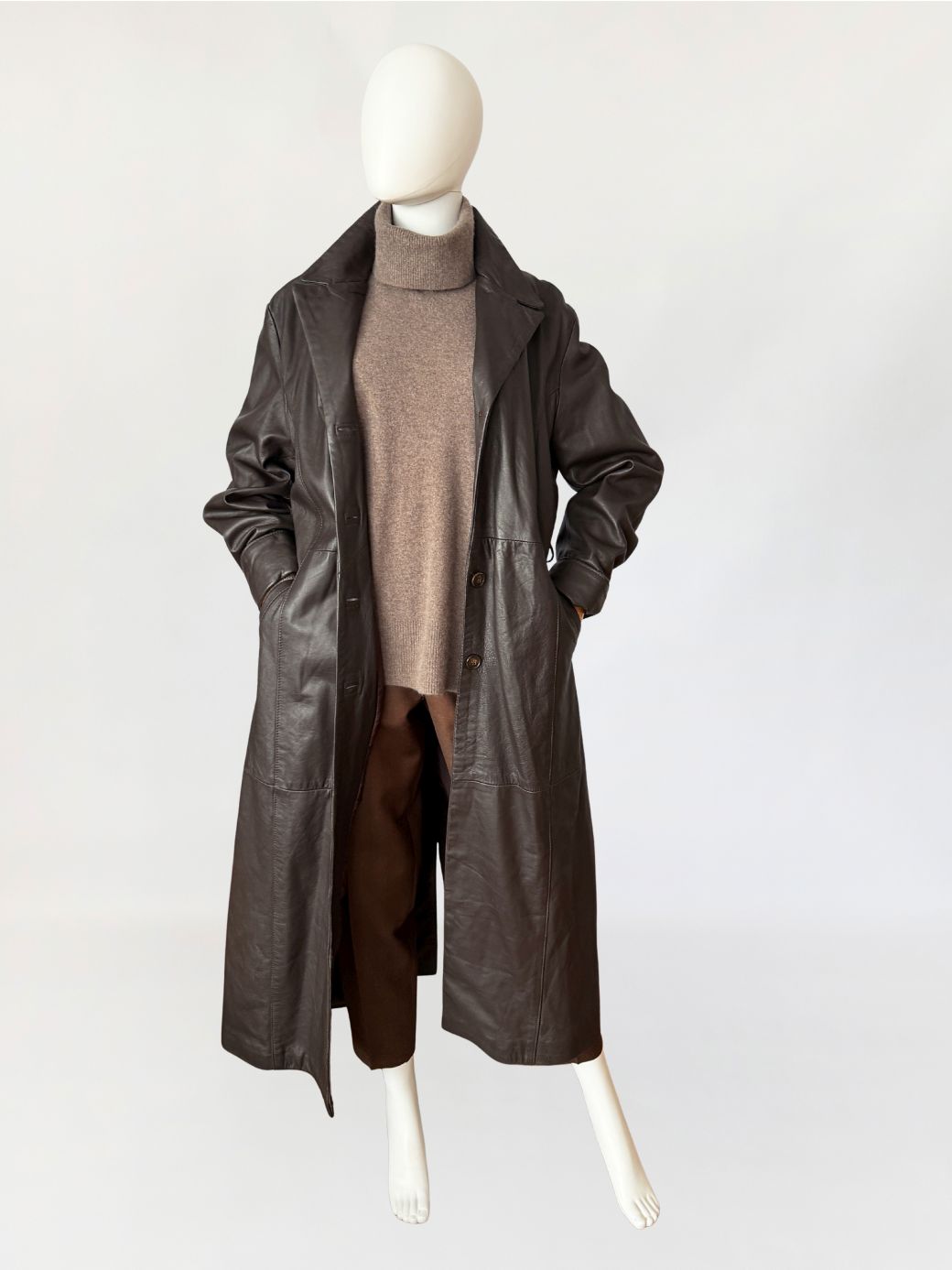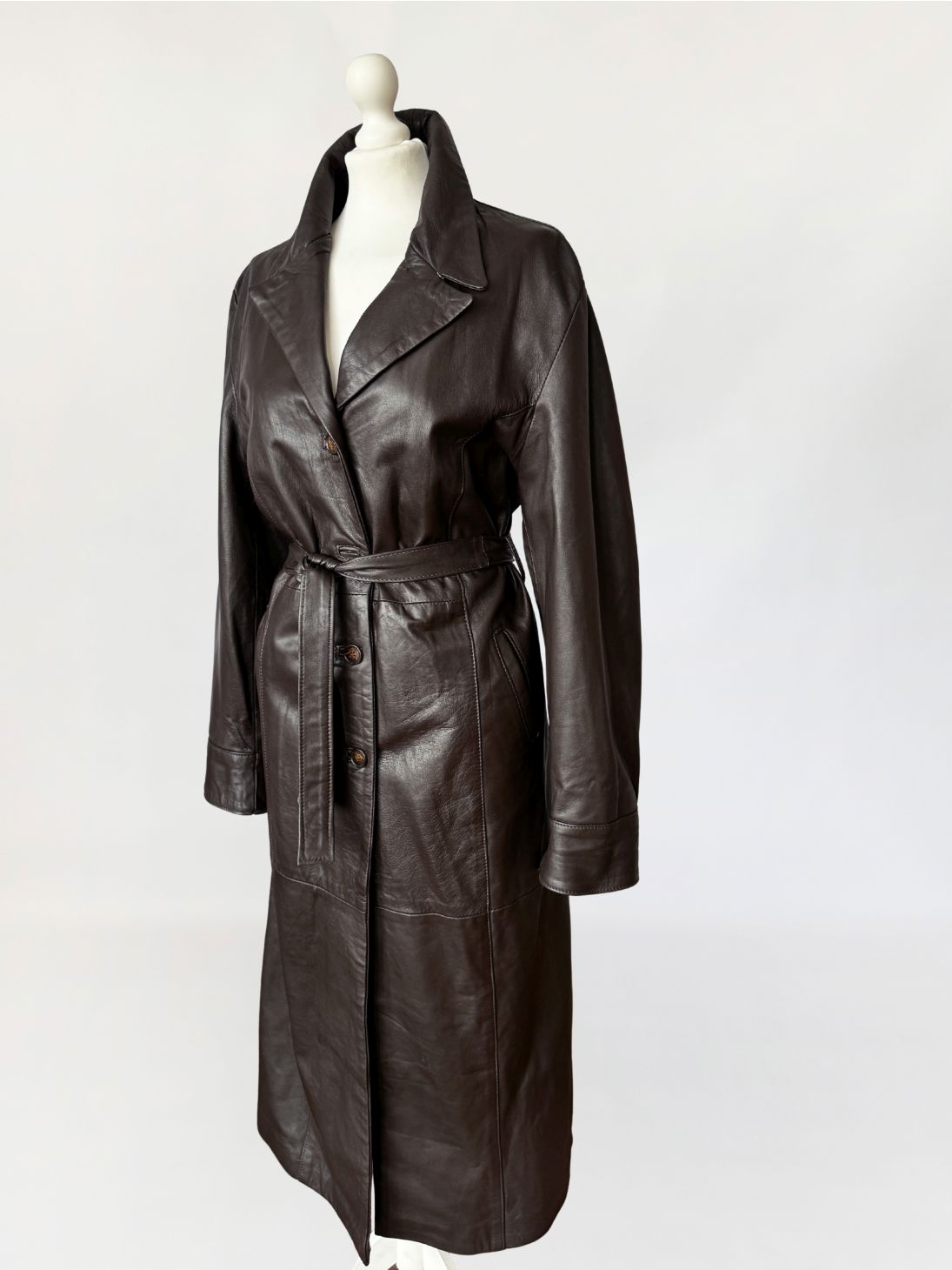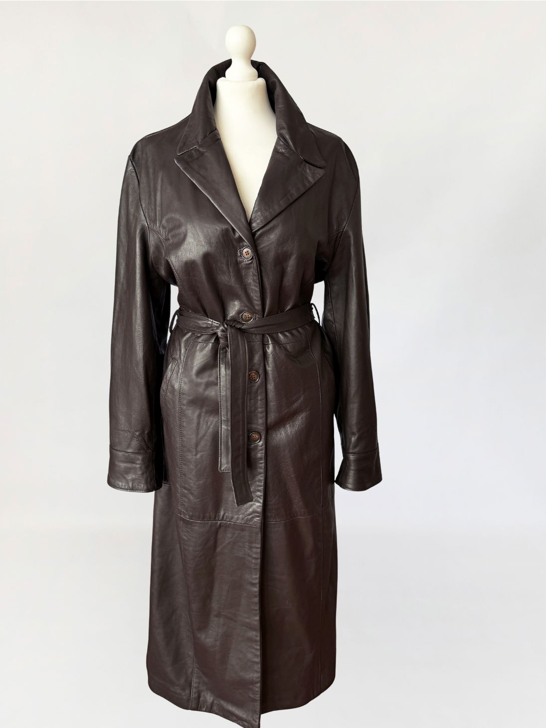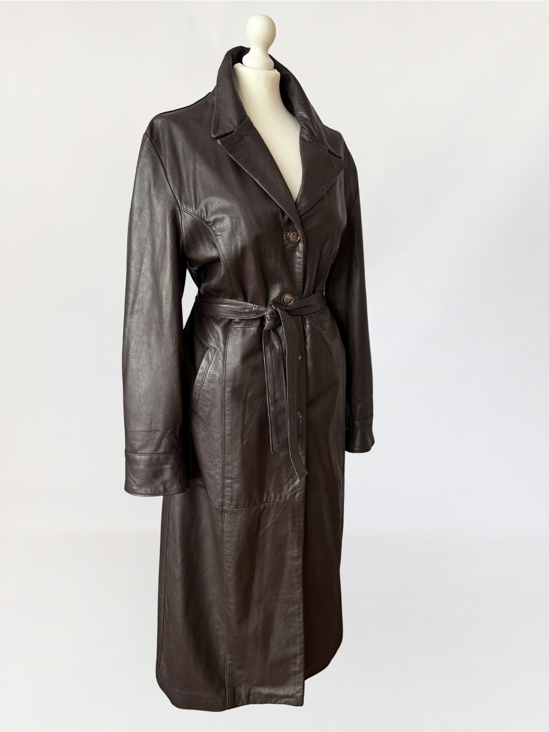 Długi włoski płaszcz - trencz vintage wykonany z miękkiej skóry naturalnej w odcieniu gorzkiej czekolady. Fason jednorzędowy z kołnierzem rewersowym, zapinany na guziki. W talii pasek ze skóry, prowadzony przez szlufki, umożliwiający regulację obwodu. Przód z kieszeniami wpuszczanymi po bokach. Konstrukcja oparta na pionowych cięciach modelujących przód i tył, z centralnym szwem na plecach. Długie rękawy klasycznie wszyte z podwijanymi mankietami. Z tyłu wysoki rozporek.
