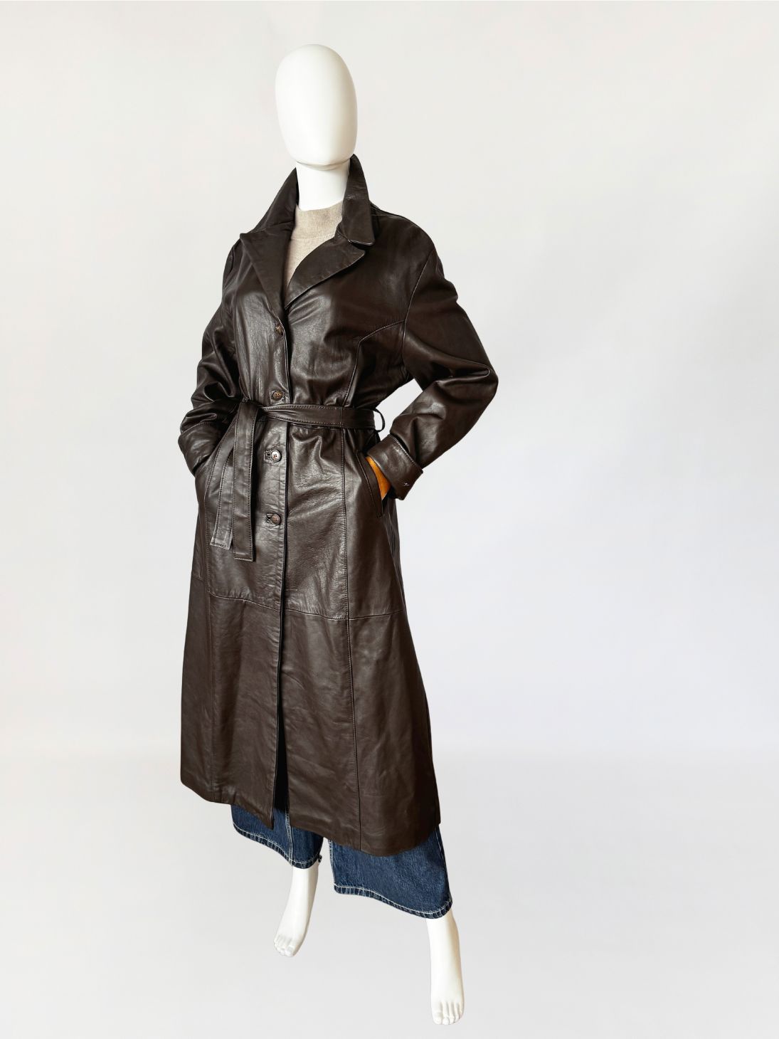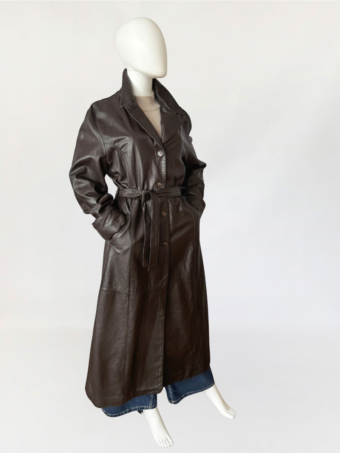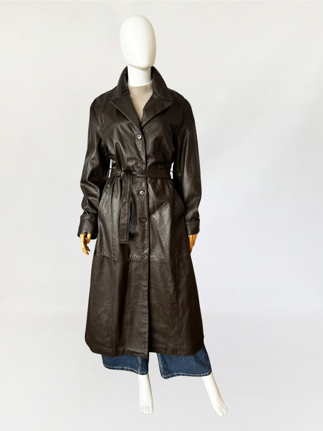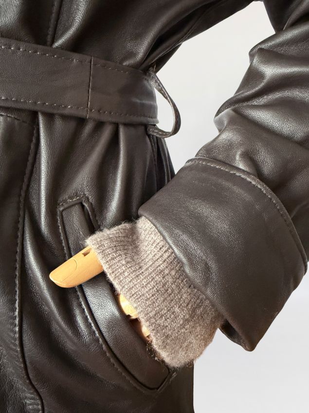 Długi włoski płaszcz - trencz vintage wykonany z miękkiej skóry naturalnej w odcieniu gorzkiej czekolady. Fason jednorzędowy z kołnierzem rewersowym, zapinany na guziki. W talii pasek ze skóry, prowadzony przez szlufki, umożliwiający regulację obwodu. Przód z kieszeniami wpuszczanymi po bokach. Konstrukcja oparta na pionowych cięciach modelujących przód i tył, z centralnym szwem na plecach. Długie rękawy klasycznie wszyte z podwijanymi mankietami. Z tyłu wysoki rozporek.