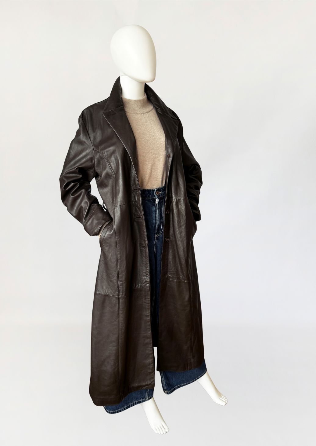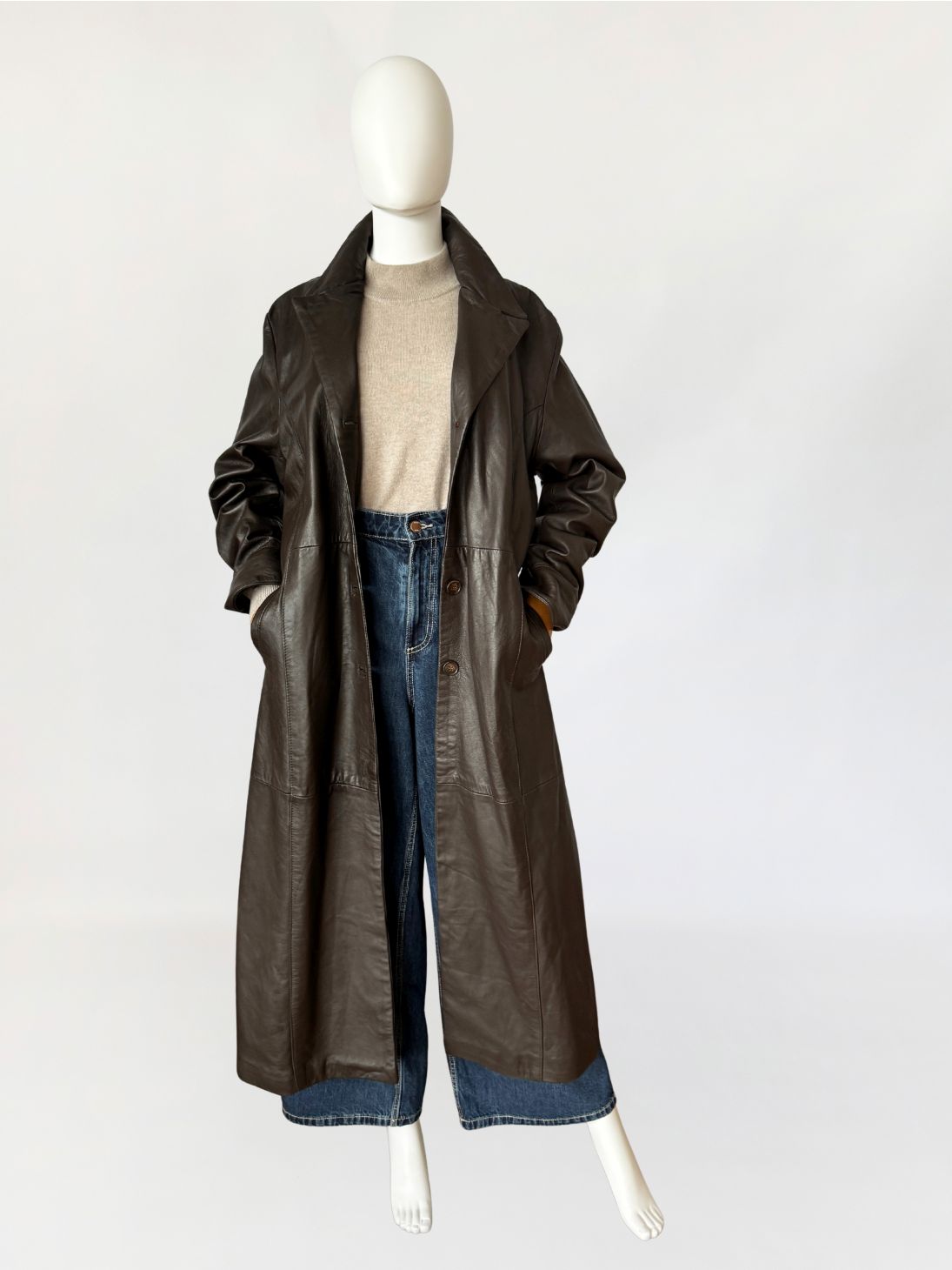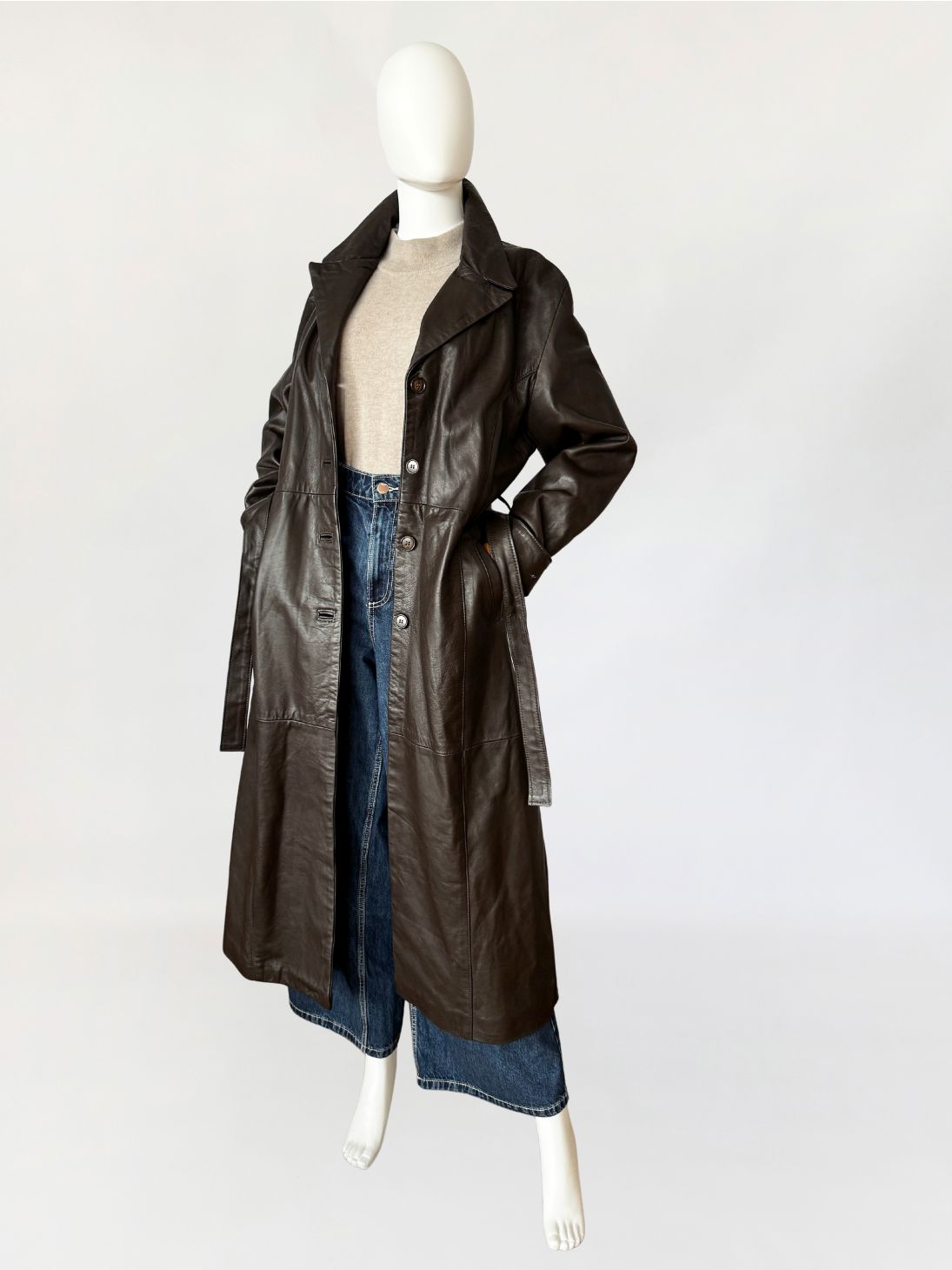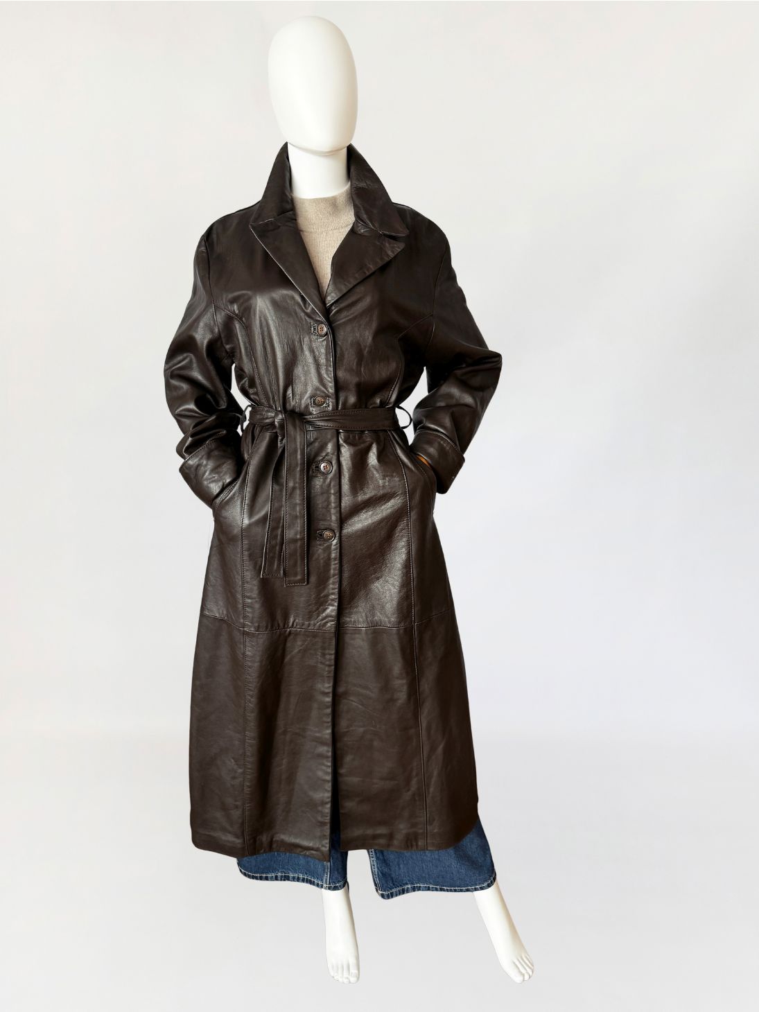 Długi włoski płaszcz - trencz vintage wykonany z miękkiej skóry naturalnej w odcieniu gorzkiej czekolady. Fason jednorzędowy z kołnierzem rewersowym, zapinany na guziki. W talii pasek ze skóry, prowadzony przez szlufki, umożliwiający regulację obwodu. Przód z kieszeniami wpuszczanymi po bokach. Konstrukcja oparta na pionowych cięciach modelujących przód i tył, z centralnym szwem na plecach. Długie rękawy klasycznie wszyte z podwijanymi mankietami. Z tyłu wysoki rozporek.