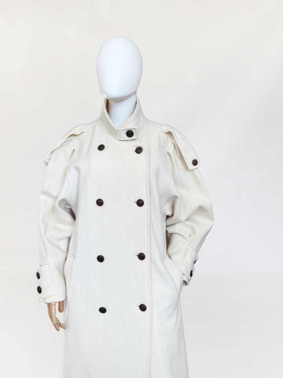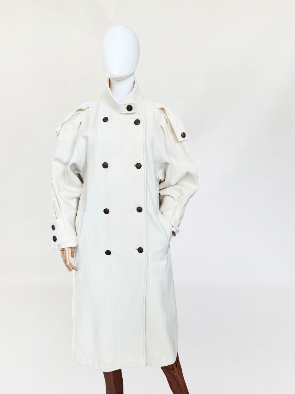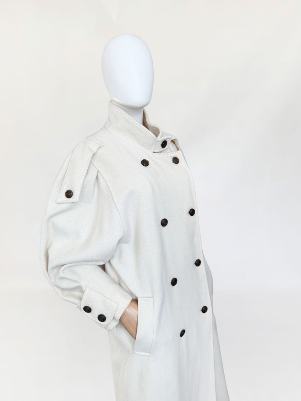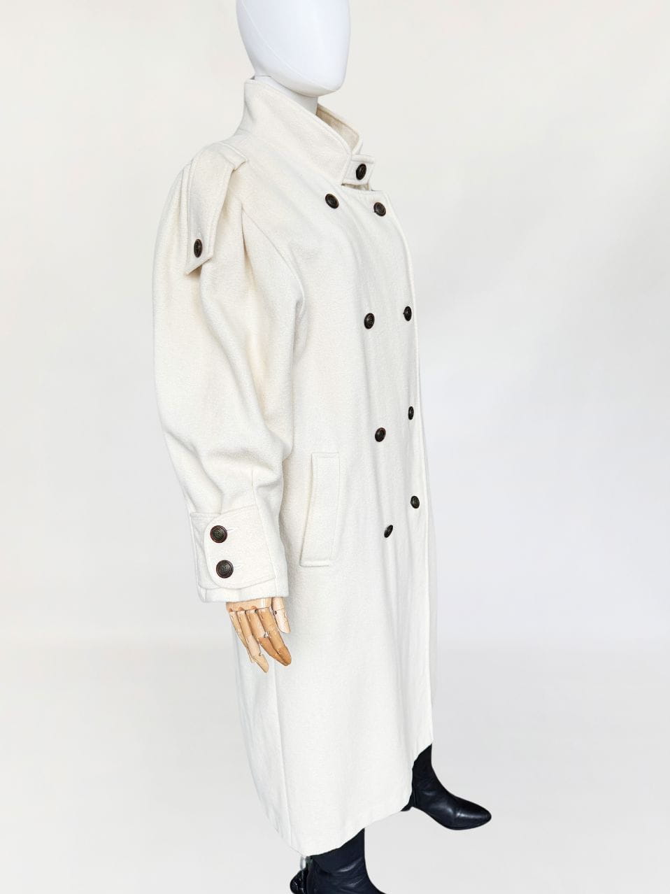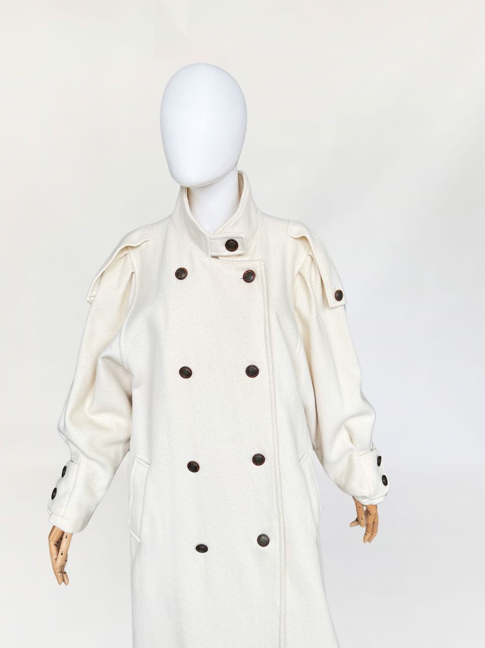 Długi płaszcz vintage wykonany z doskonałej jakości wełny w kolorze śmietankowym. Prosty fason z kołnierzem typu stójka. Długie rękawy, szerokie w ramionach, w nadgarstkach przepinane. U góry stójka. Zapinany dwurzędowo na guziki w militarnym stylu. Na ramionach przepinane pagony. W dolnej części wsuwane kieszenie. Z tyłu wysoki rozporek.