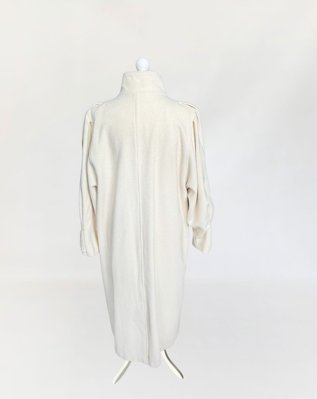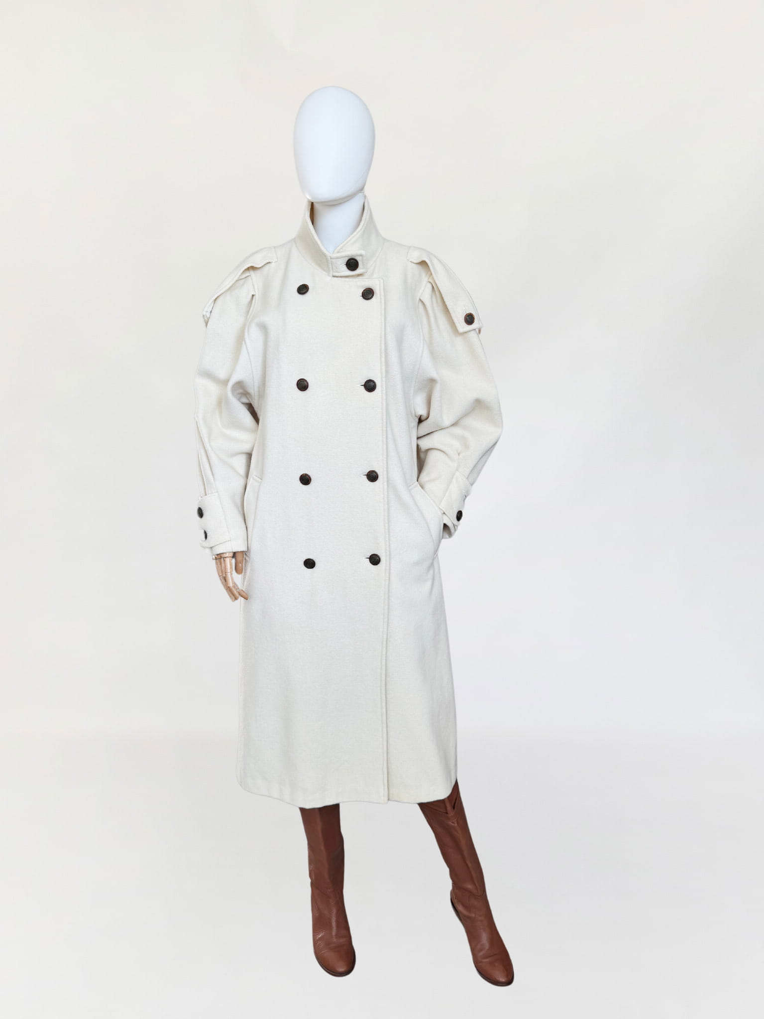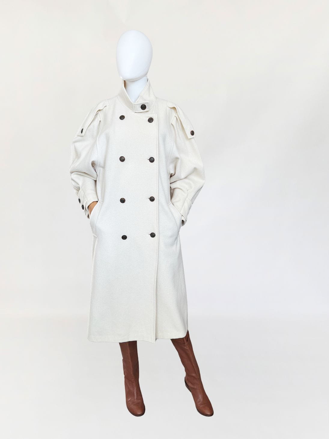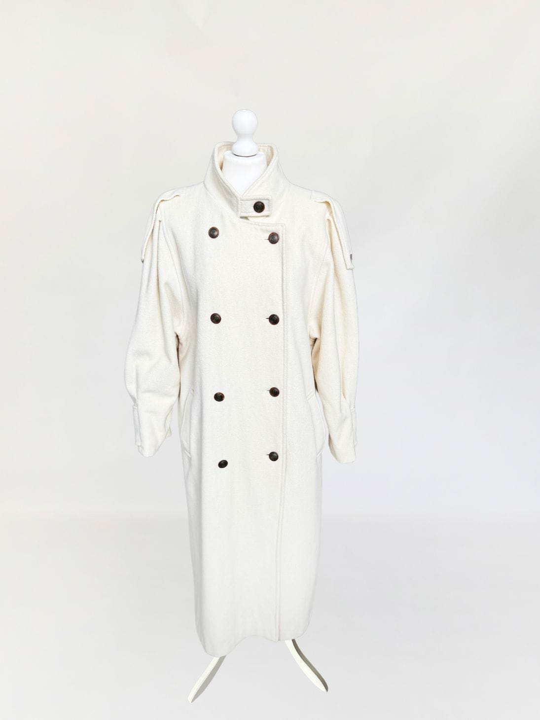 Długi płaszcz vintage wykonany z doskonałej jakości wełny w kolorze śmietankowym. Prosty fason z kołnierzem typu stójka. Długie rękawy, szerokie w ramionach, w nadgarstkach przepinane. U góry stójka. Zapinany dwurzędowo na guziki w militarnym stylu. Na ramionach przepinane pagony. W dolnej części wsuwane kieszenie. Z tyłu wysoki rozporek.