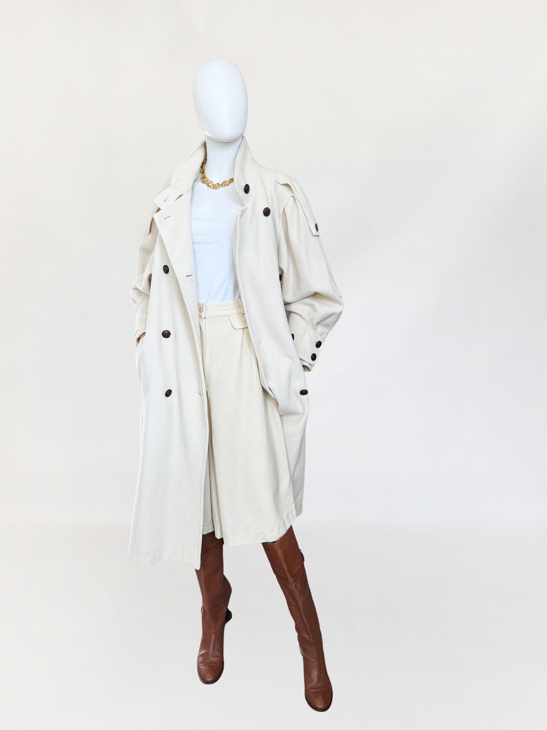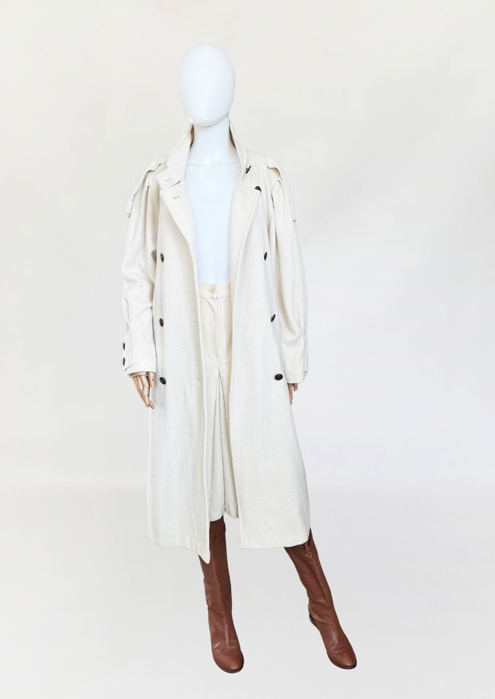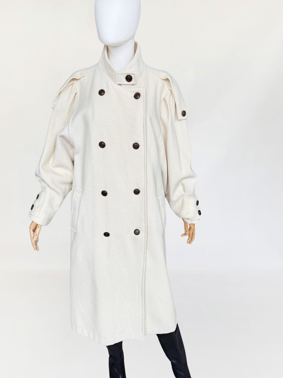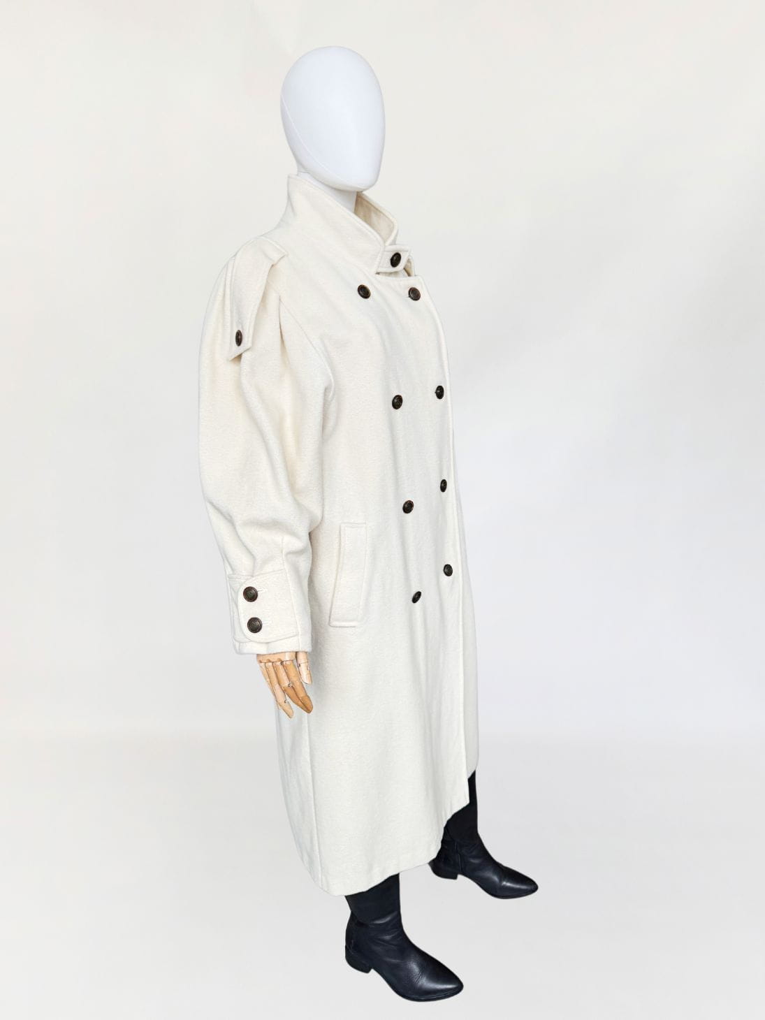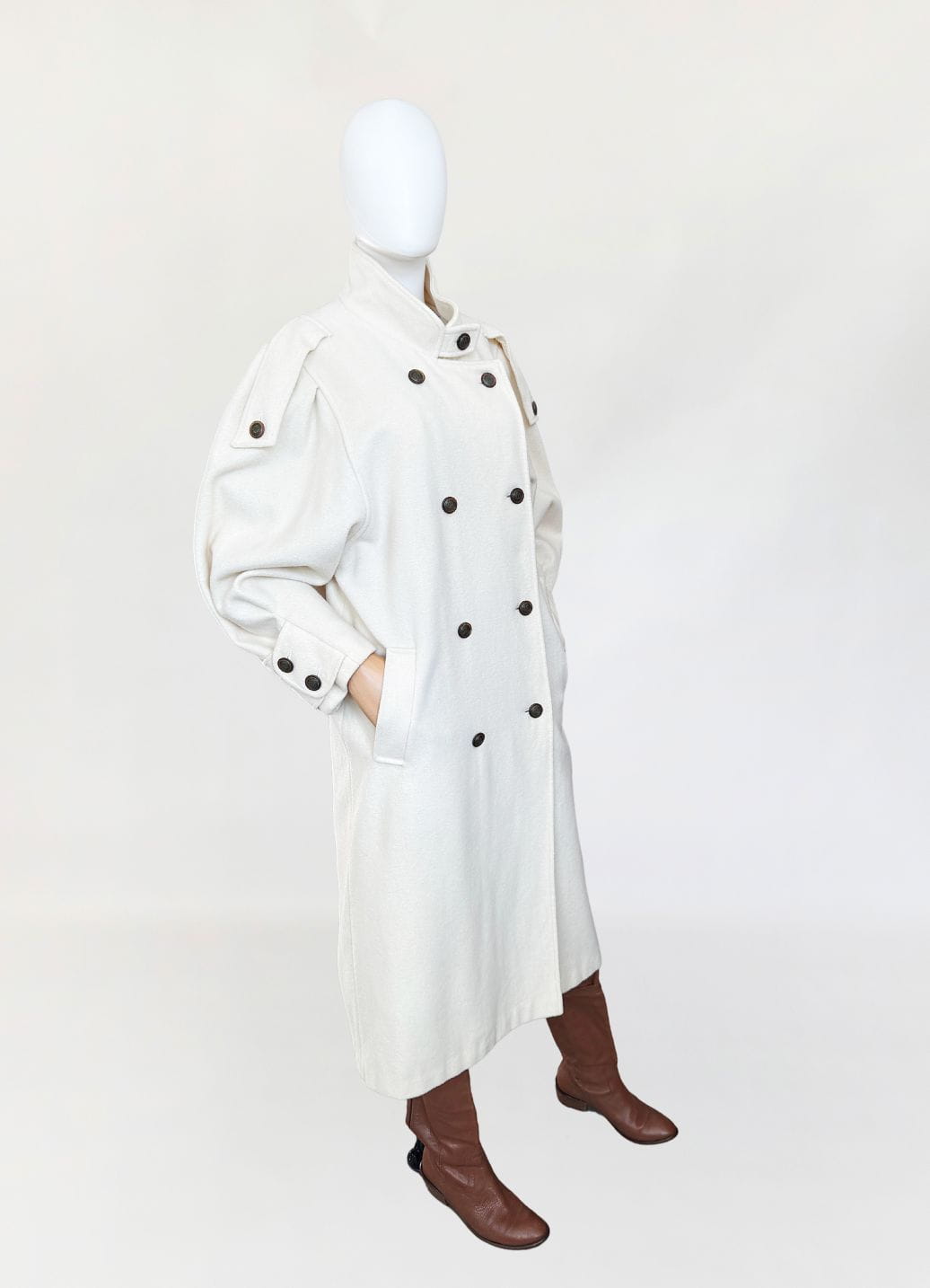Długi płaszcz vintage wykonany z doskonałej jakości wełny w kolorze śmietankowym. Prosty fason z kołnierzem typu stójka. Długie rękawy, szerokie w ramionach, w nadgarstkach przepinane. U góry stójka. Zapinany dwurzędowo na guziki w militarnym stylu. Na ramionach przepinane pagony. W dolnej części wsuwane kieszenie. Z tyłu wysoki rozporek.