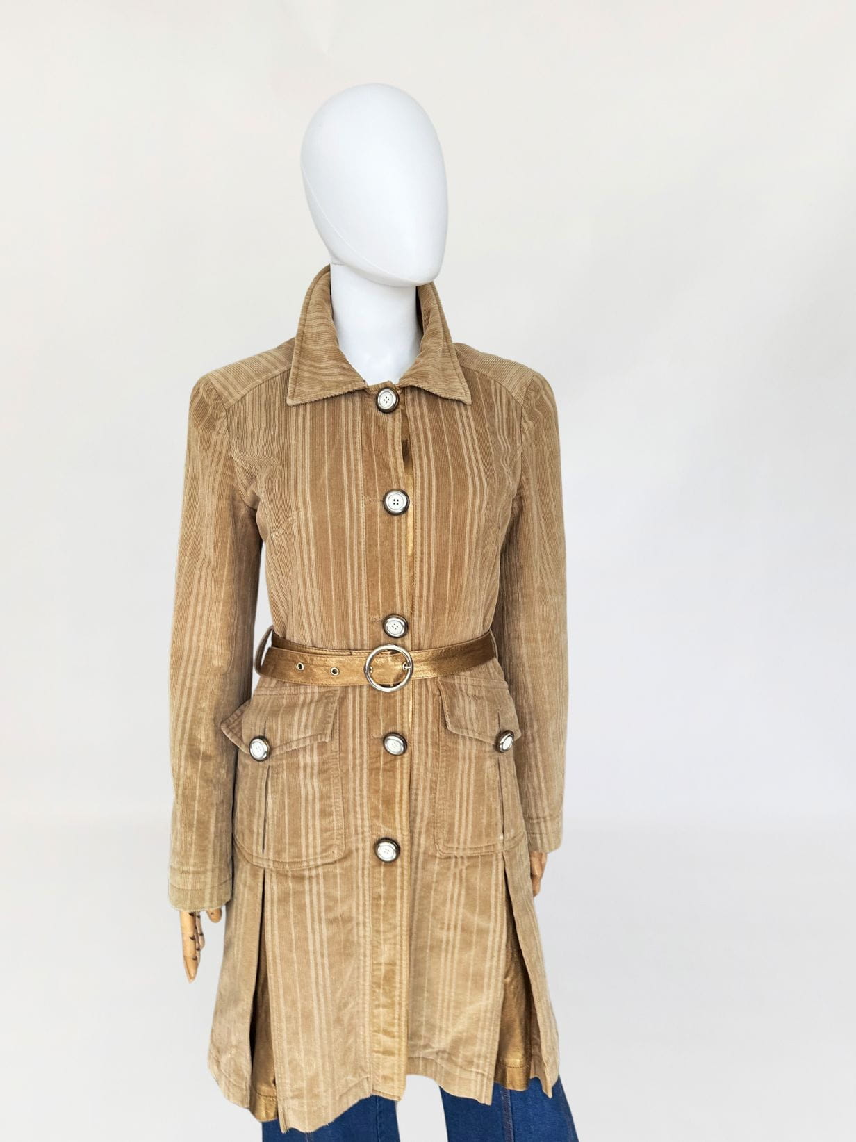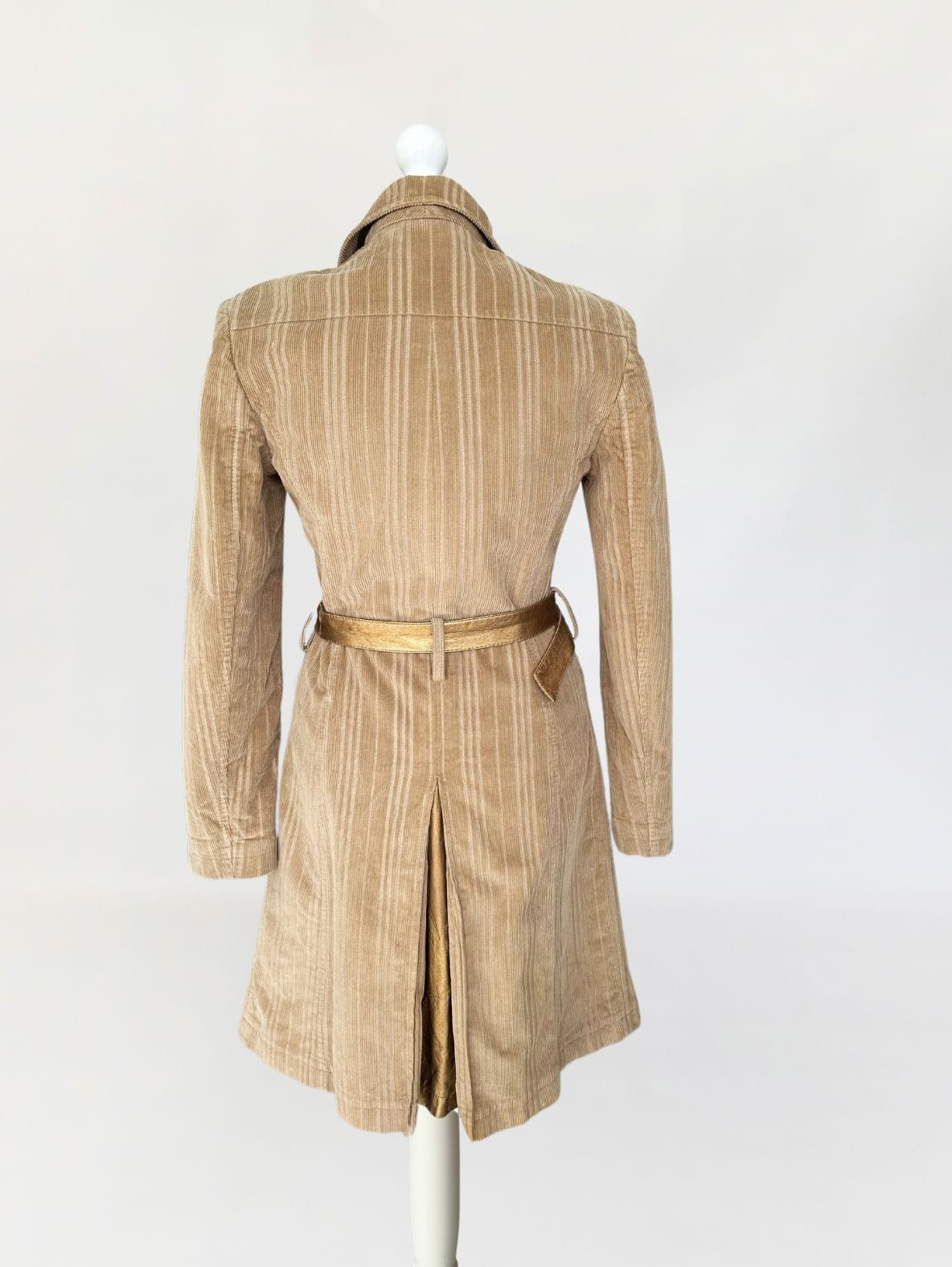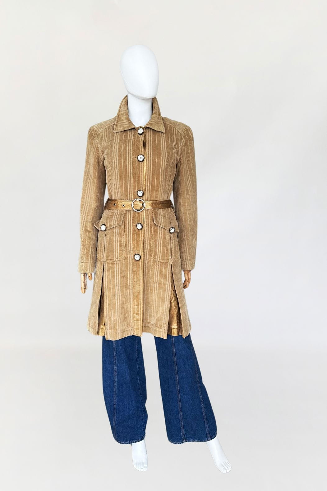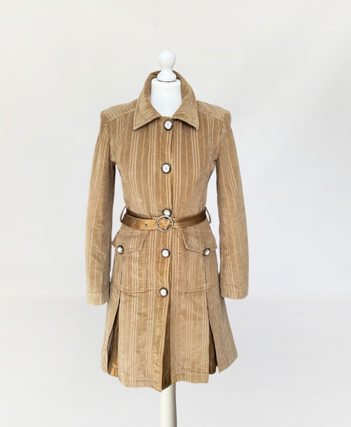 Płaszcz vintage z lat 00-tych projektu duetu Dolce&Gabbana. Wykonany ze sztruksowej tkaniny w kolorze beżowym. W dolnej części (kontrafałdy), wzdłuż linii zapięcia wstawki z naturalnej skóry w kolorze złotym. Płaszcz utrzymany w klimacie boho/hippie, w oryginale miał dopinany kołnierz z futra. Podszewka w kolorowe psychodeliczne wzory, od wewnątrz wyściełana fizeliną, dzięki czemu płaszcz nadaje się na wiosnę i jesień. Od frontu duże kieszenie z klapami. Przepinany w talii regulowanym, skórzanym paskiem.