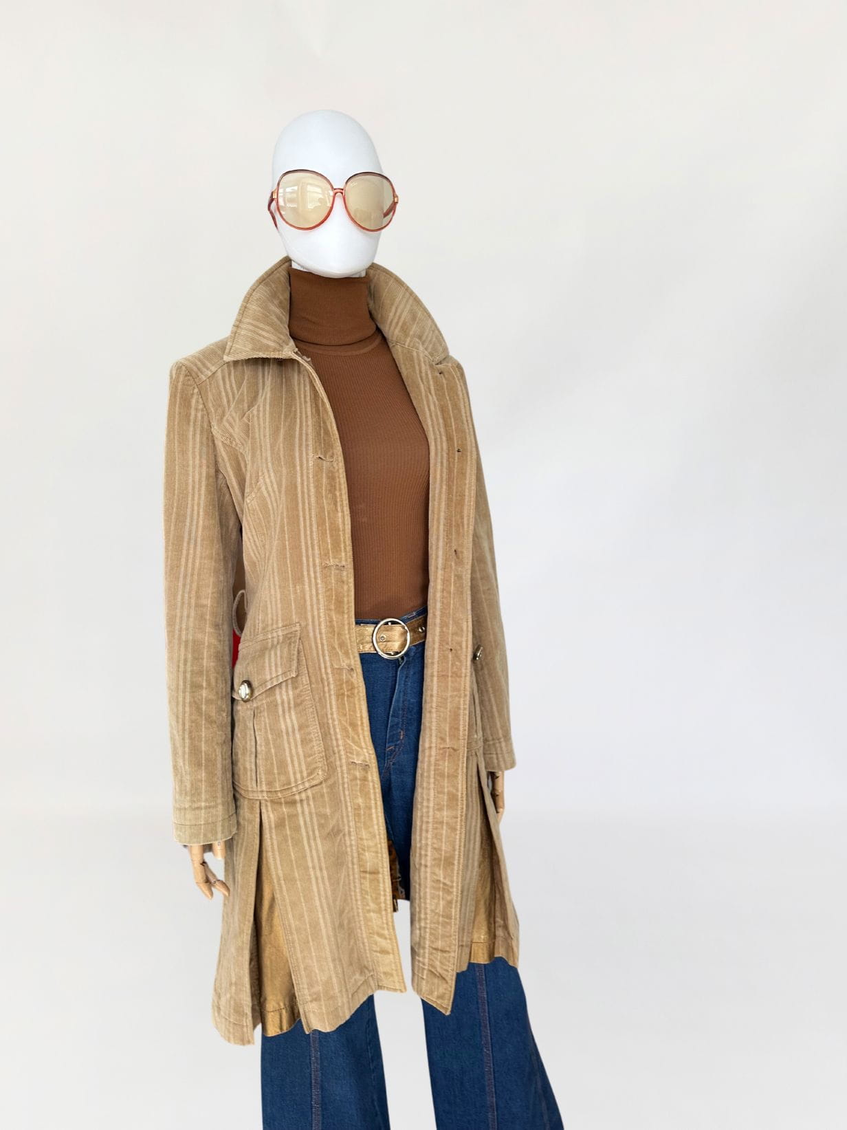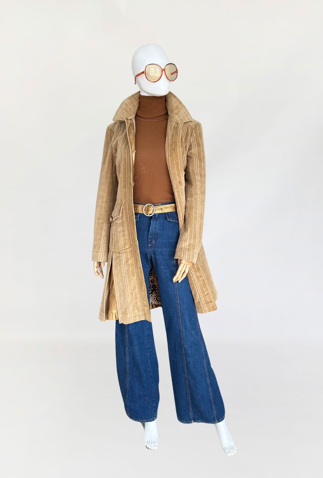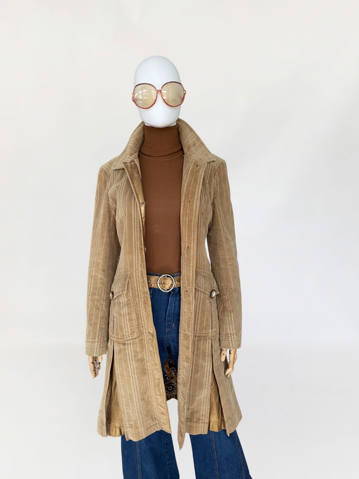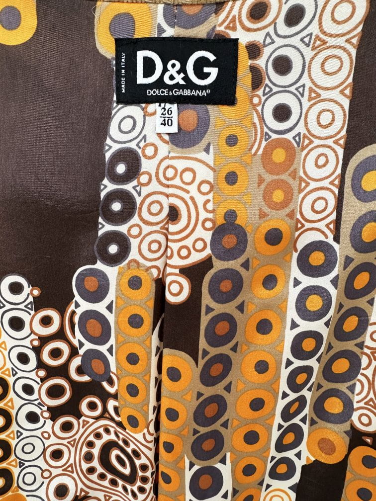 Płaszcz vintage z lat 00-tych projektu duetu Dolce&Gabbana. Wykonany ze sztruksowej tkaniny w kolorze beżowym. W dolnej części (kontrafałdy), wzdłuż linii zapięcia wstawki z naturalnej skóry w kolorze złotym. Płaszcz utrzymany w klimacie boho/hippie, w oryginale miał dopinany kołnierz z futra. Podszewka w kolorowe psychodeliczne wzory, od wewnątrz wyściełana fizeliną, dzięki czemu płaszcz nadaje się na wiosnę i jesień. Od frontu duże kieszenie z klapami. Przepinany w talii regulowanym, skórzanym paskiem.