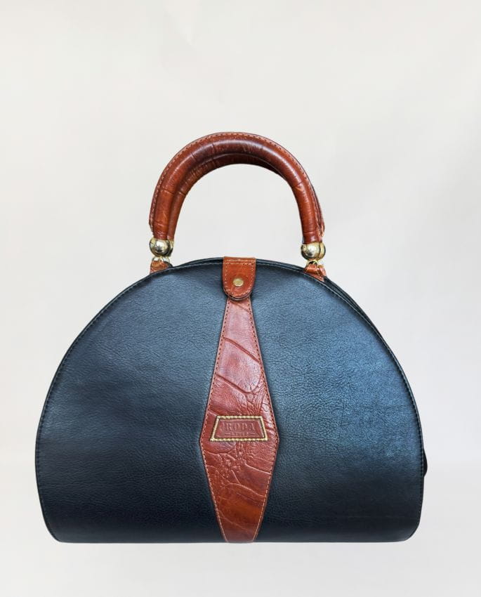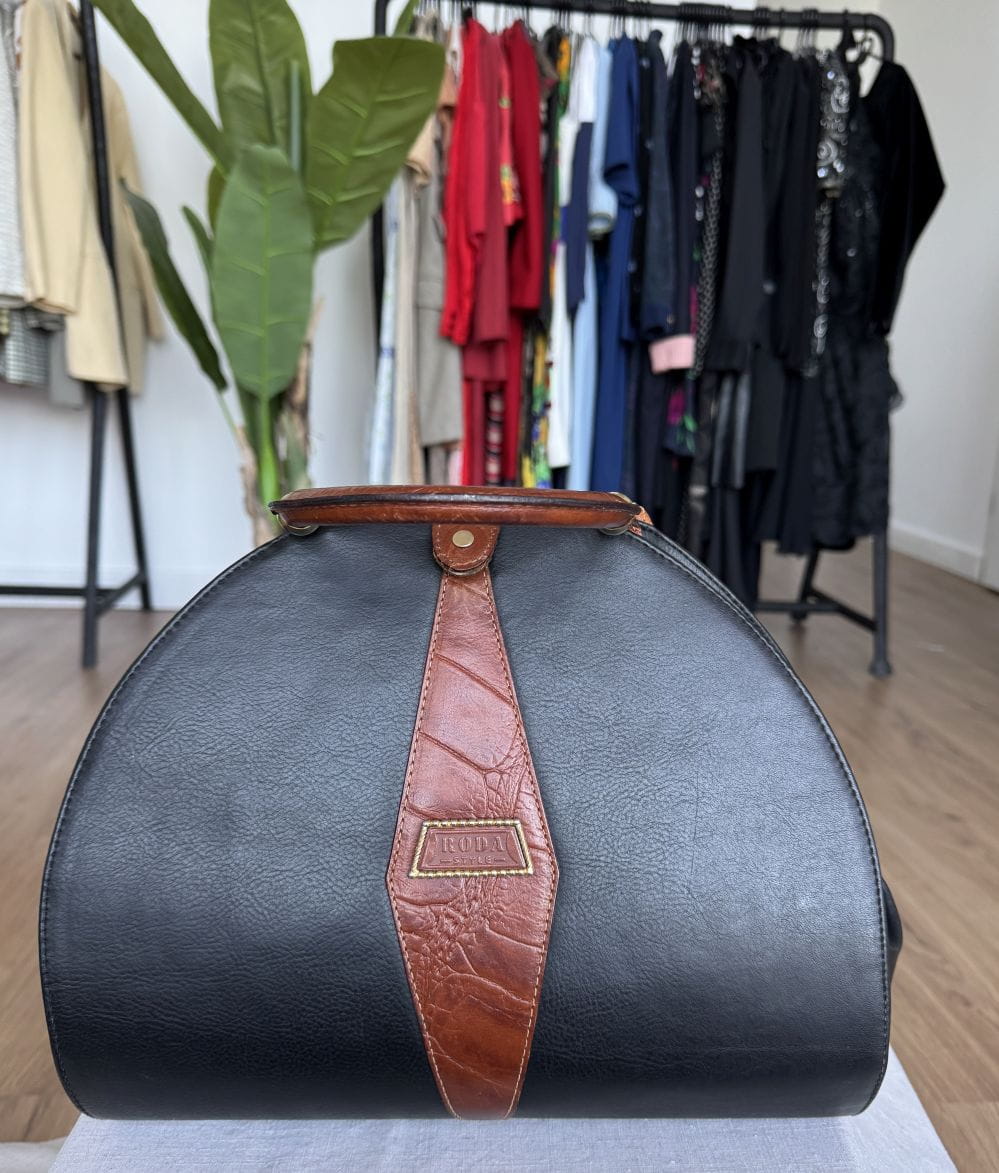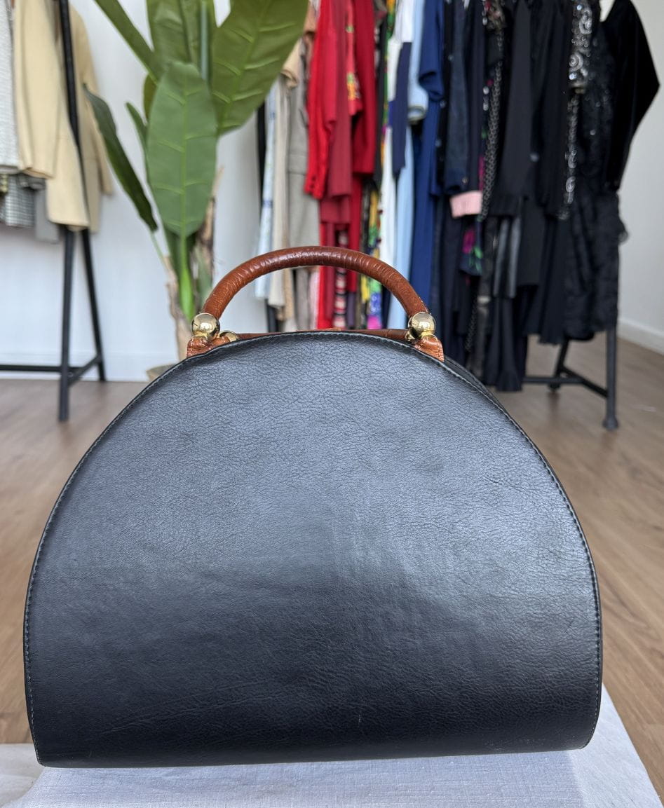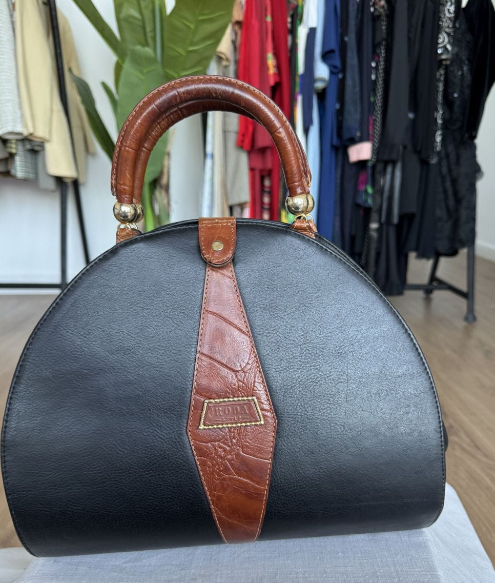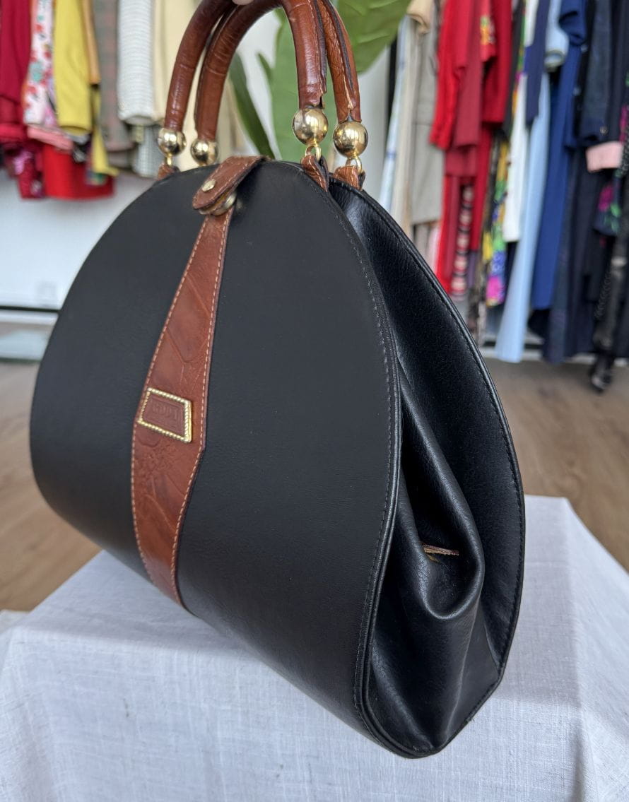 Duża, pojemna sztywna torba, kufer vintage z lat 80-tych o niebanalnym designie. Połączenie skór naturalnych: czarnej licowej, oraz tłoczonej w kolorze brązowym. Zasuwana na zamek i przepinana na zatrzask wewnątrz duża komora, oraz mała zasuwana kieszonka. Bawełniana logowane podszewka. Metalowe okucia w kolorze złota.