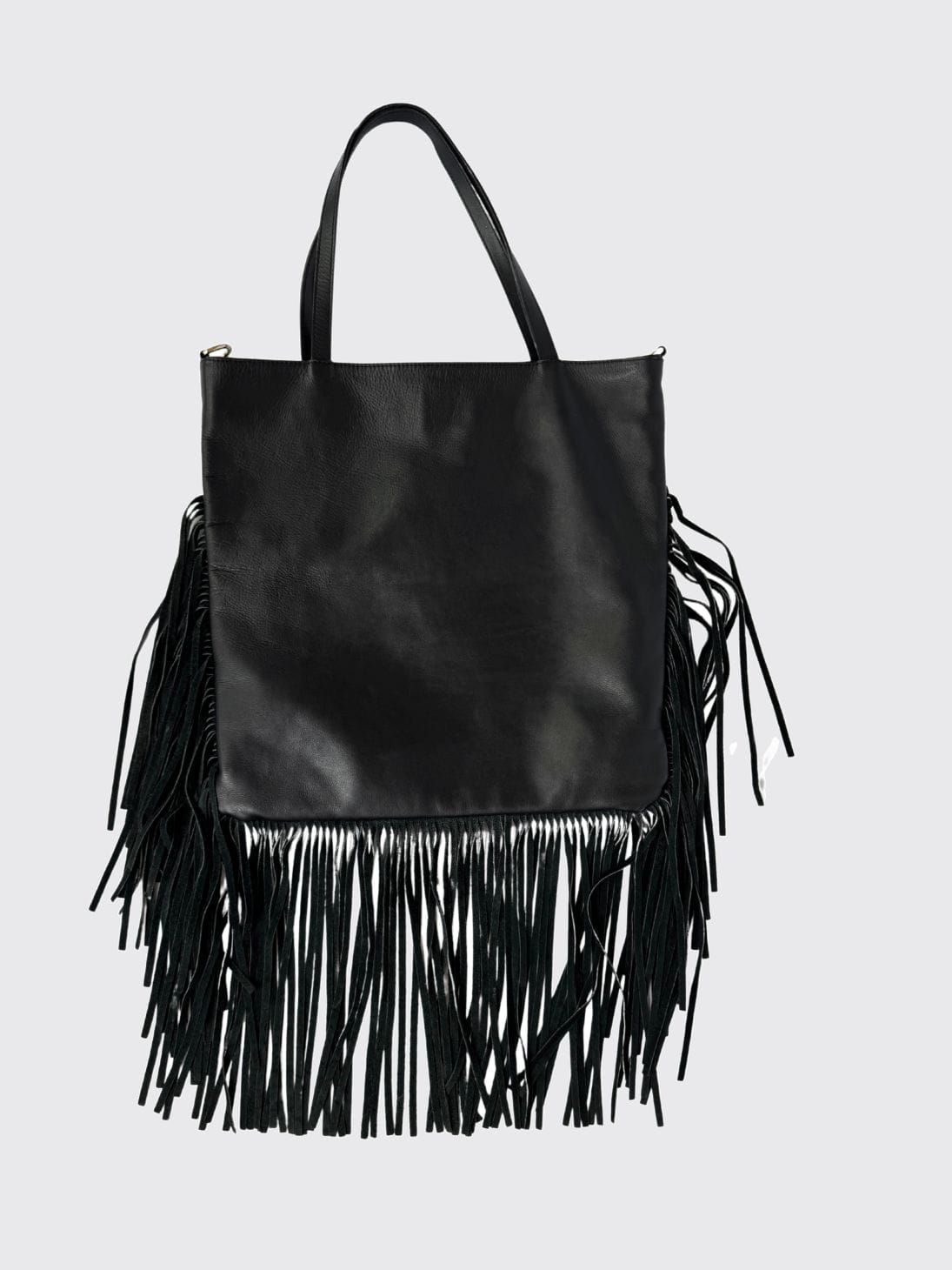 Włoska skórzana torba wykonana z miękkiej naturalnej skóry. Duża, pojemna, mieści format A4. Wykończona długimi zamszowymi frędzlami. Zasuwana na zamek, wewnątrz duża komora i mniejsza przegródki. W komplecie odpinany pasek. Zewnątrz dodatkowa zasuwana kieszeń.