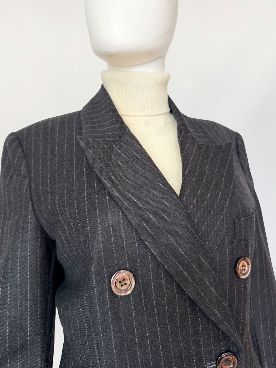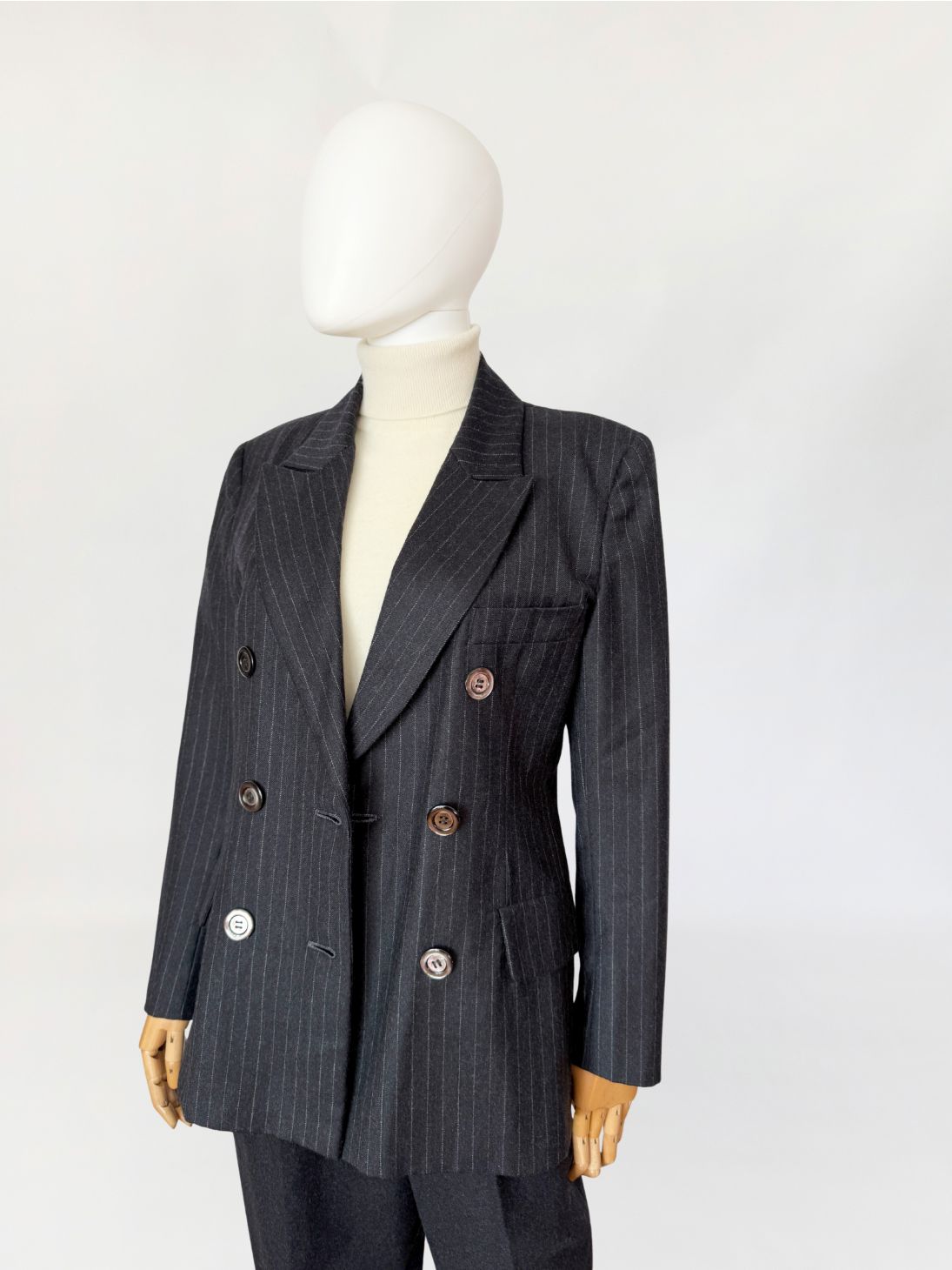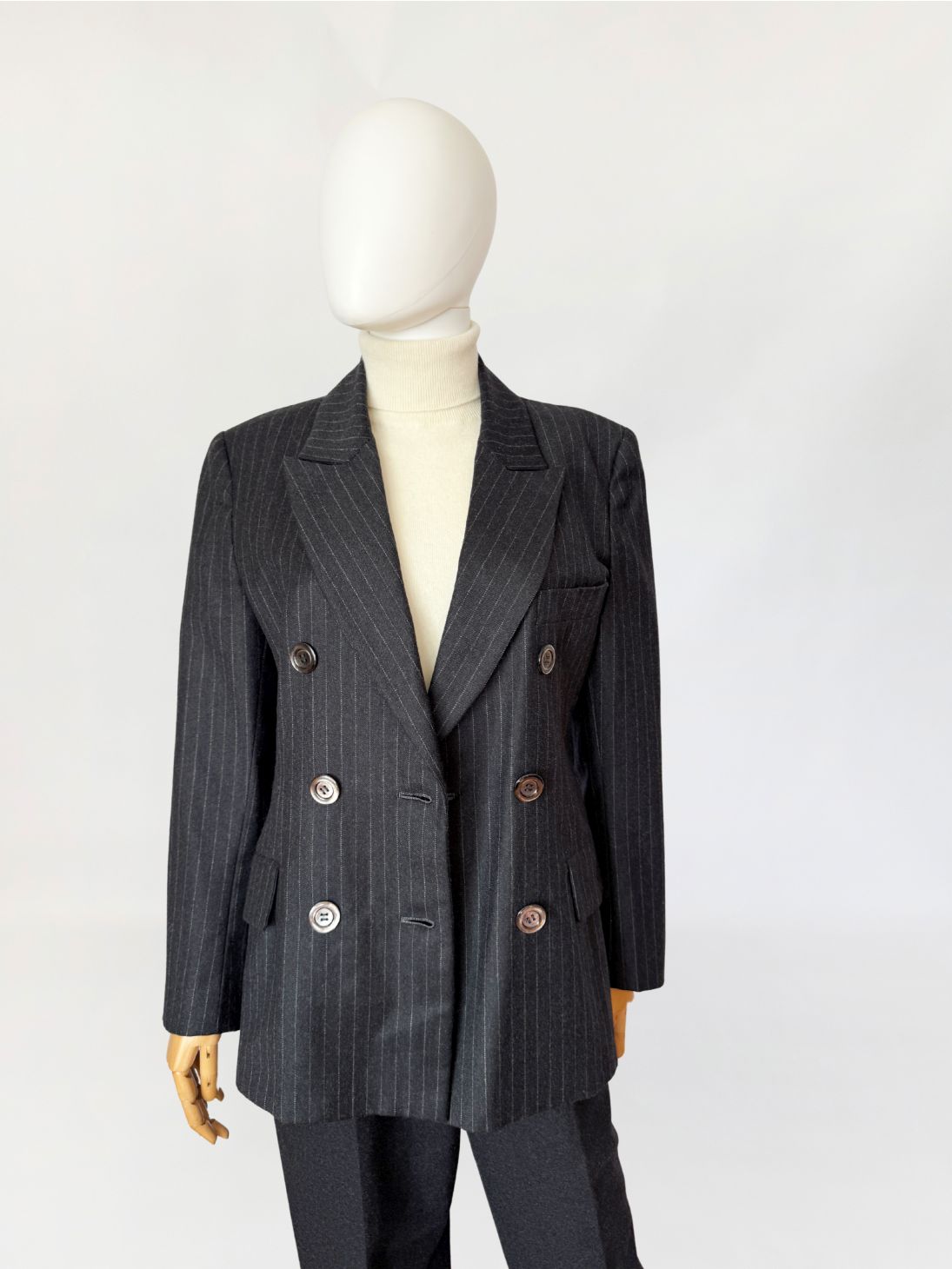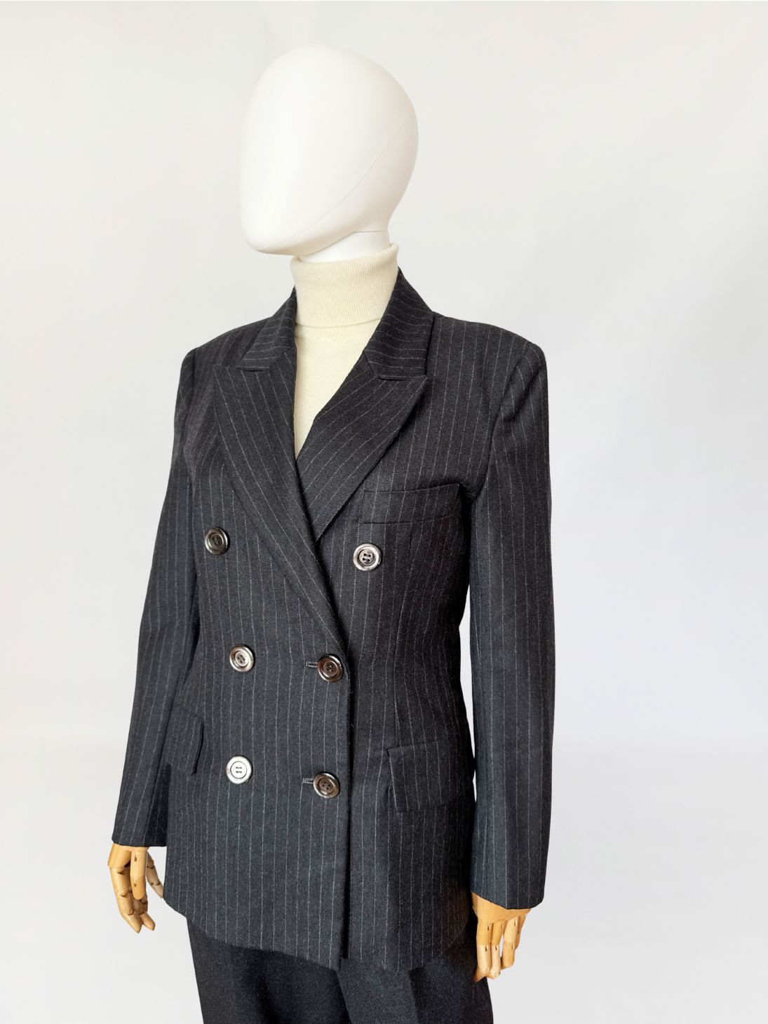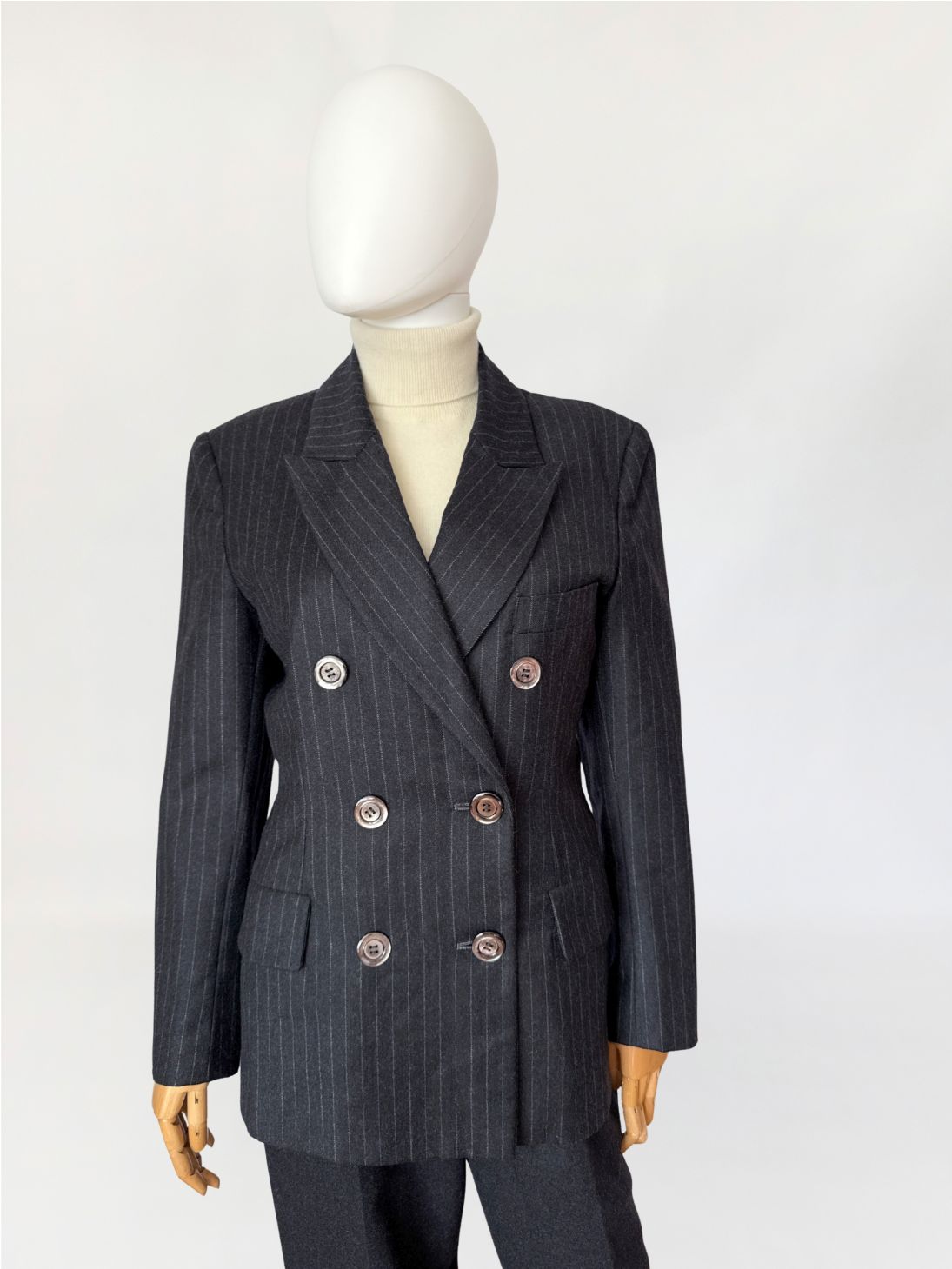 Marynarka vintage wykonana z wełnianej tkaniny w antracytowym odcieniu z subtelnym prążkiem pinstripe. Dwurzędowa dłuższa konstrukcja z wyraźnie zaznaczonymi ramionami i lekko taliowaną linią. Zapinana na sześć dużych guzików o lekkim połysku. W dolnej części kieszenie z klapami, u góry nieduża brustasza. Model łączący w sobie estetykę power dressing lat 80-tych z ponadczasową elegancją klasycznego garnituru.