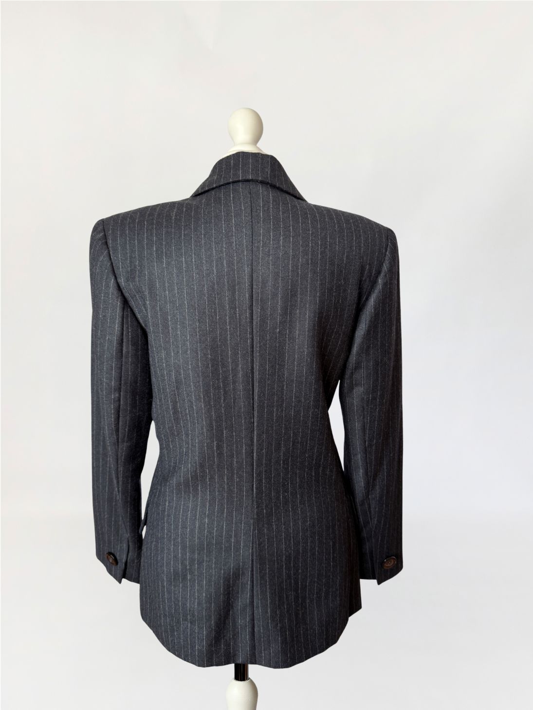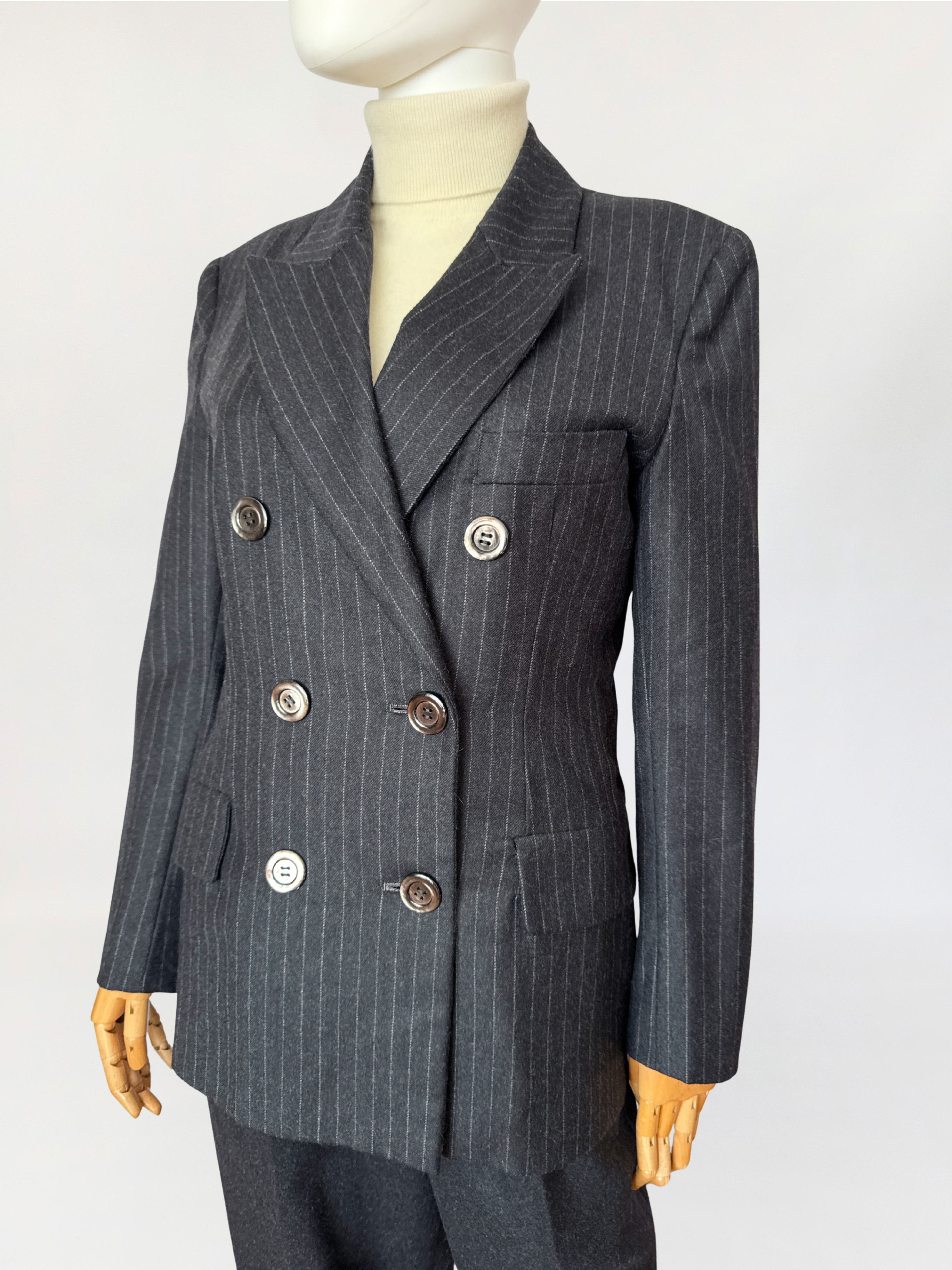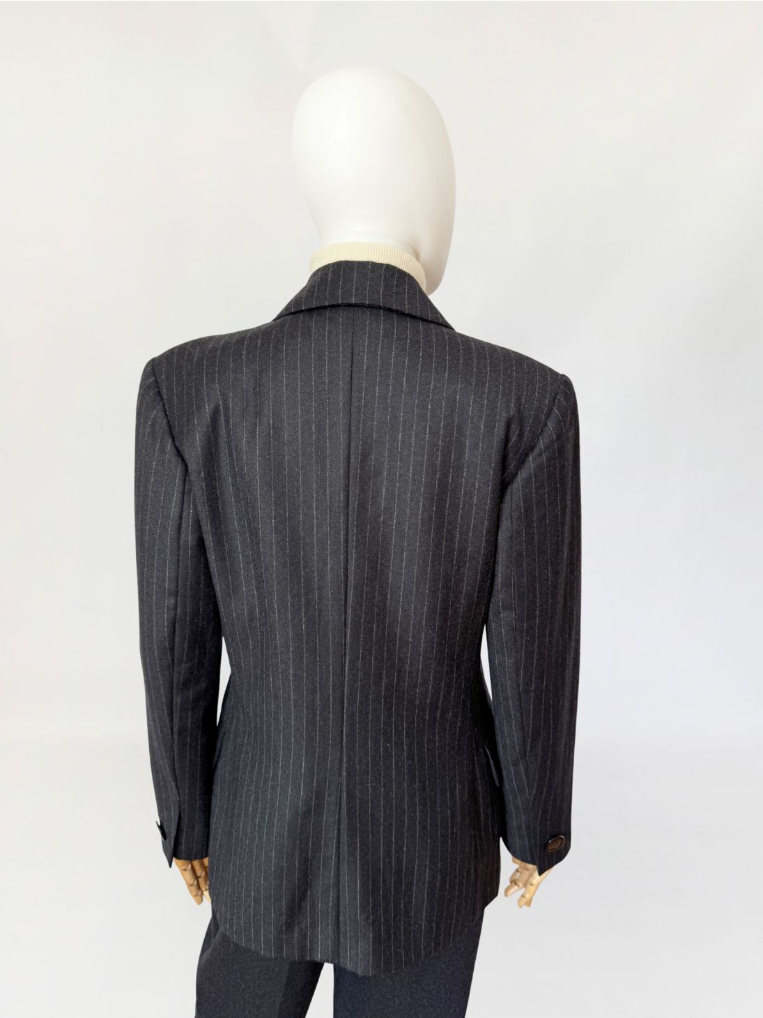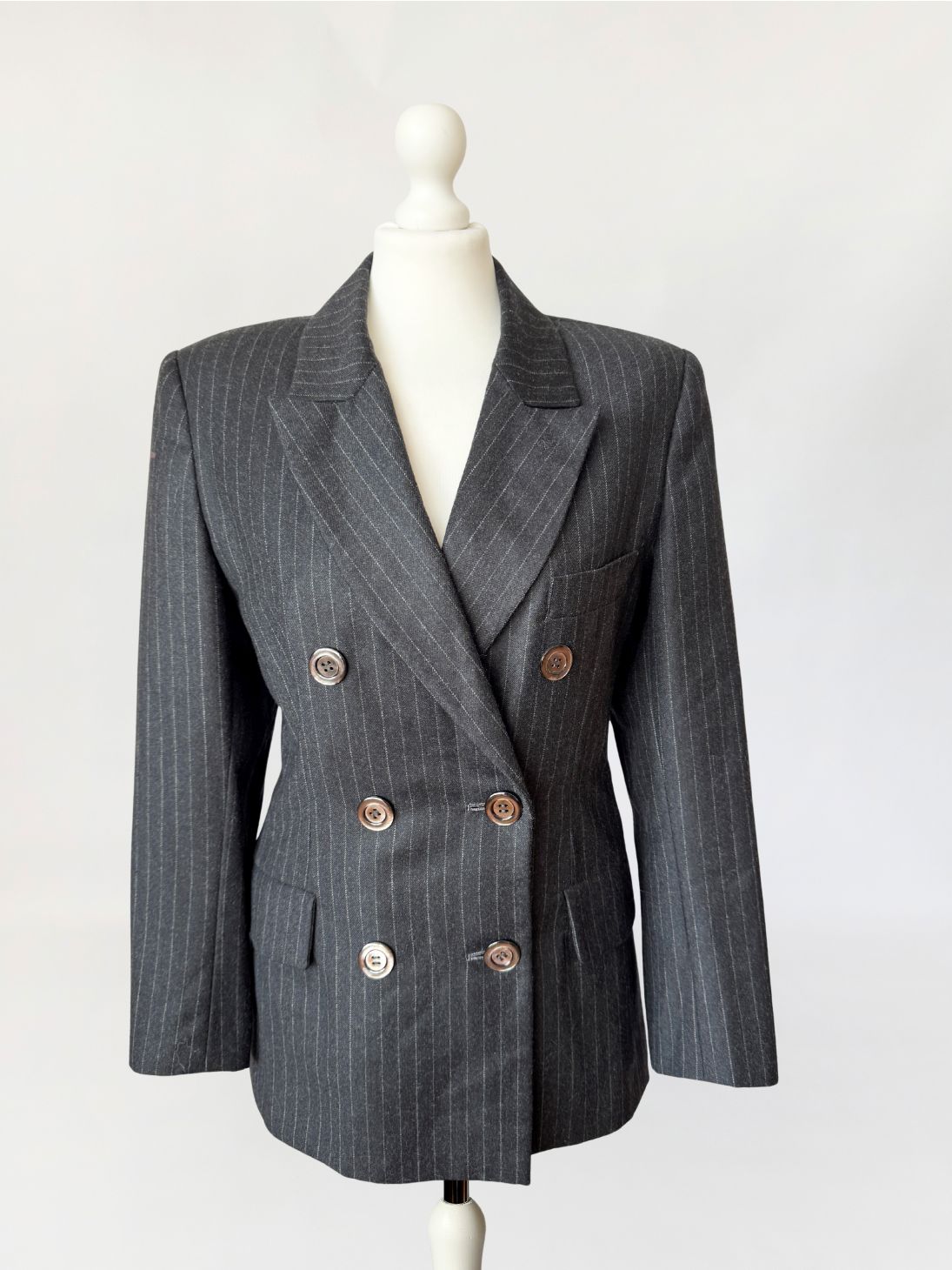 Marynarka vintage wykonana z wełnianej tkaniny w antracytowym odcieniu z subtelnym prążkiem pinstripe. Dwurzędowa dłuższa konstrukcja z wyraźnie zaznaczonymi ramionami i lekko taliowaną linią. Zapinana na sześć dużych guzików o lekkim połysku. W dolnej części kieszenie z klapami, u góry nieduża brustasza. Model łączący w sobie estetykę power dressing lat 80-tych z ponadczasową elegancją klasycznego garnituru.