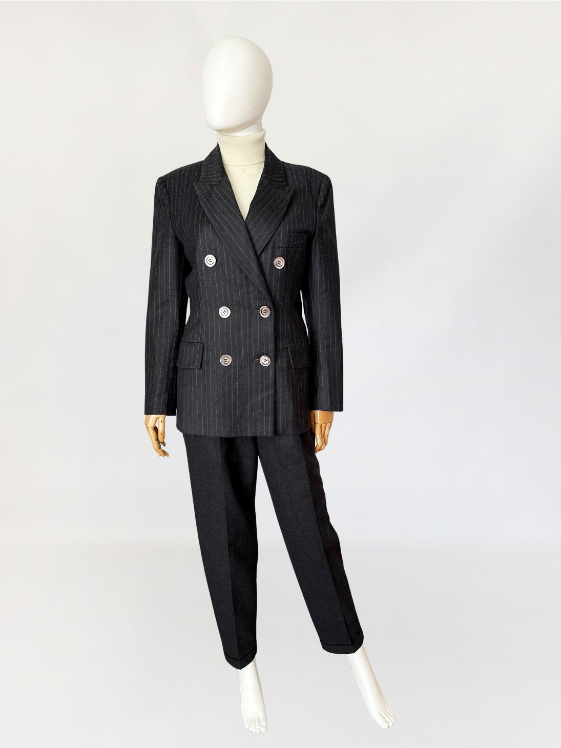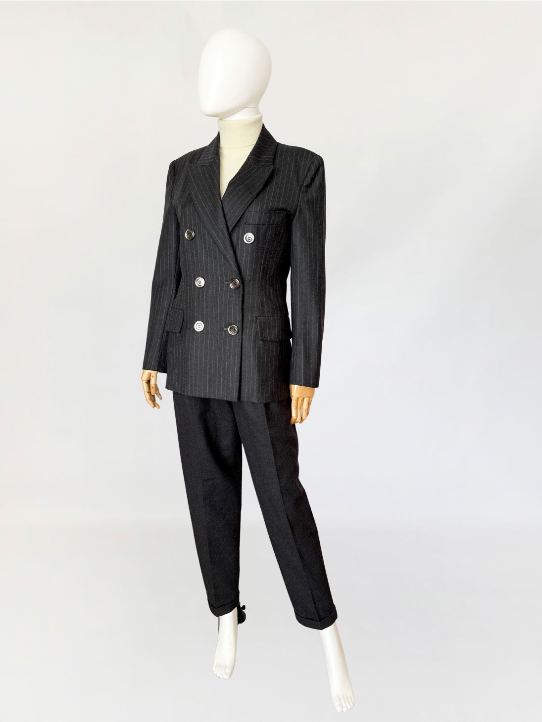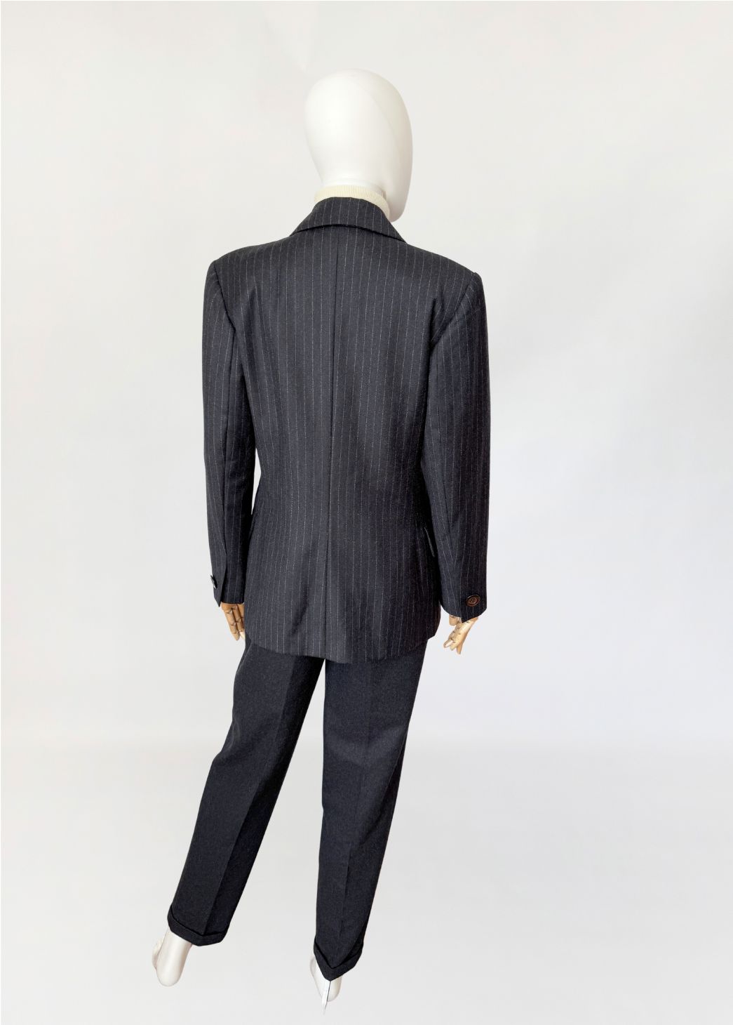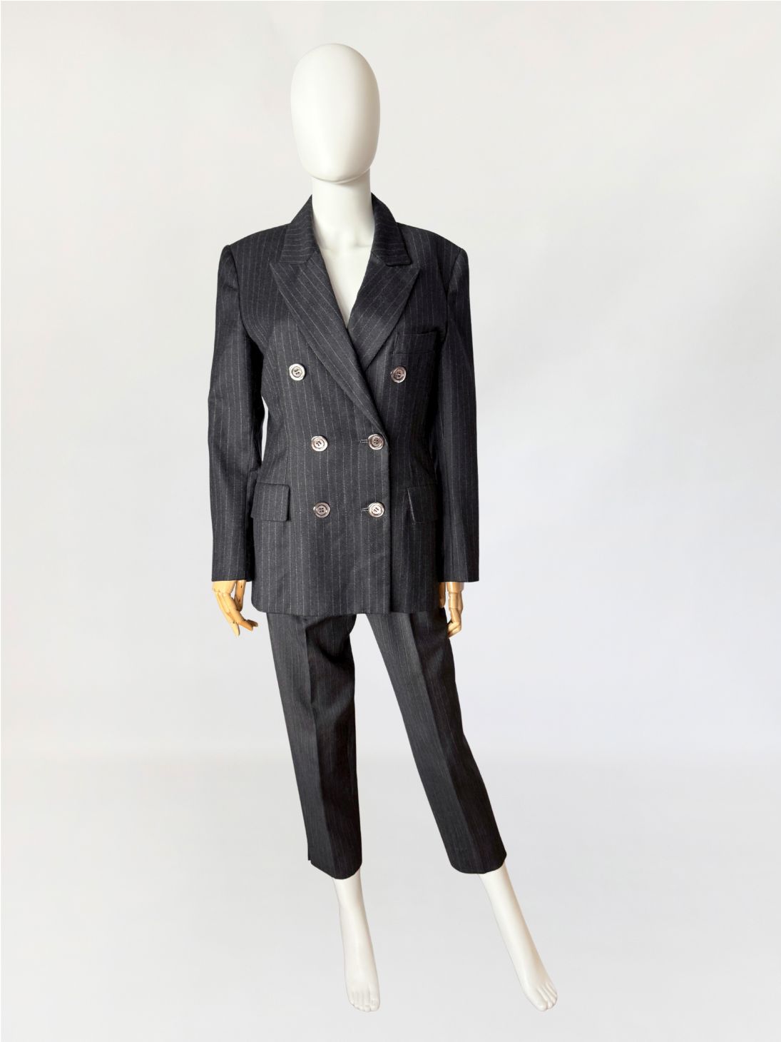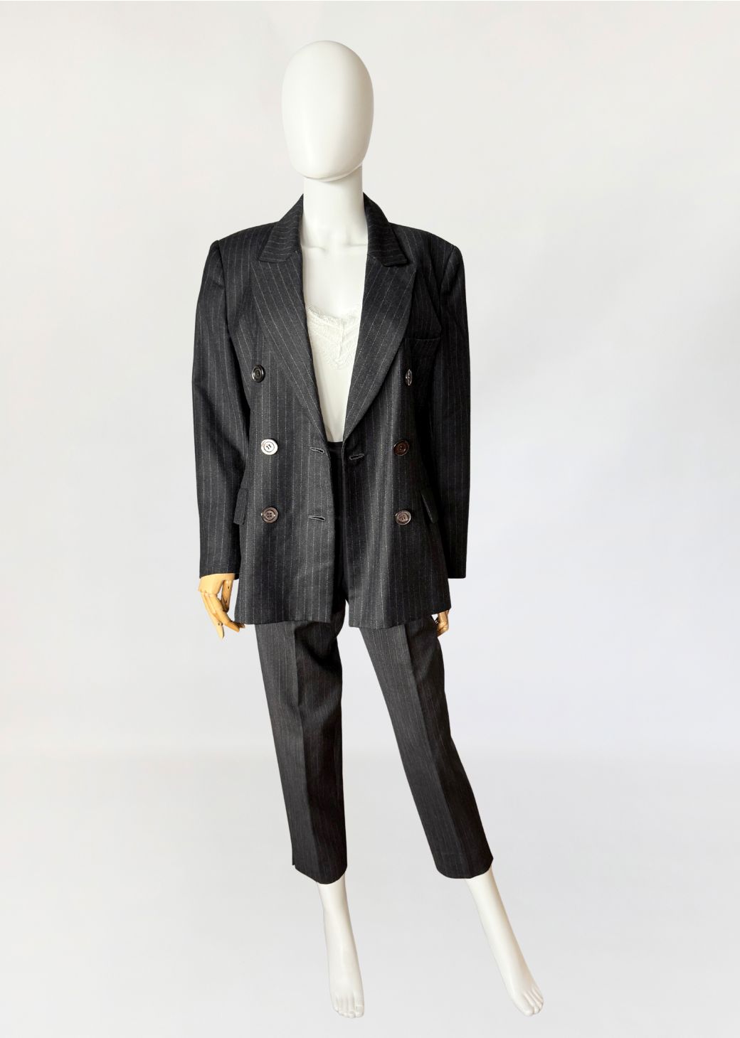 Marynarka vintage wykonana z wełnianej tkaniny w antracytowym odcieniu z subtelnym prążkiem pinstripe. Dwurzędowa dłuższa konstrukcja z wyraźnie zaznaczonymi ramionami i lekko taliowaną linią. Zapinana na sześć dużych guzików o lekkim połysku. W dolnej części kieszenie z klapami, u góry nieduża brustasza. Model łączący w sobie estetykę power dressing lat 80-tych z ponadczasową elegancją klasycznego garnituru.