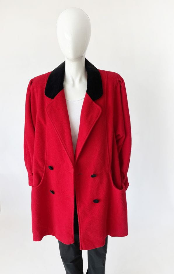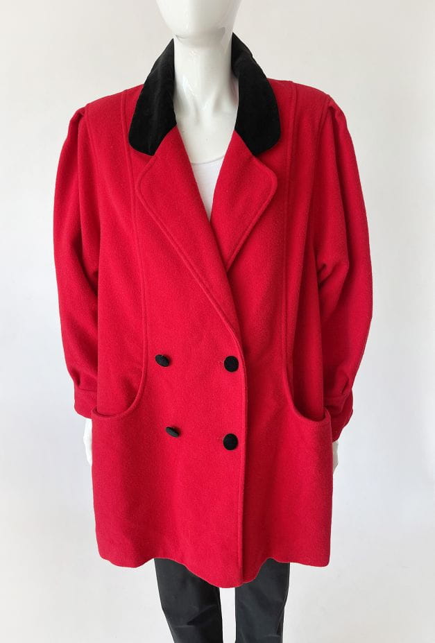 Płaszcz vintage wykonany z wysokiej jakości dzianiny z przewagą wełny. Oversizowy, dwurzędowy fason. Rękawy długie, szerokie w ramionach. Kontrastowy czarny kołnierzyk. U dołu duże kieszenie.