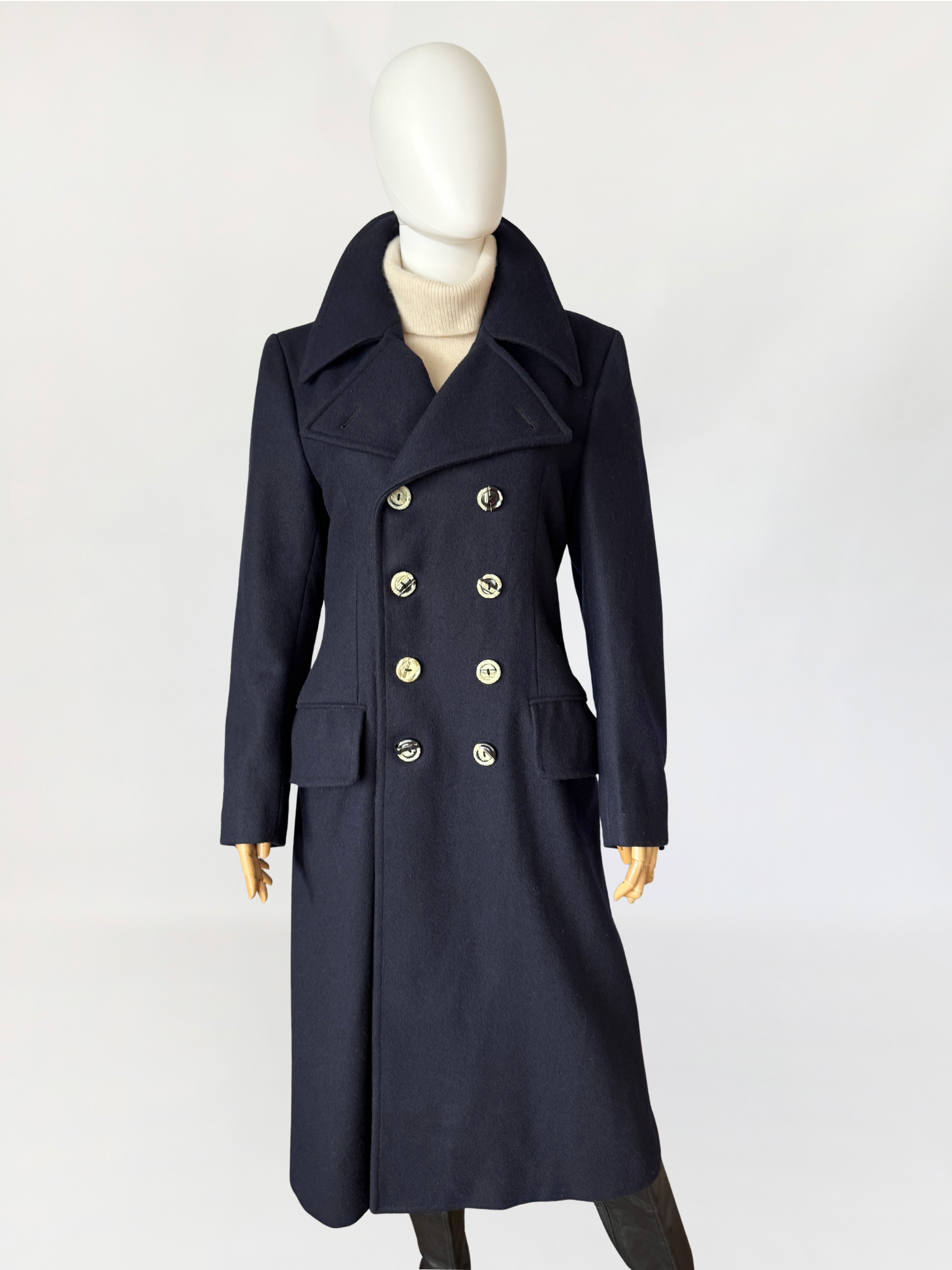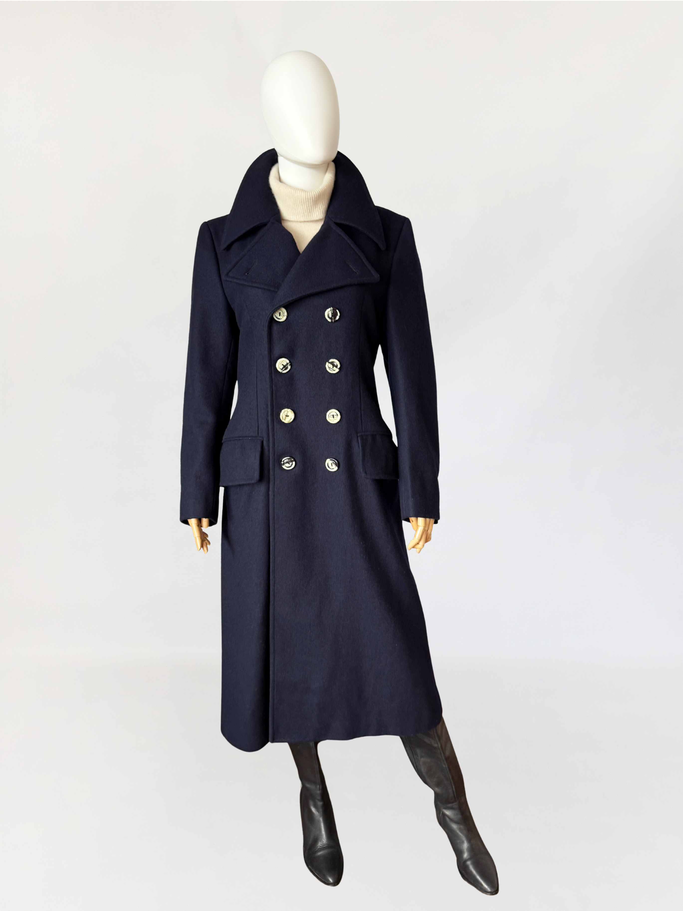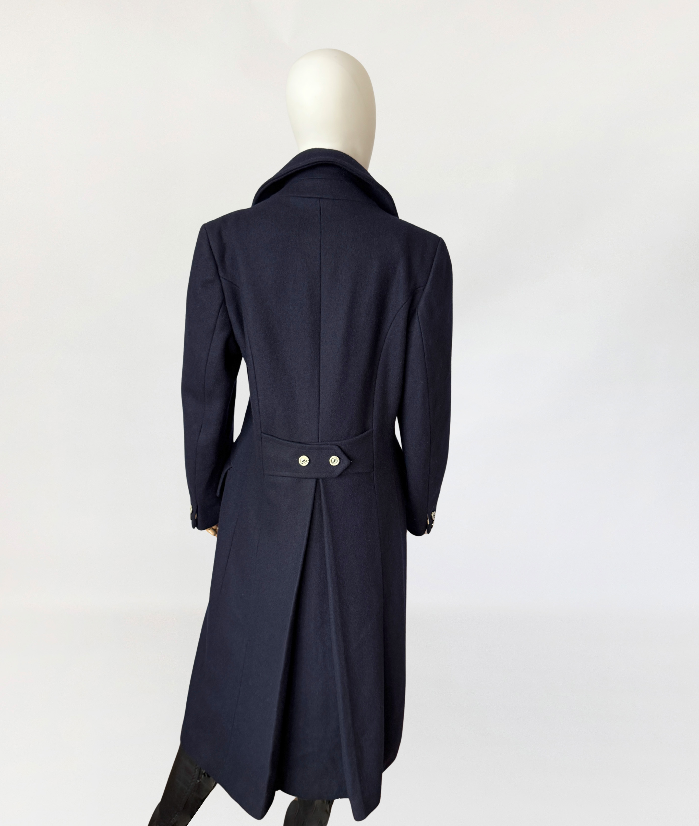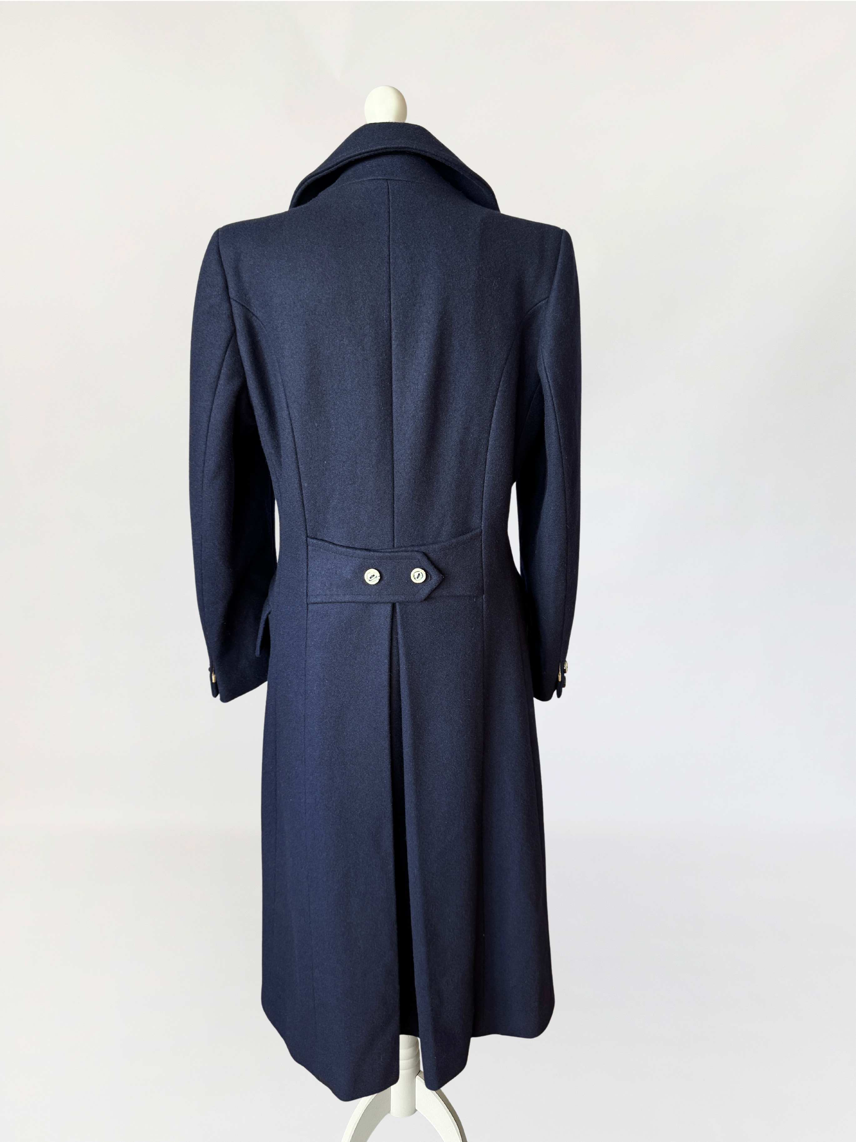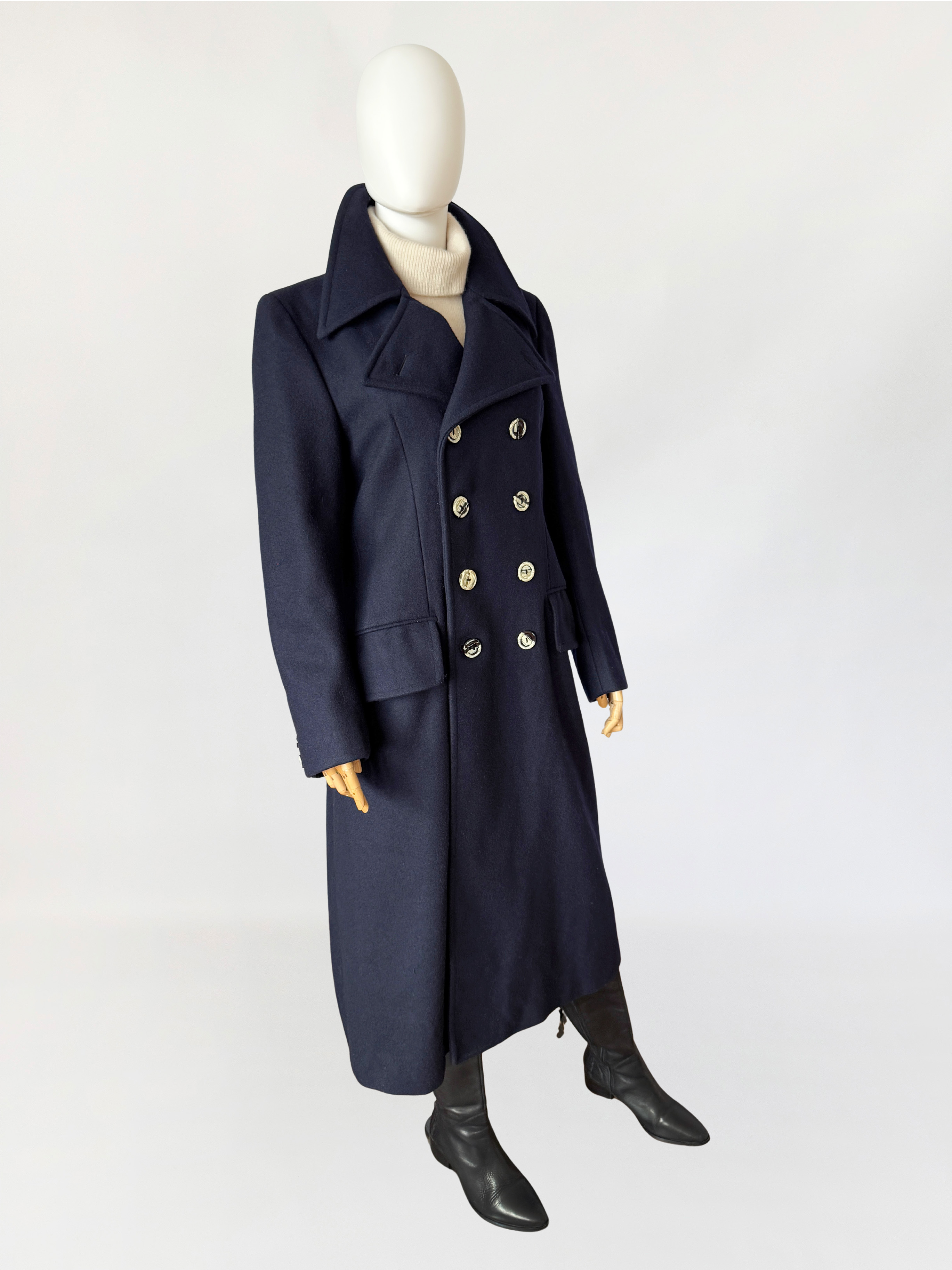 Długi dwurzędowy płaszcz vintage wykonany z masywnej, zwartej wełny o wysokiej gramaturze. Tkanina w kolorze głębokiego granatu, o matowej, jednorodnej powierzchni. Fason inspirowany krojem oficerskim: szerokie, wyraźnie zarysowane klapy, mocno dopasowana linia ramion, podkreślona talia, długość sięgająca połowy łydki. Front zapinany na sześć dużych guzików. Kieszenie z patkami umieszczone symetrycznie na wysokości bioder. Rękawy klasycznie wszywane, zakończone mankietami z małymi guzikami dekoracyjnymi. Ramiona doskonale wyprofilowane, usztywnione. Tył z głęboką kontrafałdą oraz panelem zapinanym na dwa guziki. Płaszcz jest ciężki, dobrze trzyma formę i zapewnia wysoki poziom izolacji termicznej.